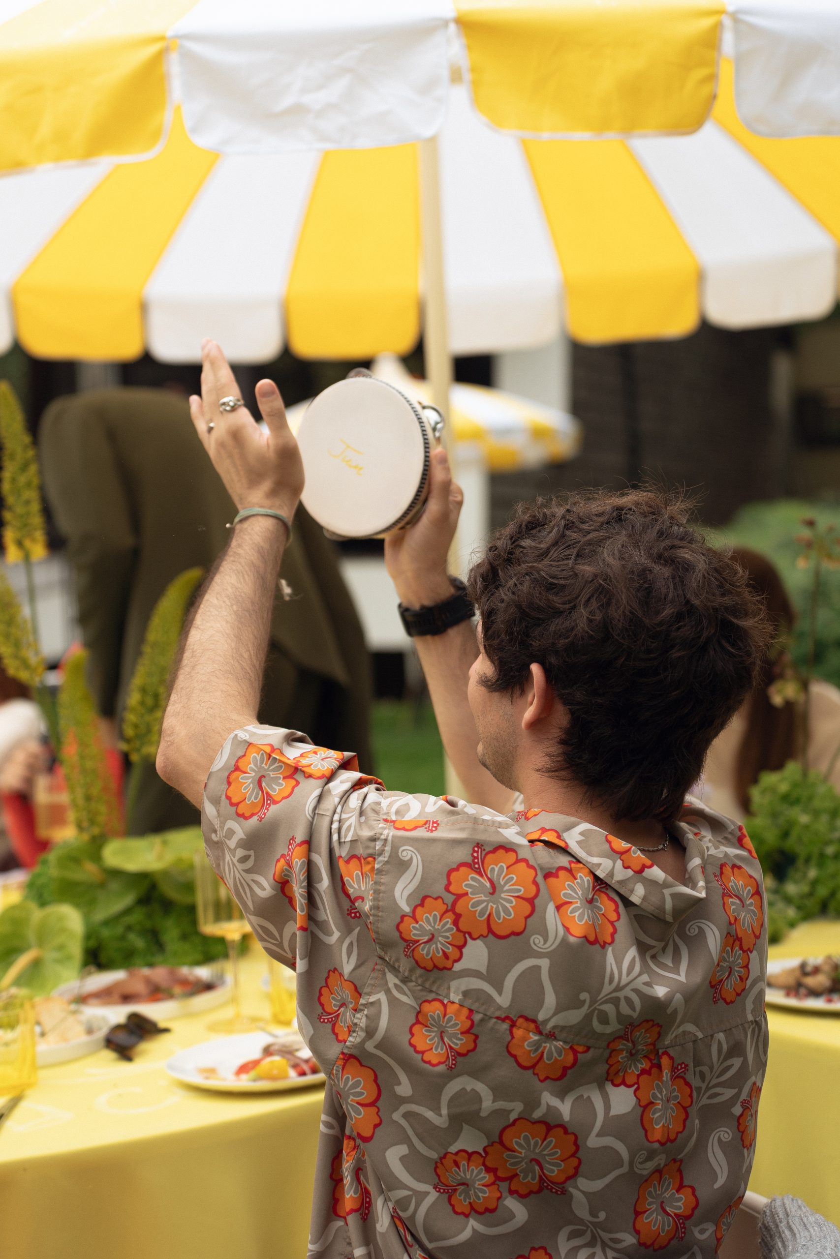 На итальянских свадьбах очень часто на выход молодожёнов используются бубны или платки. Владлена и Антон решили, что бубны – отличная идея, чтобы задать тон празднику и сделать его шумным. Для каждого гостя сделали именной инструмент, благодаря чему они ещё и выполняли роль карточек для рассадки.