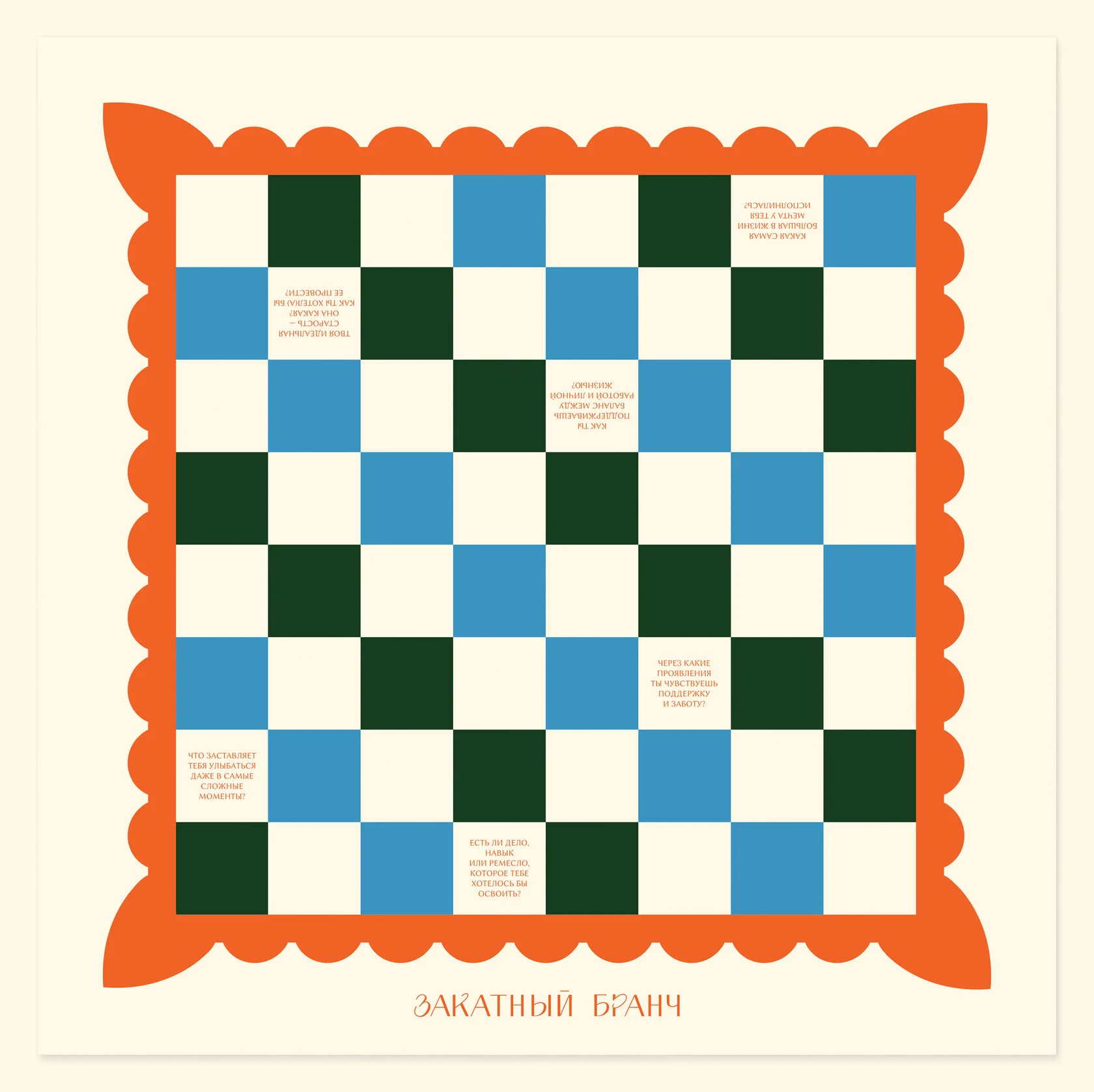 Подсмотрели эту идею у наших участников — ребят из «Закатного бранча«. Узор платка вдохновлён шашками и лёгкими беседами. Платок можно расстелить в любом месте и играть в шашки чем захочется, например — камешками и ягодами. Некоторые клетки содержат вопросы о жизни: шагните на такую и разговор начнёт течь сам собой.