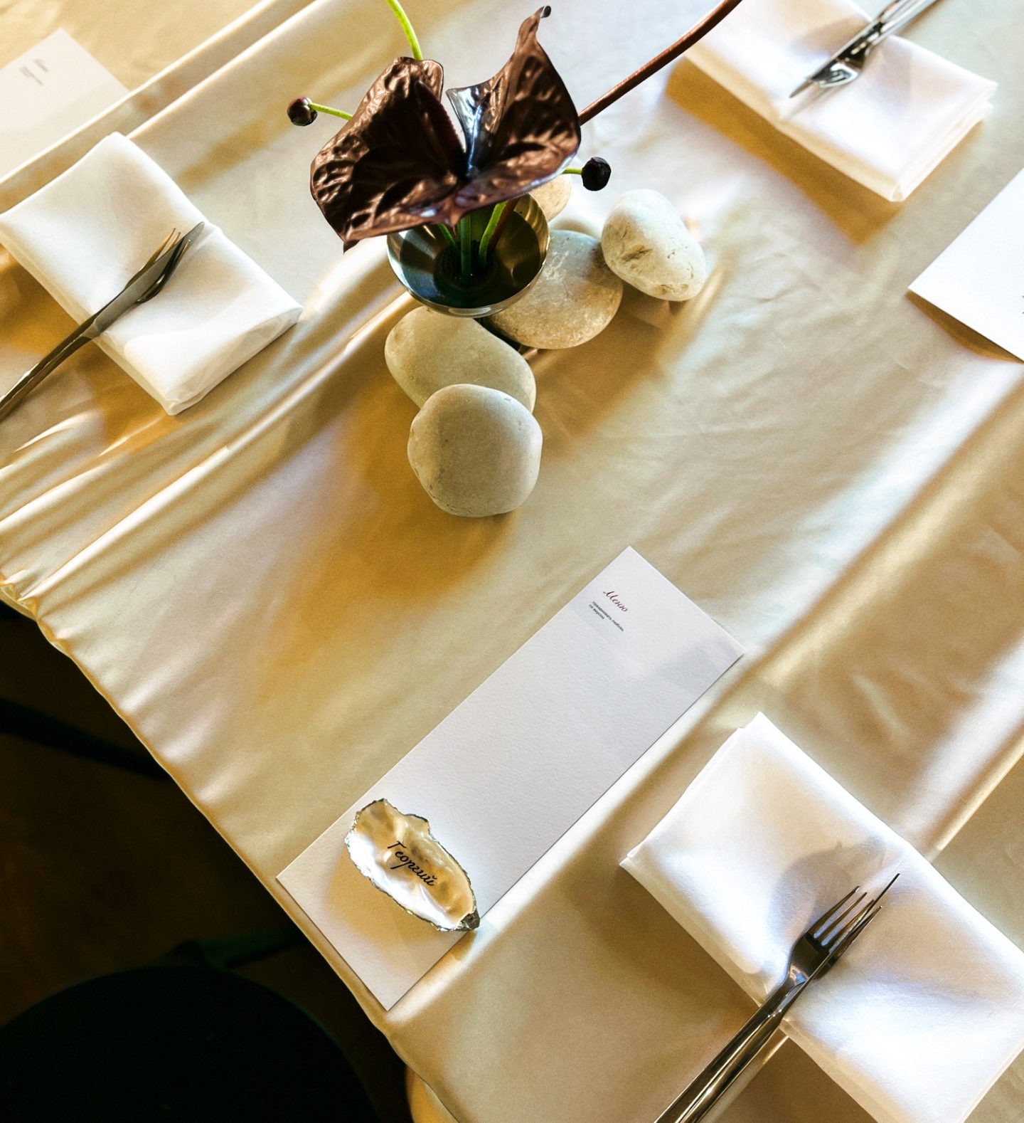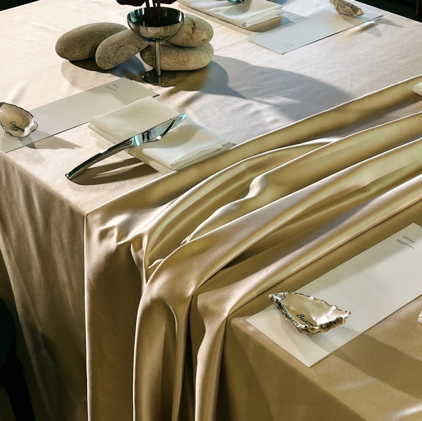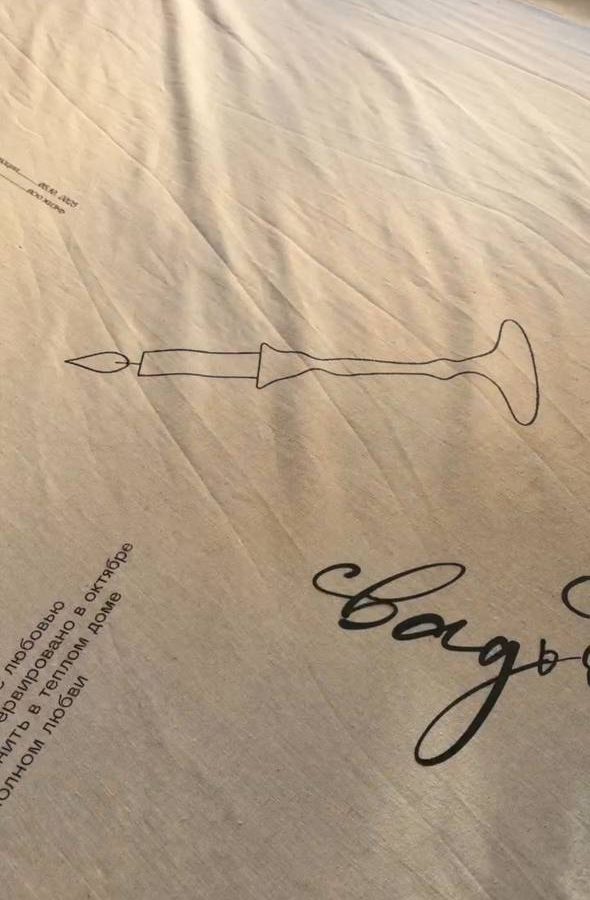 На скатерти можно разместить историю вашего знакомства, сделать точную рассадку гостей, написать цитаты о любви или другие элементы, которые будут служить отражением вашего дня. И бонусом у вас останется памятная вещь со свадьбы.