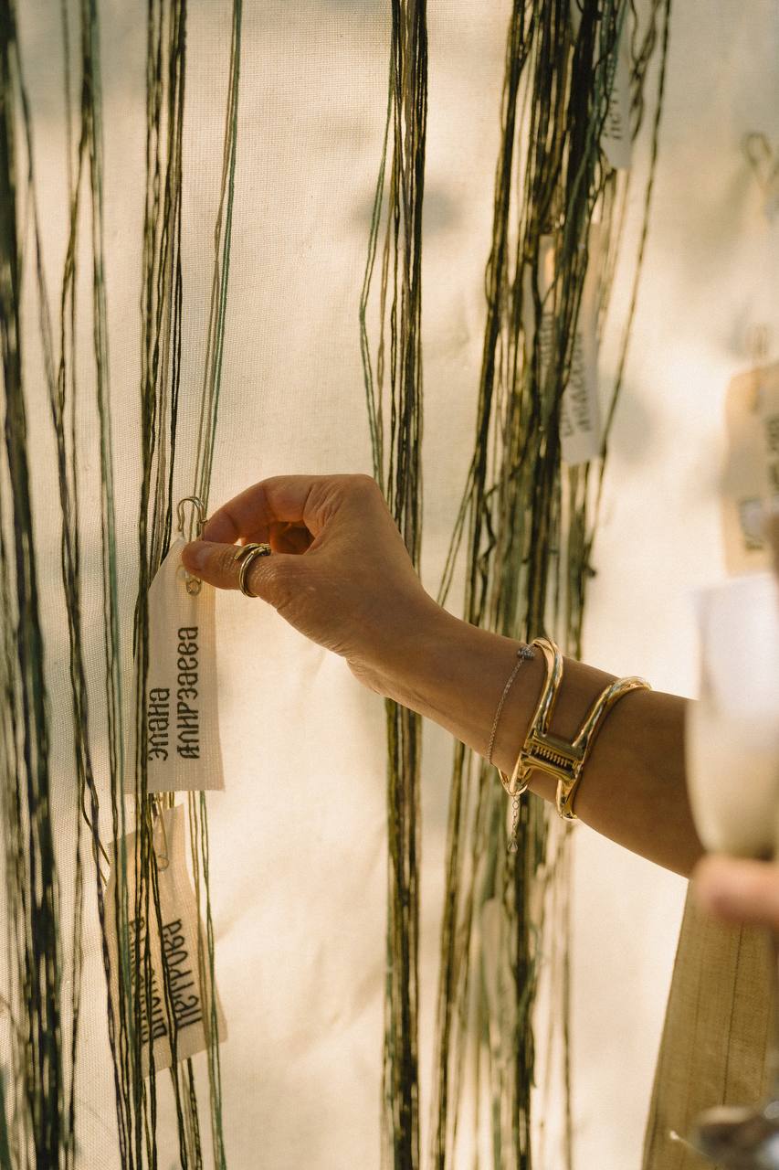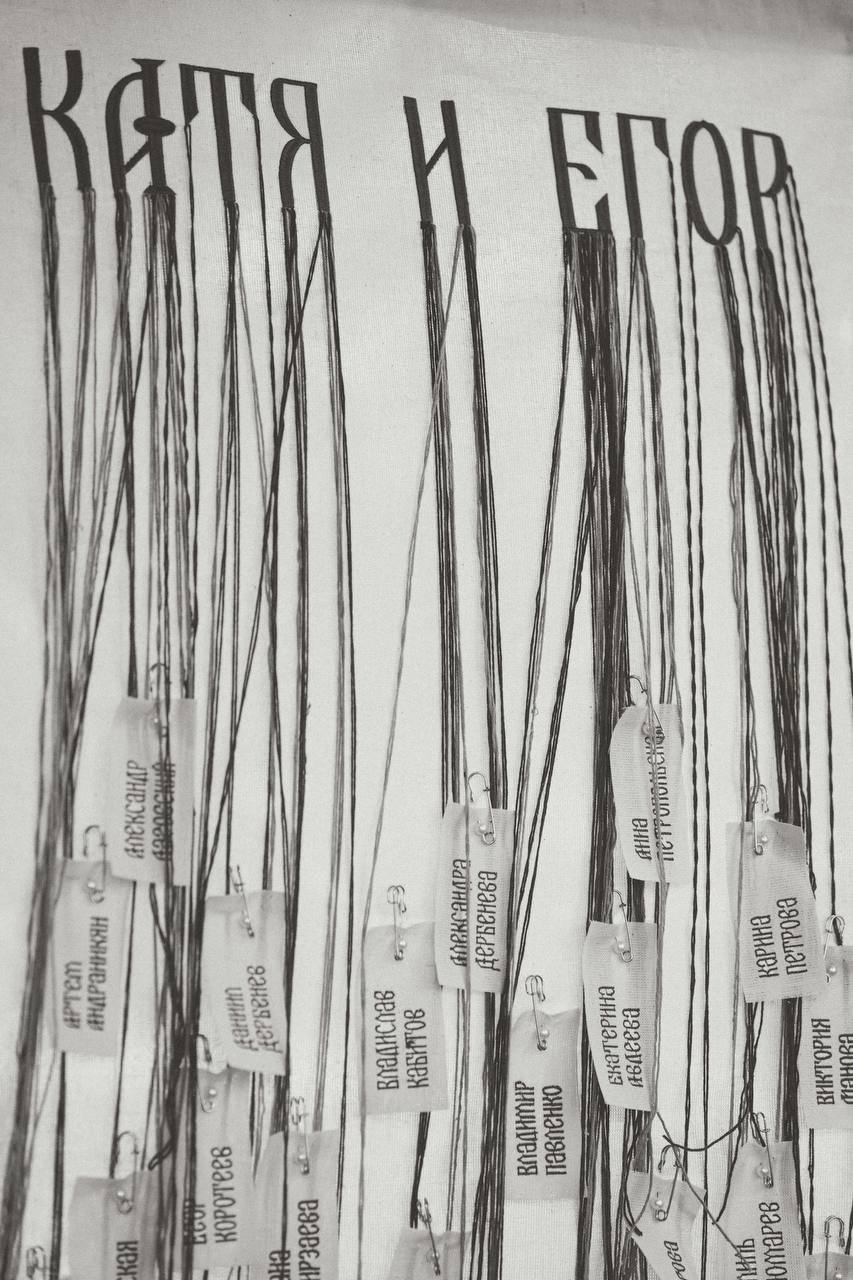 Поэтому они придумали ниточки, которые шли от их имён и символически соединяли всех гостей. Каждый смог не только физически почувствовать, как связан с молодожёнами в этот день, но и забрать на память бирку-брошь со своим именем.