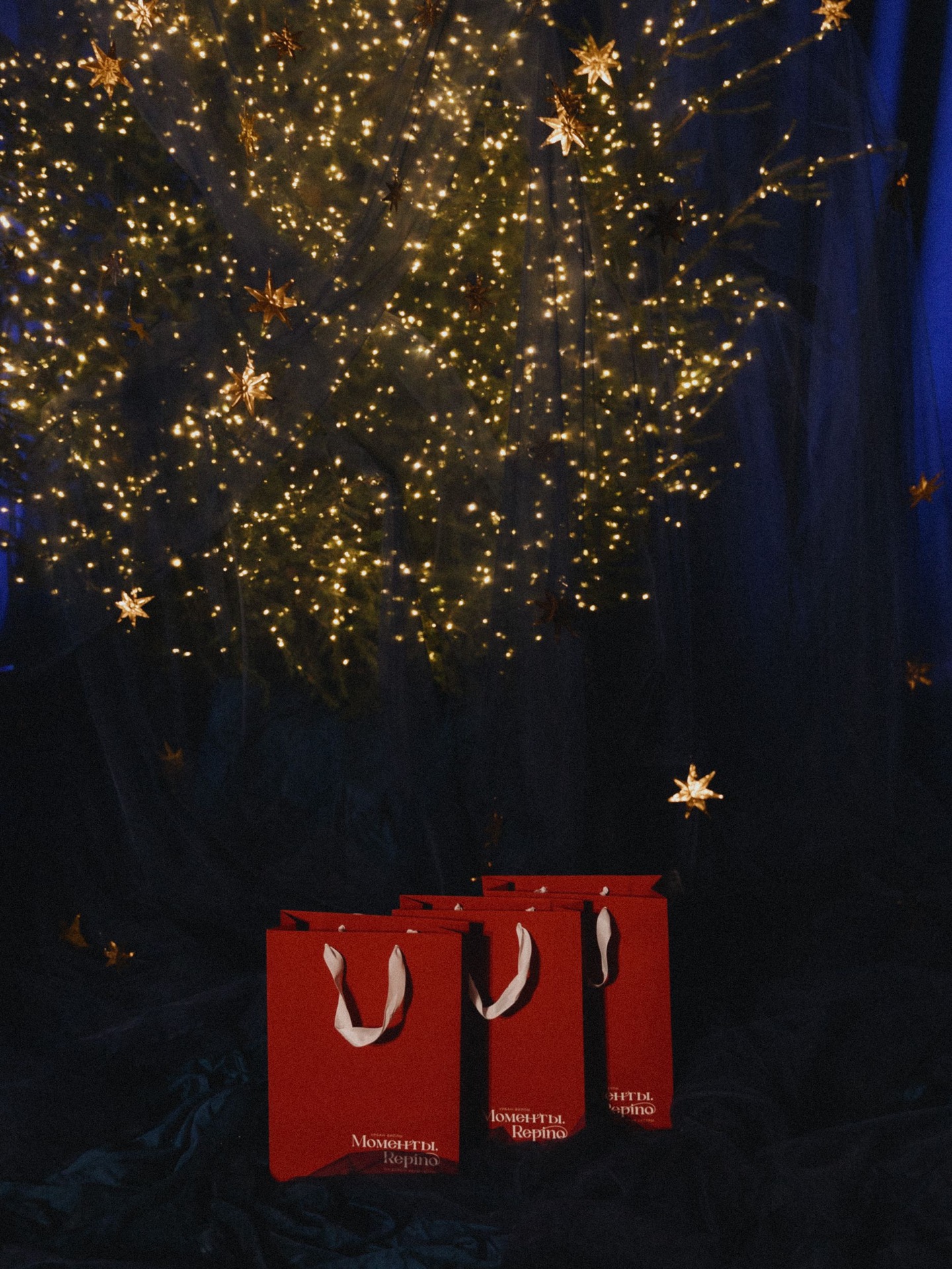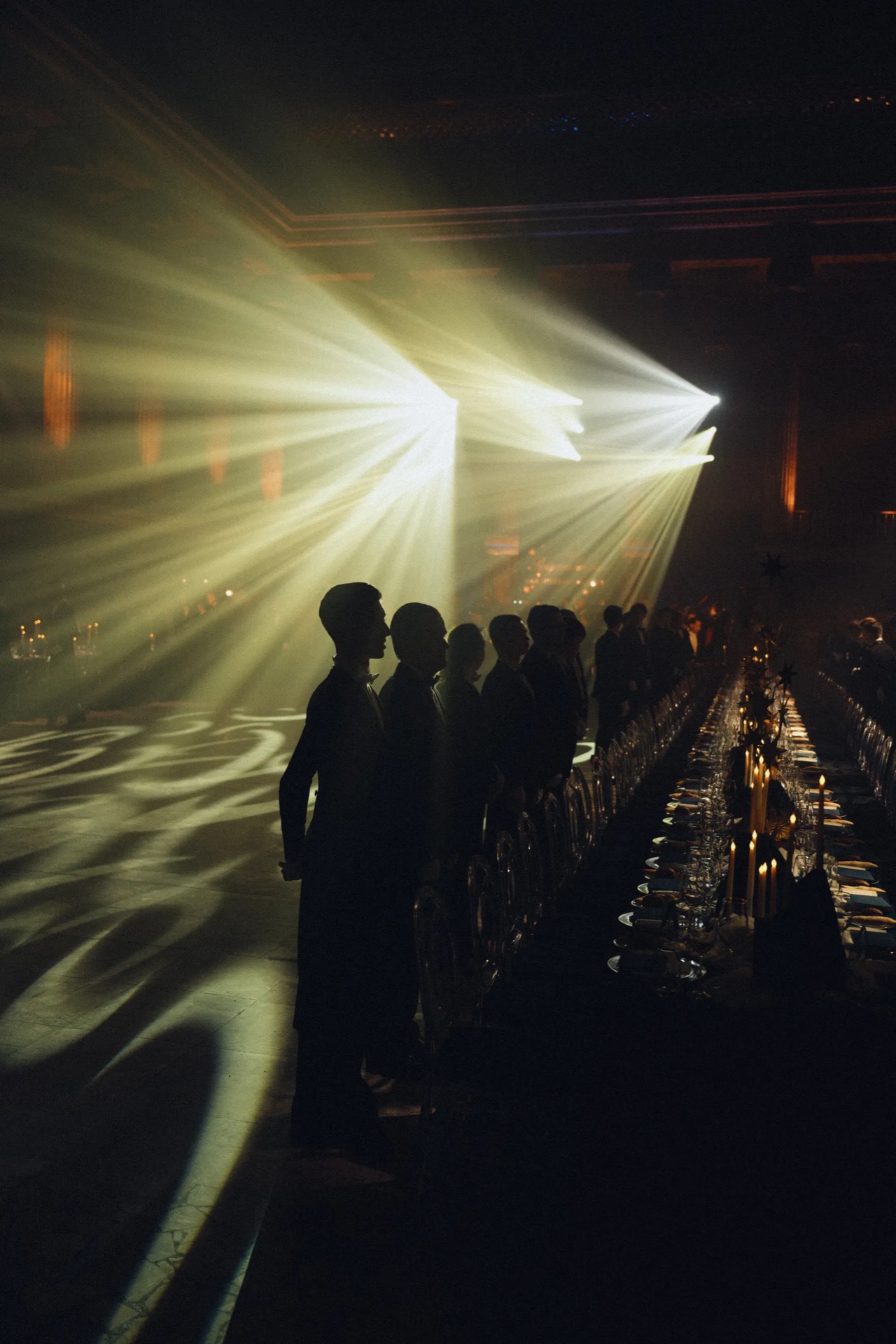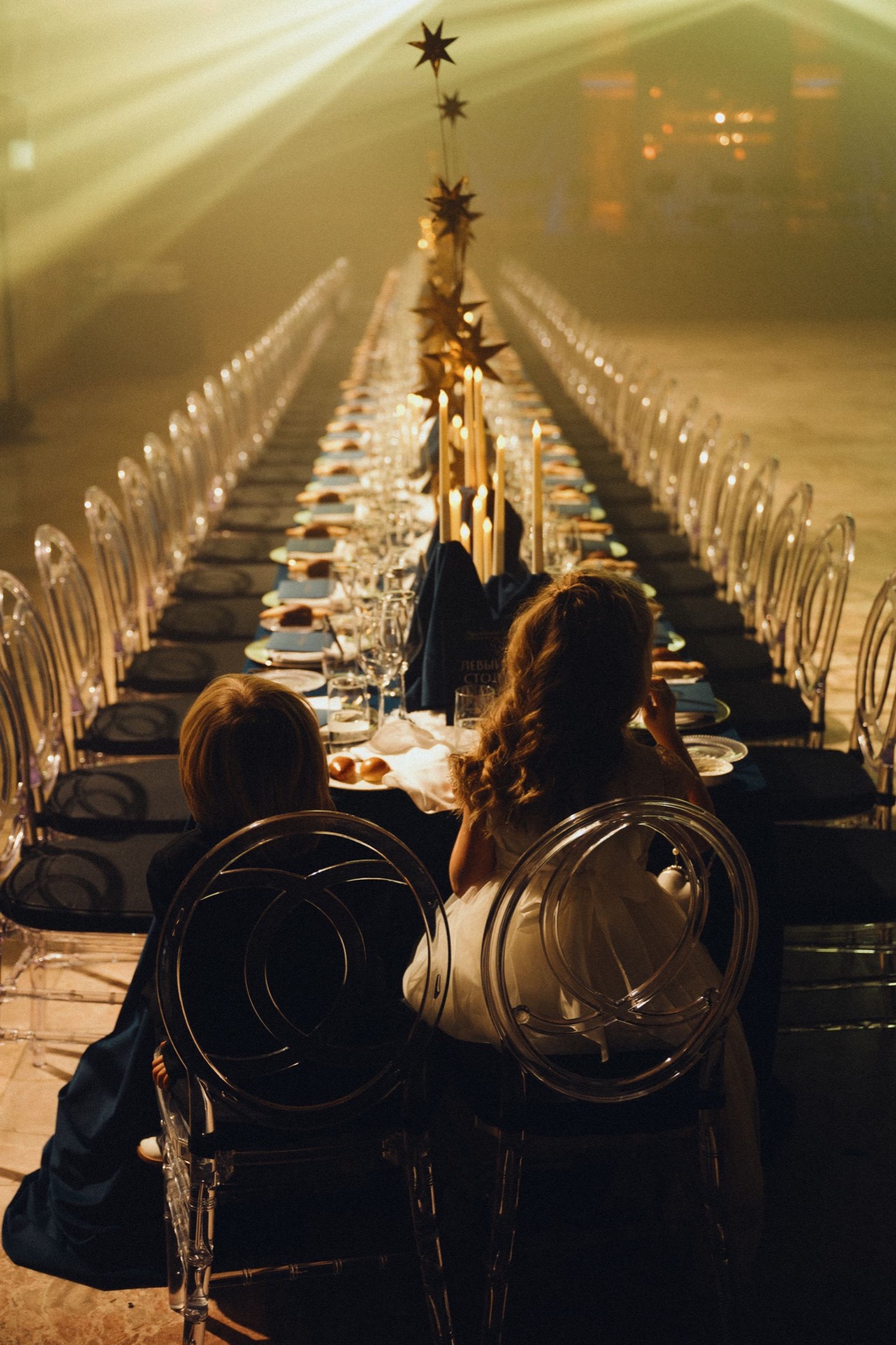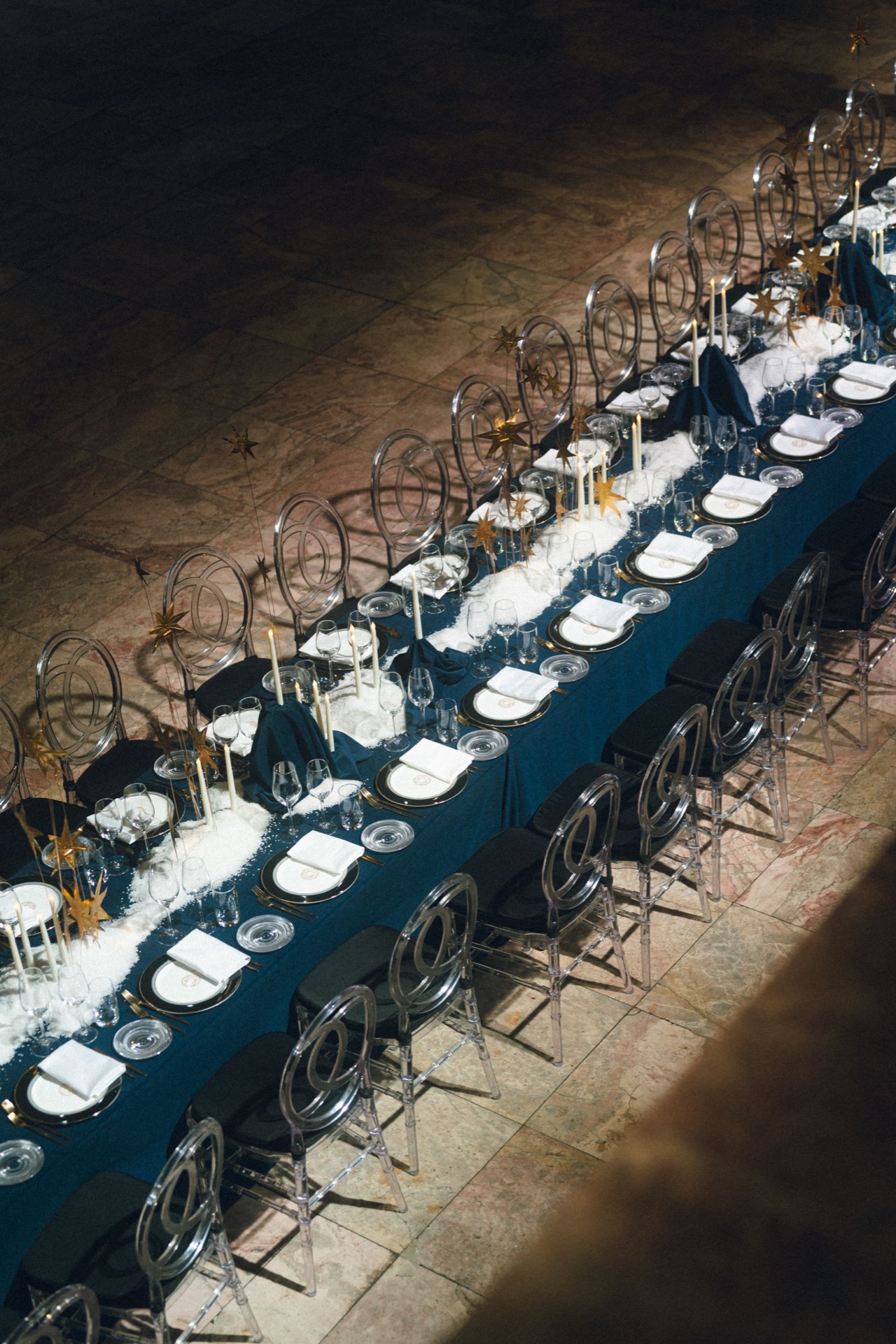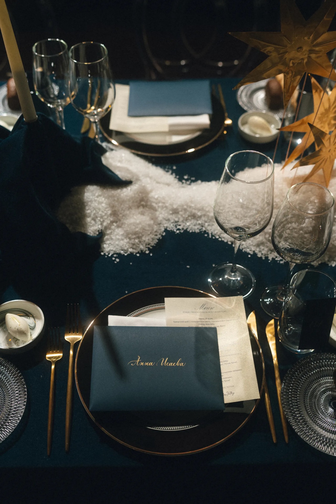 Визуальная часть бала была продумана до мелочей. Синие бархатные скатерти на столах создавали эффект ночного неба с сияющими золотыми звёздами из фольги, вручную выполненными декораторами Boho Decor. Столы словно были припорошены снегом, для этого использовали соль, закупленную в объёме более двухсот килограммов.