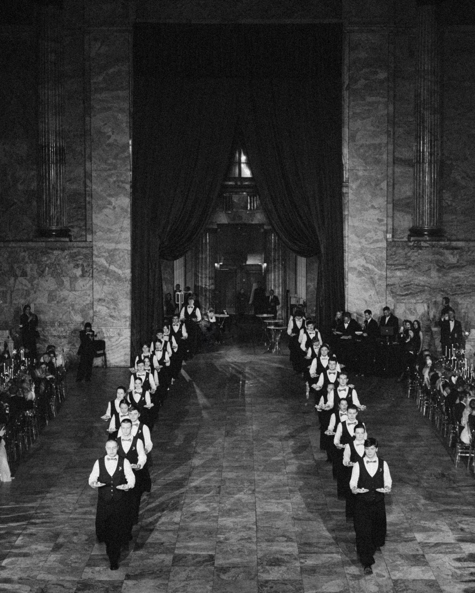 Перед официальным открытием бала в аванзале погас свет, и зазвучал закадровый голос хозяйки вечера Ольги Малиновской. После этого шторы в основной зал открылись, и гости увидели волшебный декор Мраморного зала.
