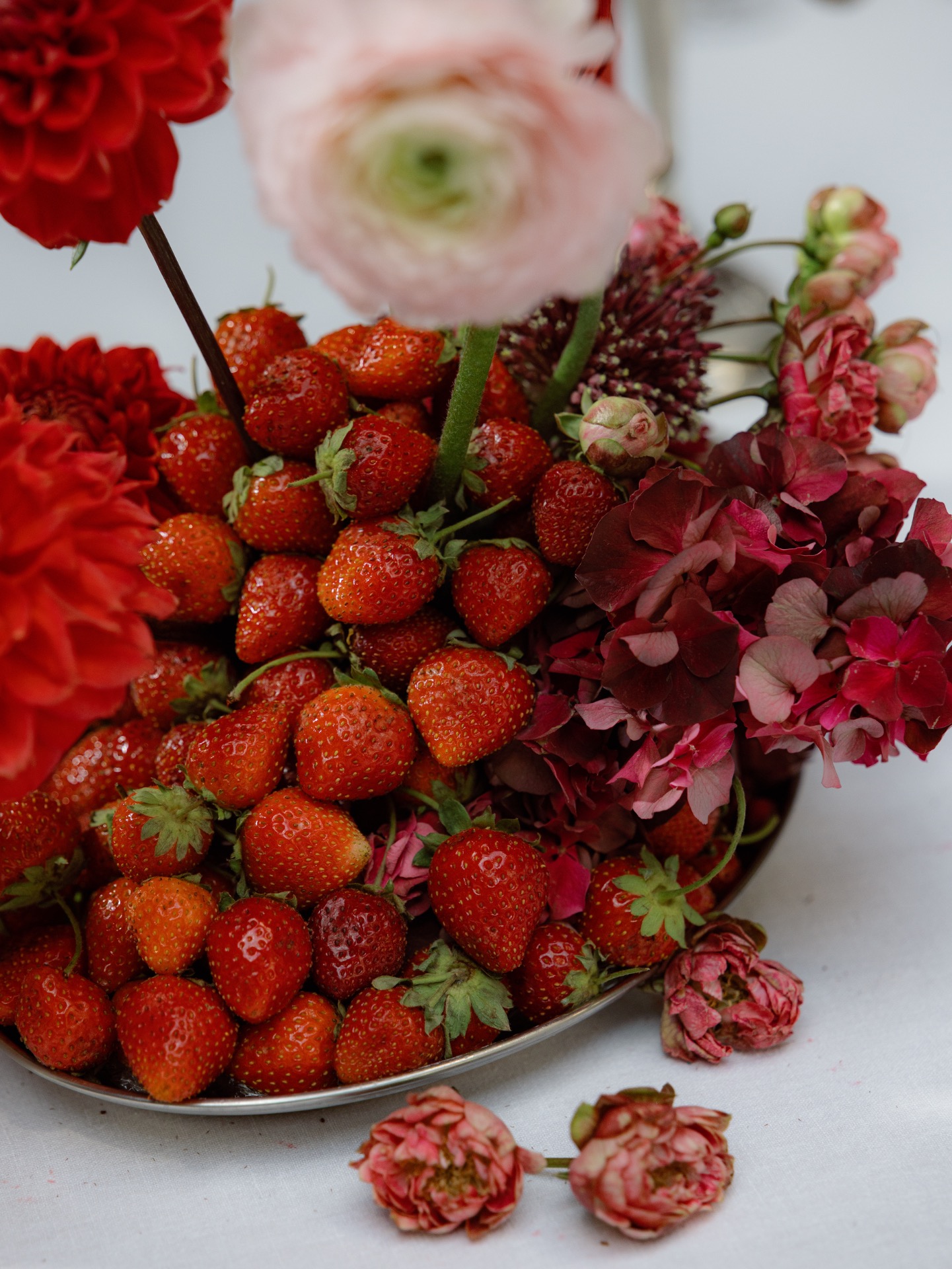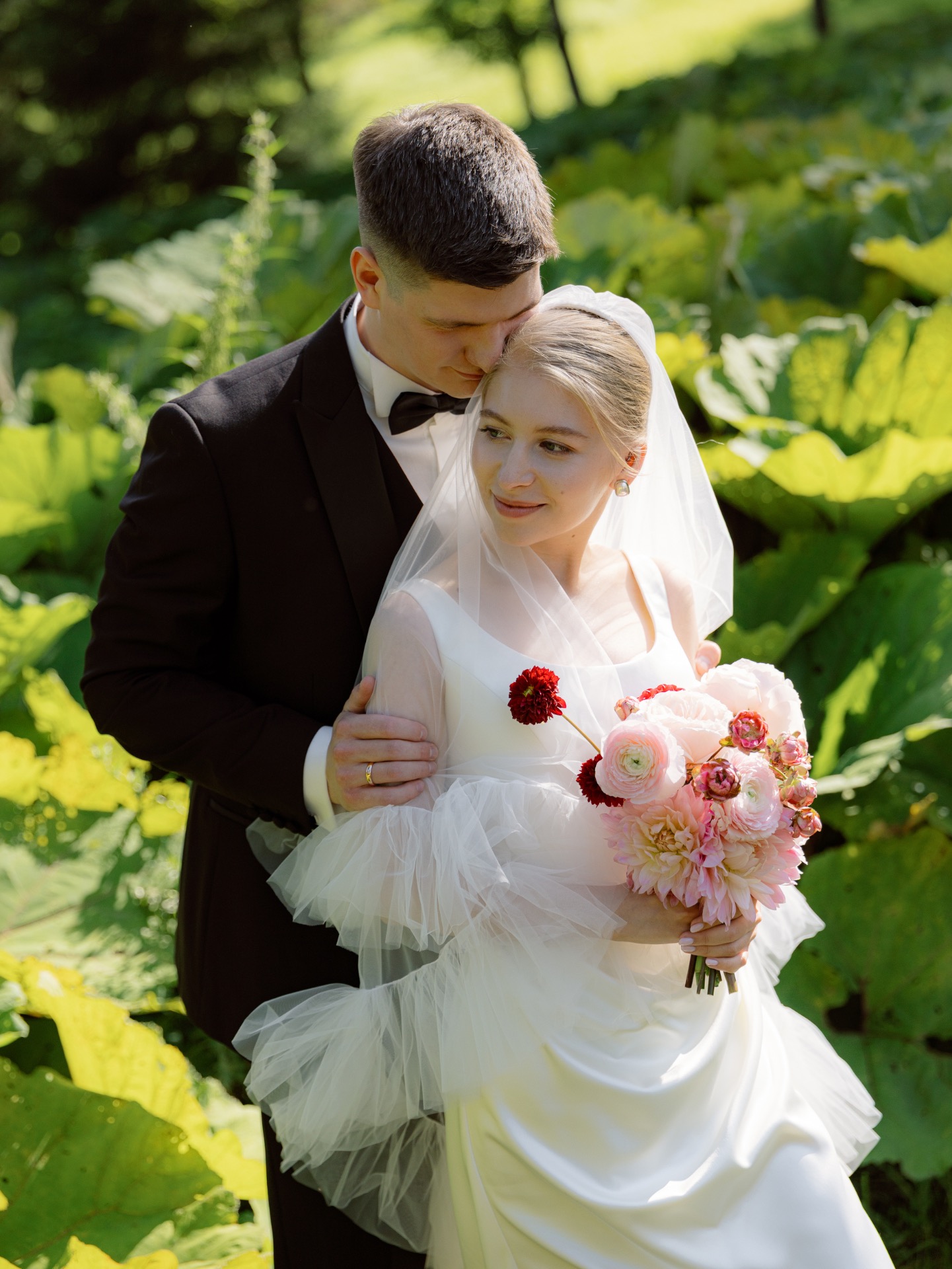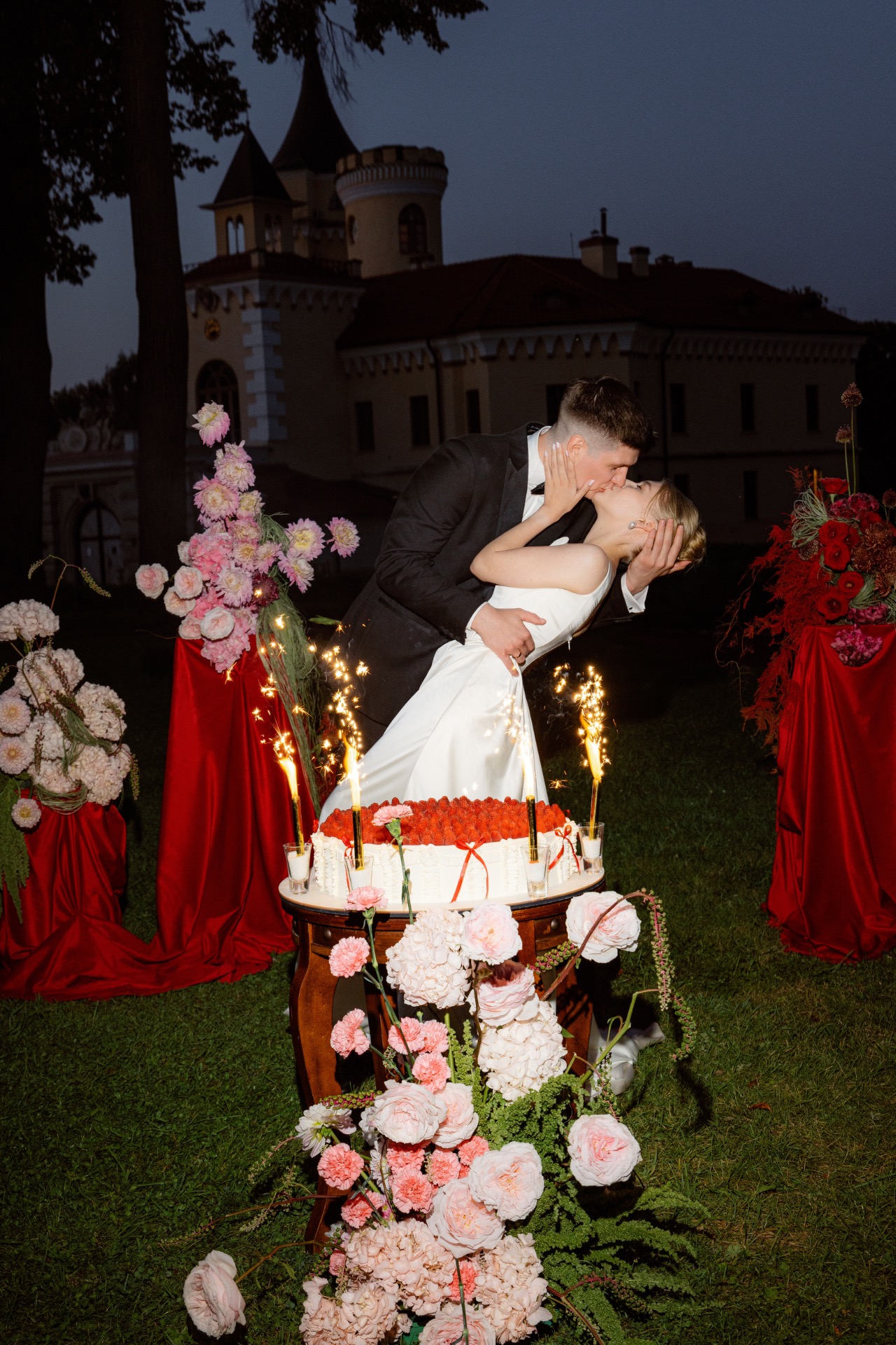 В оформлении также были летние ягоды — клубника и вишня. Мой букет был в нежно-розовых оттенках, безумно красивый. Мне очень нравится, что в нашей свадьбе были такие яркие акценты. Даже в дресс-коде мы ушли от привычных для свадеб пастельных тонов, и наш стилист собрала для гостей презентацию с референсами в бордовых и тёмно-розовых оттенках.
