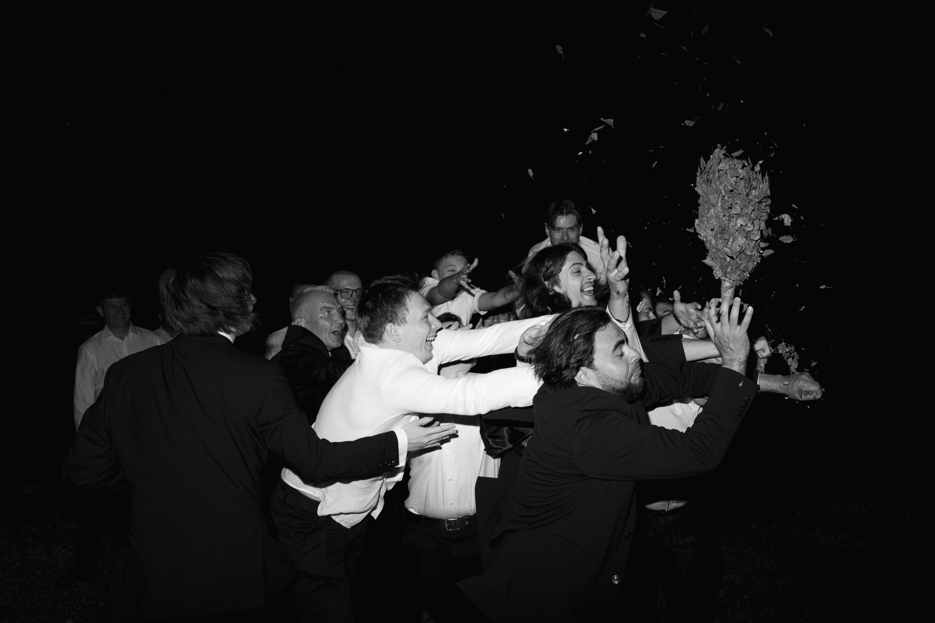 Ближе к концу дня у нас было несколько фишек. Я не кидала букет: меня фотографировали с незамужними девочками на фотоаппарат моментальной печати, а потом я вытянула одну из получившихся фотографий. А вот Ваня кидал банный веник — за него развернулась борьба не на жизнь, а на смерть. Очень люблю эти фотографии — сколько в них жизни!