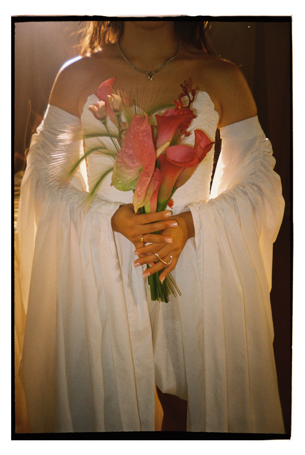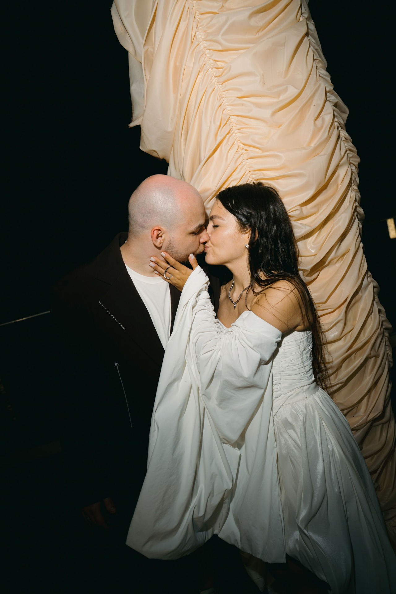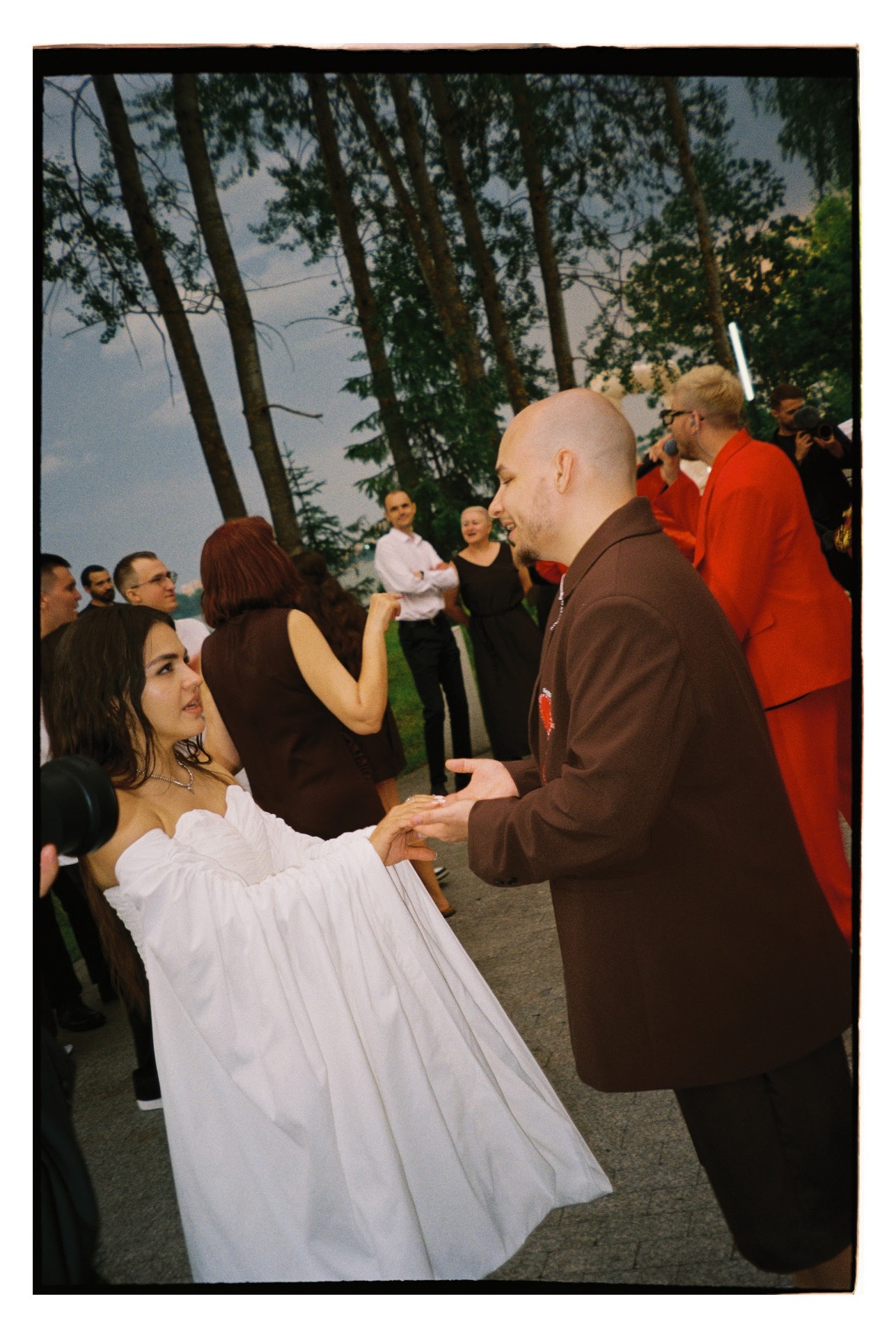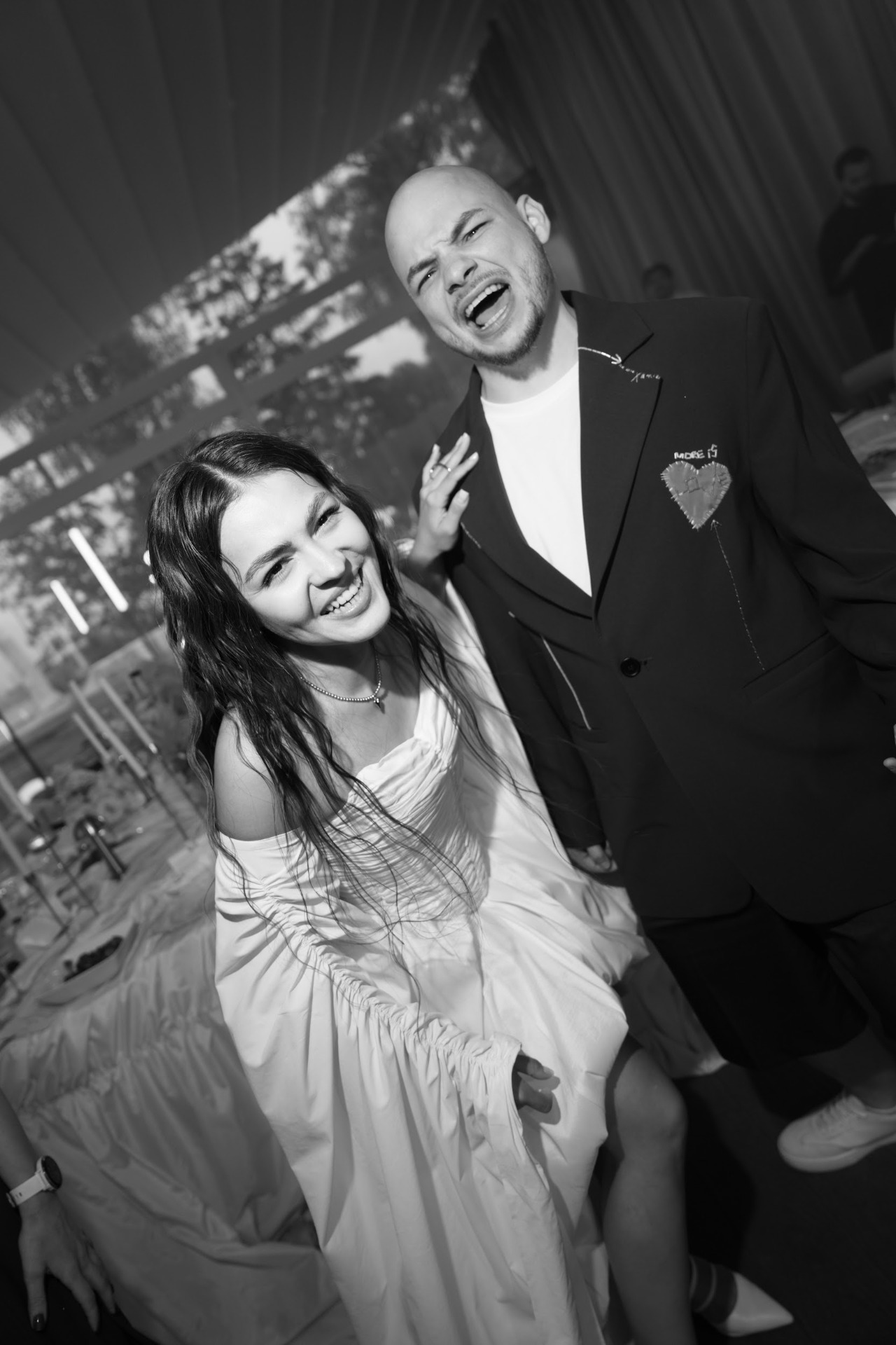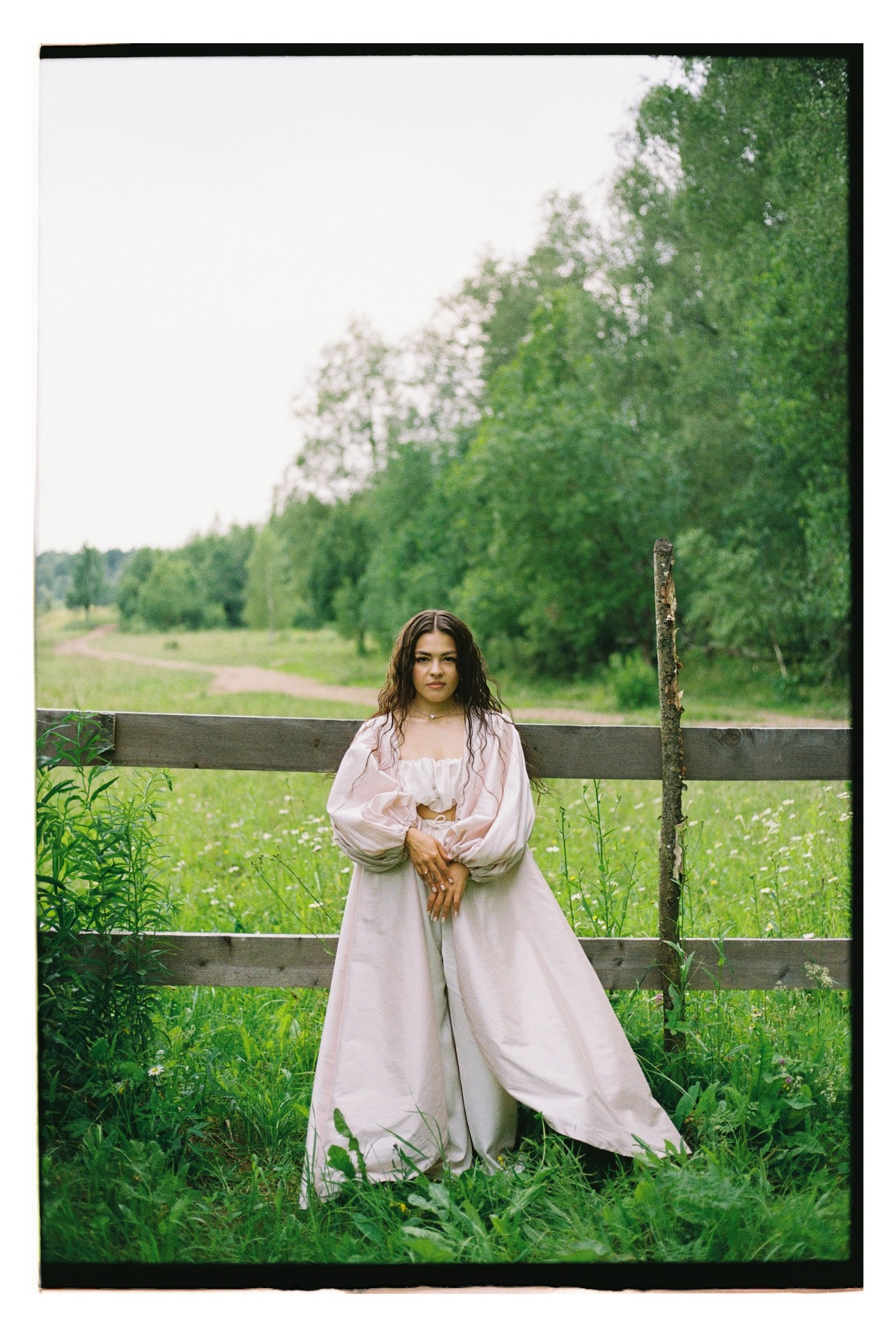 Мои образы: утро — топ в складку, атласные брюки и кейп. Кейп пришёл слишком белым, и я решила покрасить его сама. После семи стирок получился невероятный перламутрово-розоватый цвет, который на фото выглядит волшебно. Основное платье — Rara Avis Perlamutr. Когда я его надела, поняла: вот оно. Платье было тоже «в складочку», словно созданное специально для нашего дня. Второй образ — юбка из Lime и сшитые на заказ корсет и рукава. Фактура мягкой и объёмной. Ещё одно платье было из Lichi, именно в нём мы пошли в ЗАГС и станцевали наш первый танец.