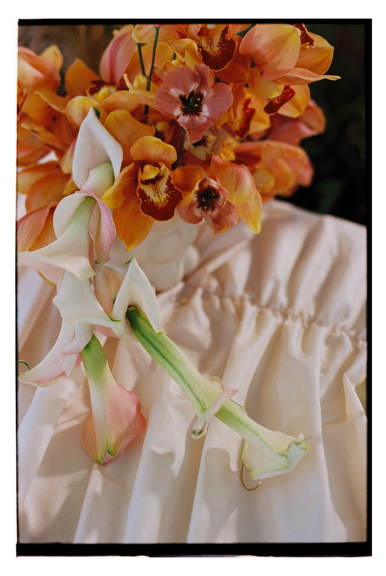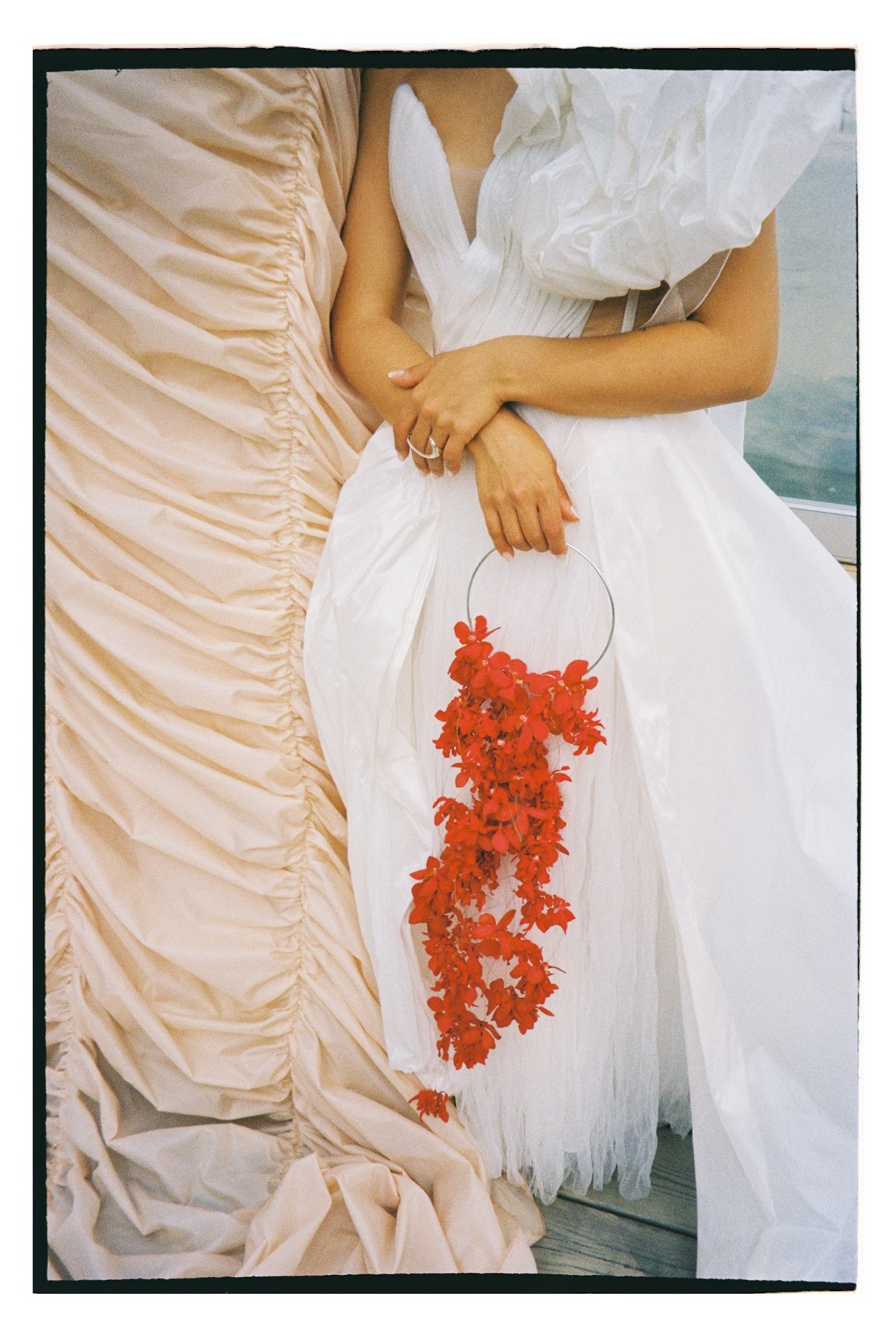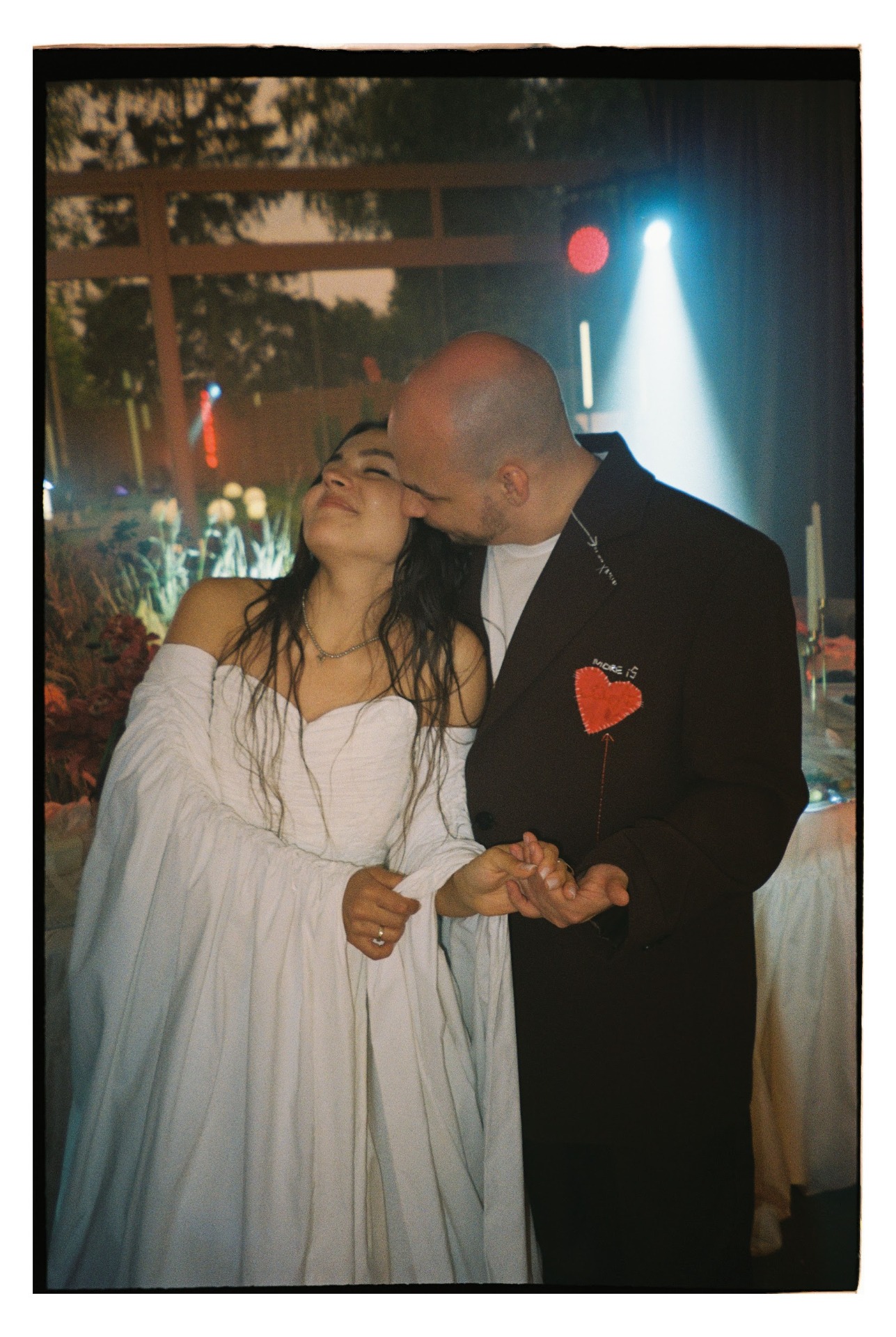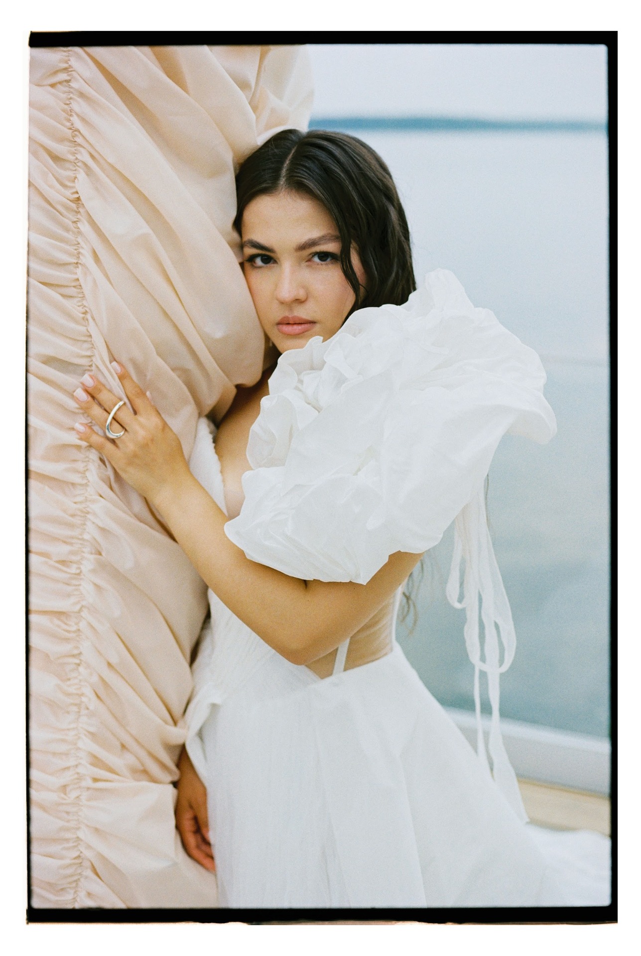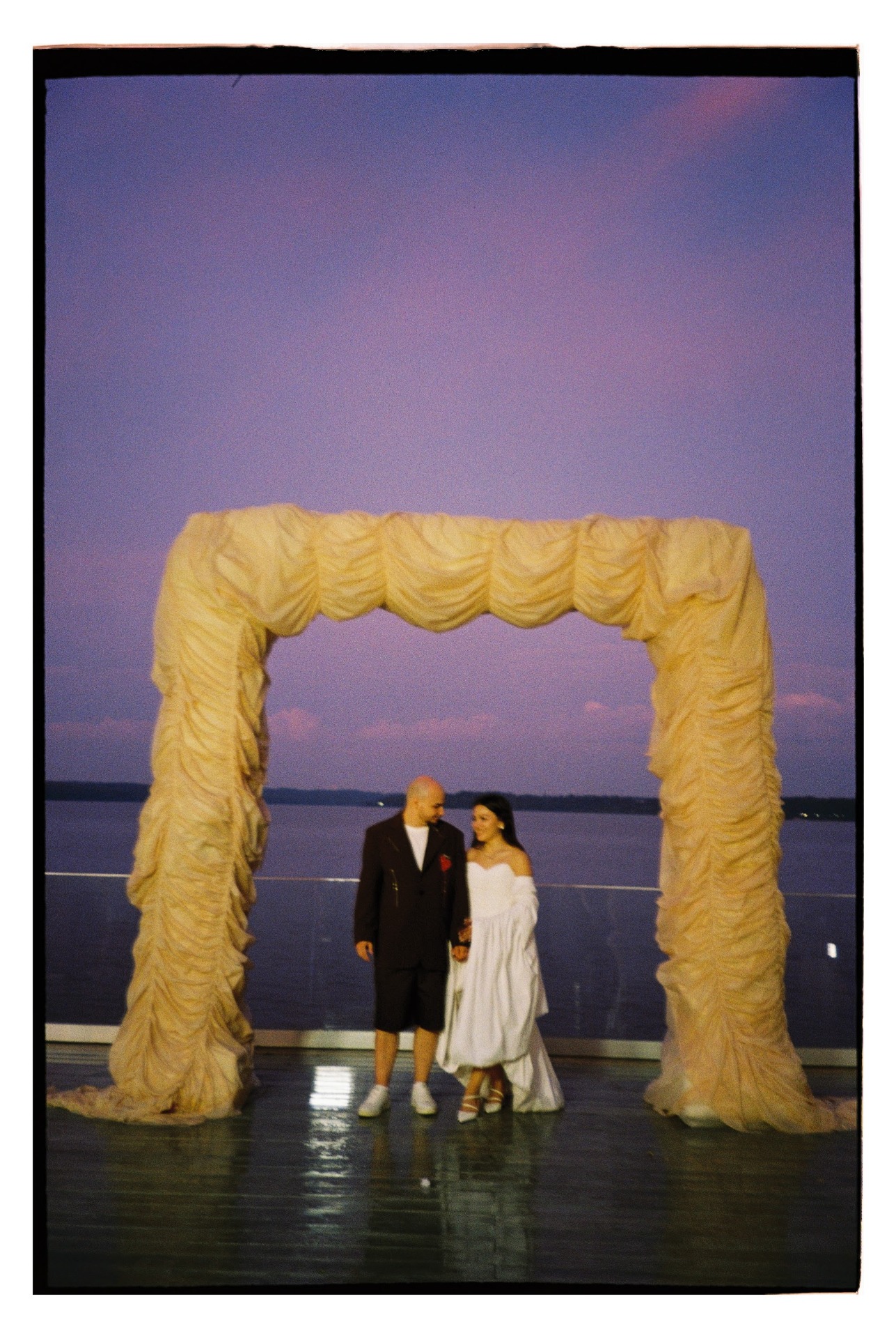 Мои образы: утро — топ в складку, атласные брюки и кейп. Кейп пришёл слишком белым, и я решила покрасить его сама. После семи стирок получился невероятный перламутрово-розоватый цвет, который на фото выглядит волшебно. Основное платье — Rara Avis Perlamutr. Когда я его надела, поняла: вот оно. Платье было тоже «в складочку», словно созданное специально для нашего дня. Второй образ — юбка из Lime и сшитые на заказ корсет и рукава. Фактура мягкой и объёмной. Ещё одно платье было из Lichi, именно в нём мы пошли в ЗАГС и станцевали наш первый танец.