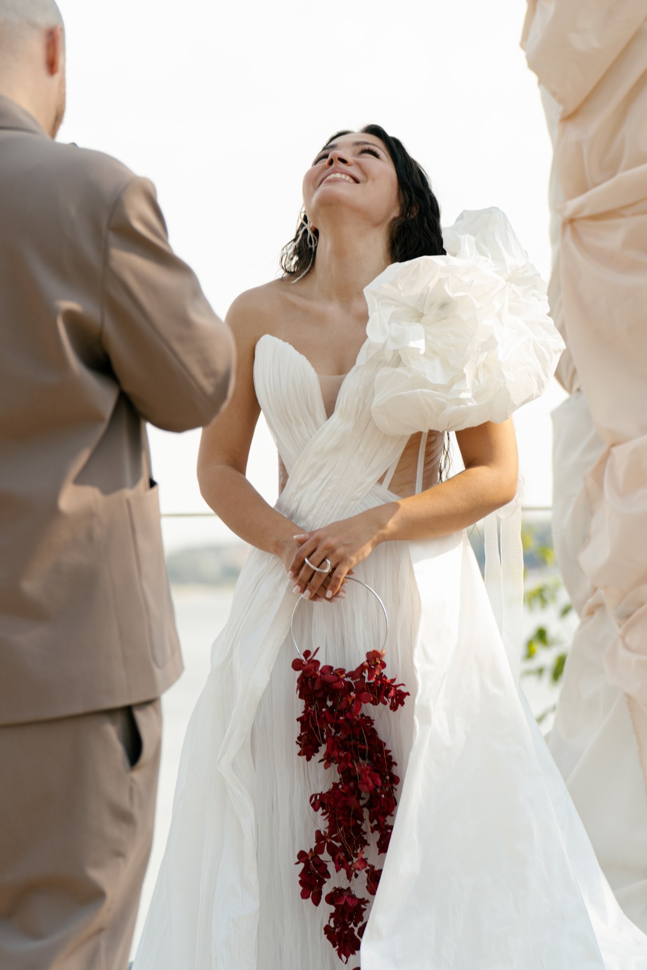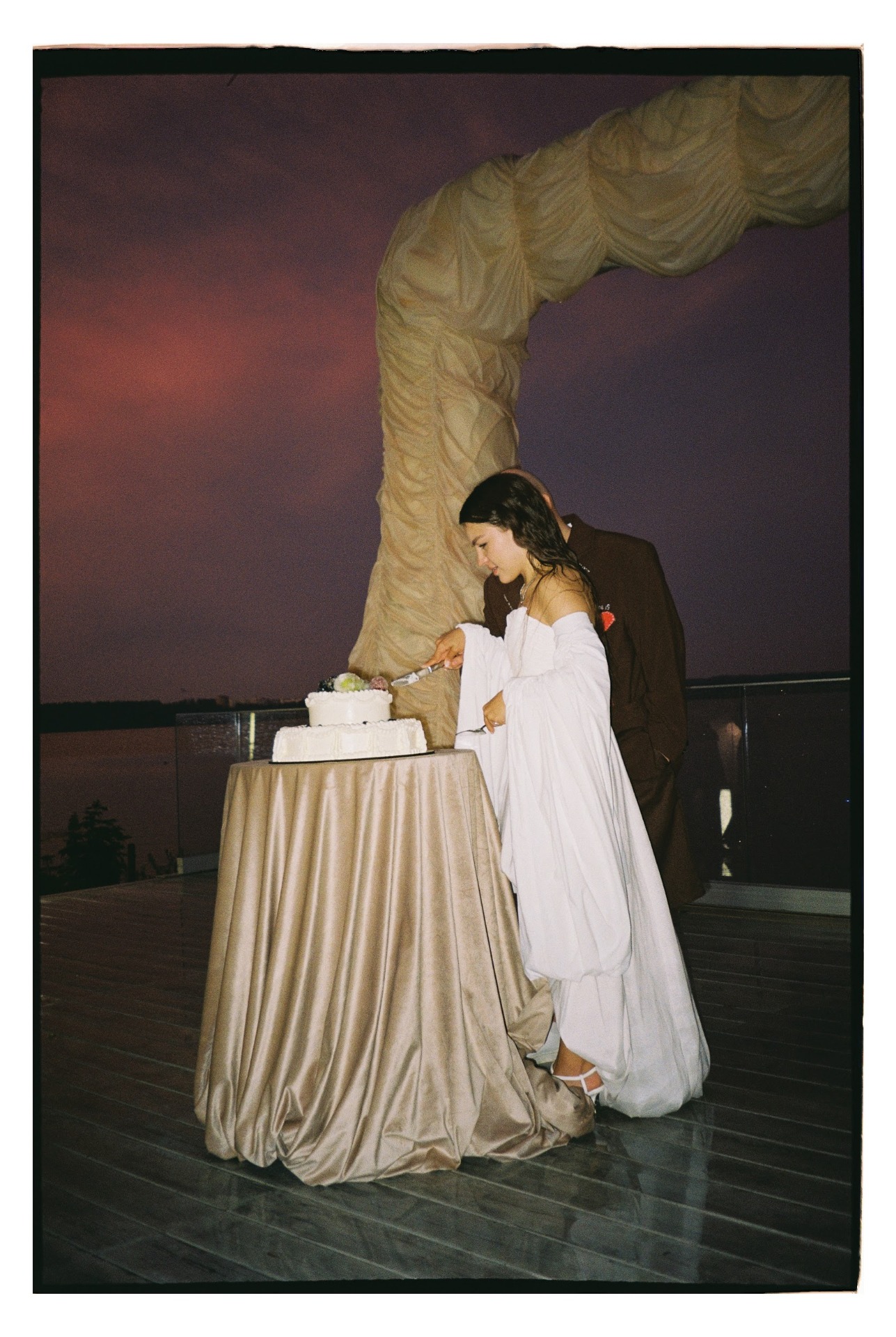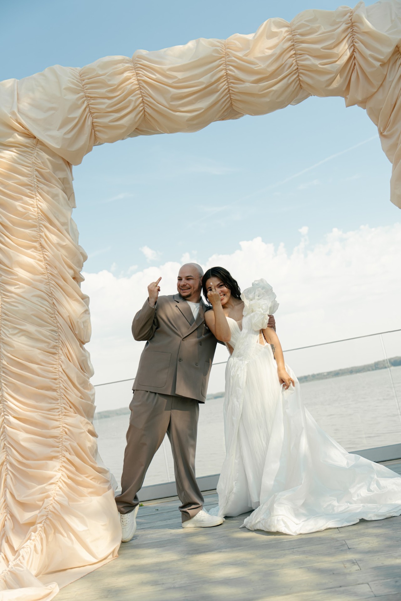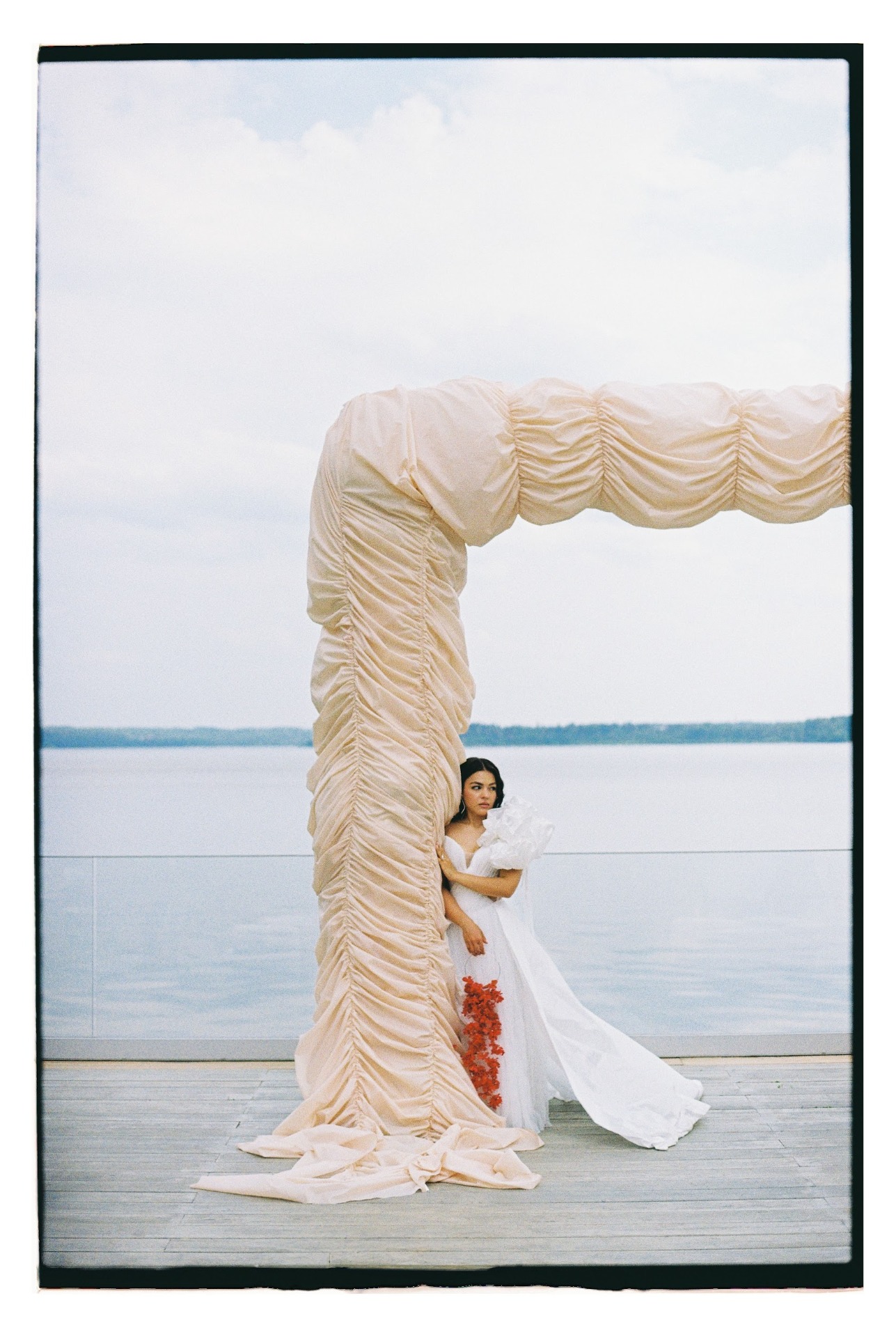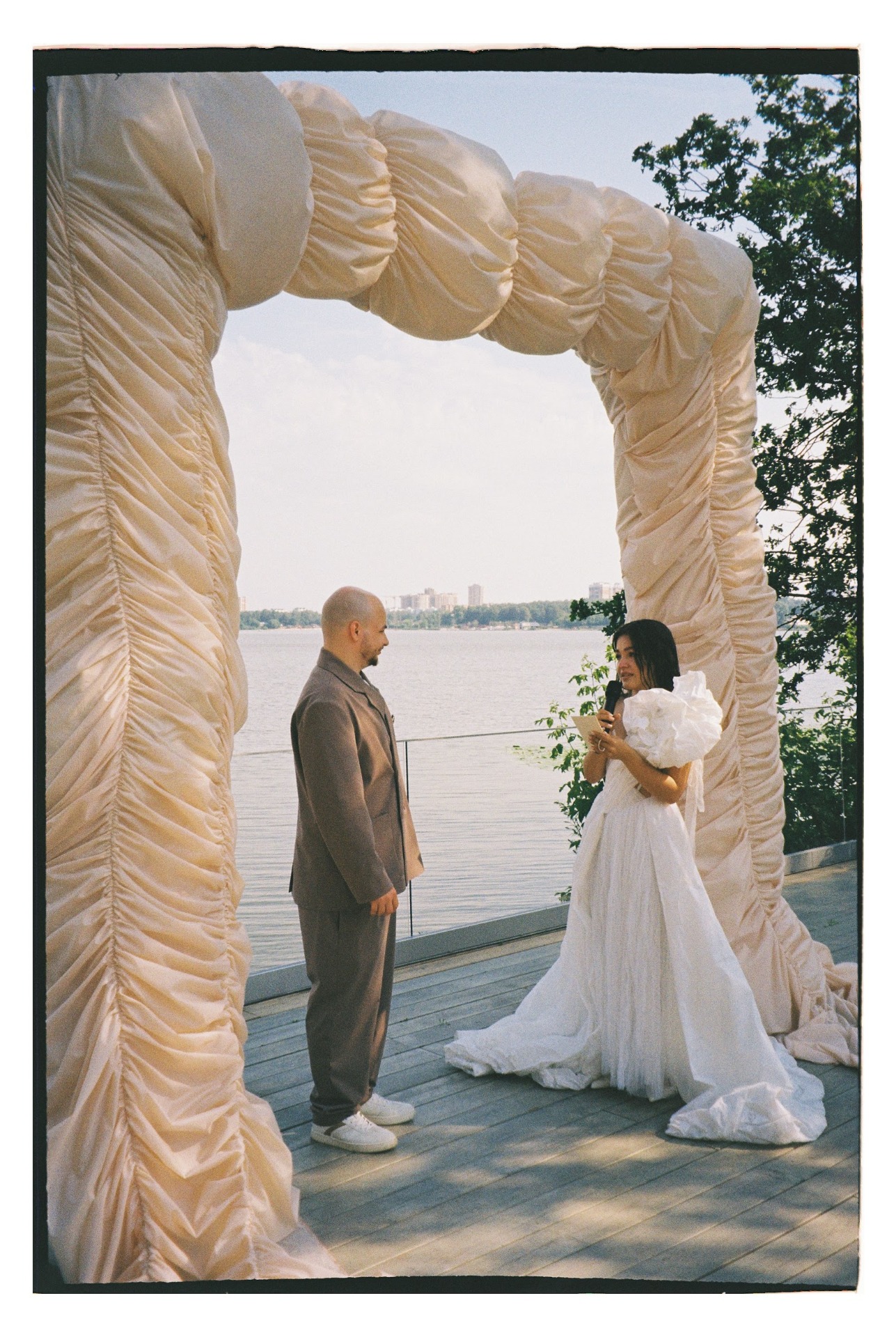 У нашей свадьбы даже появилось кодовое слово — «складочка». Все элементы концепции и декора так или иначе были связаны с мягкой фактурой, тканью, сборками. Наша арка была из драпированной ткани, а скатерти на столах в складочку. Это стало нашей фишкой, которая случайно родилась и объединила всё. С флористикой всё оказалось просто: нам предложили решение, в которое мы сразу влюбились — только характерные, графичные и интересные формы. Торт тоже был любовью с первого взгляда, мы просто сказали: «Вот, это оно».