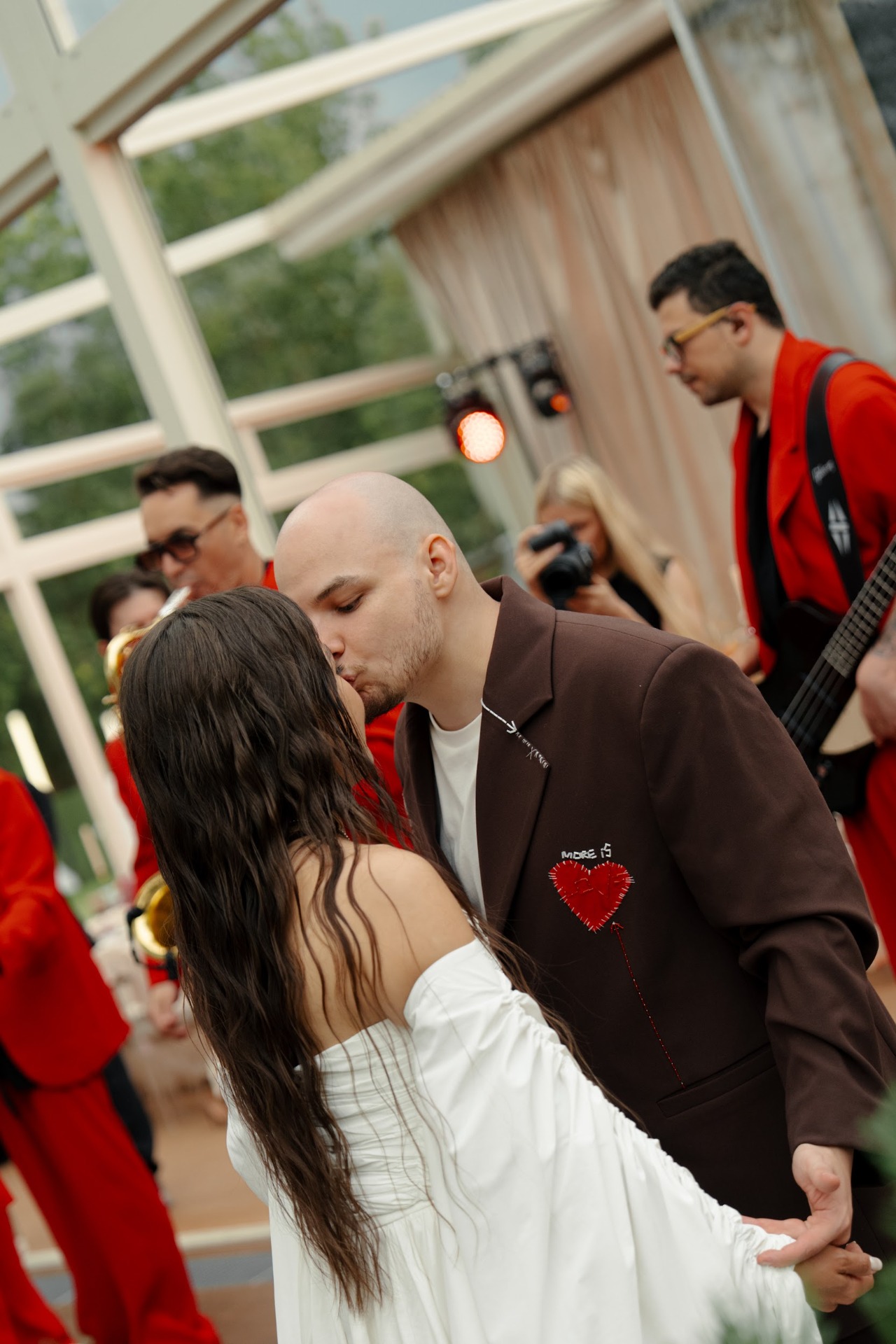 У жениха было три образа. Утренний — расслабленный: шорты, футболка и рубашка в молочно-бежевой гамме. Церемония — оверсайз-костюм от Lamoda и футболка с акцентом на фактуру. Я добавила брошь в виде «мятыша» — складки ткани, перекликающейся с нашей общей концепцией. Вечерний образ стал моим личным проектом: коричневый костюм, был заказан на маркетплейсе, но пиджак я расшила вручную. Стеклярус, ткань, нитки: с одной стороны вышито сердце со стрелой, с другой — абстрактные элементы.