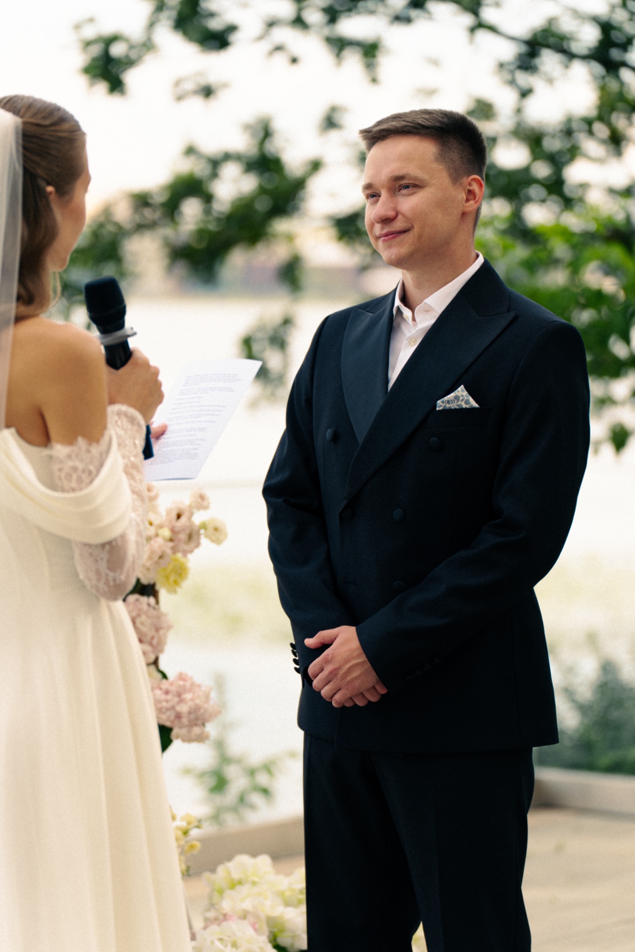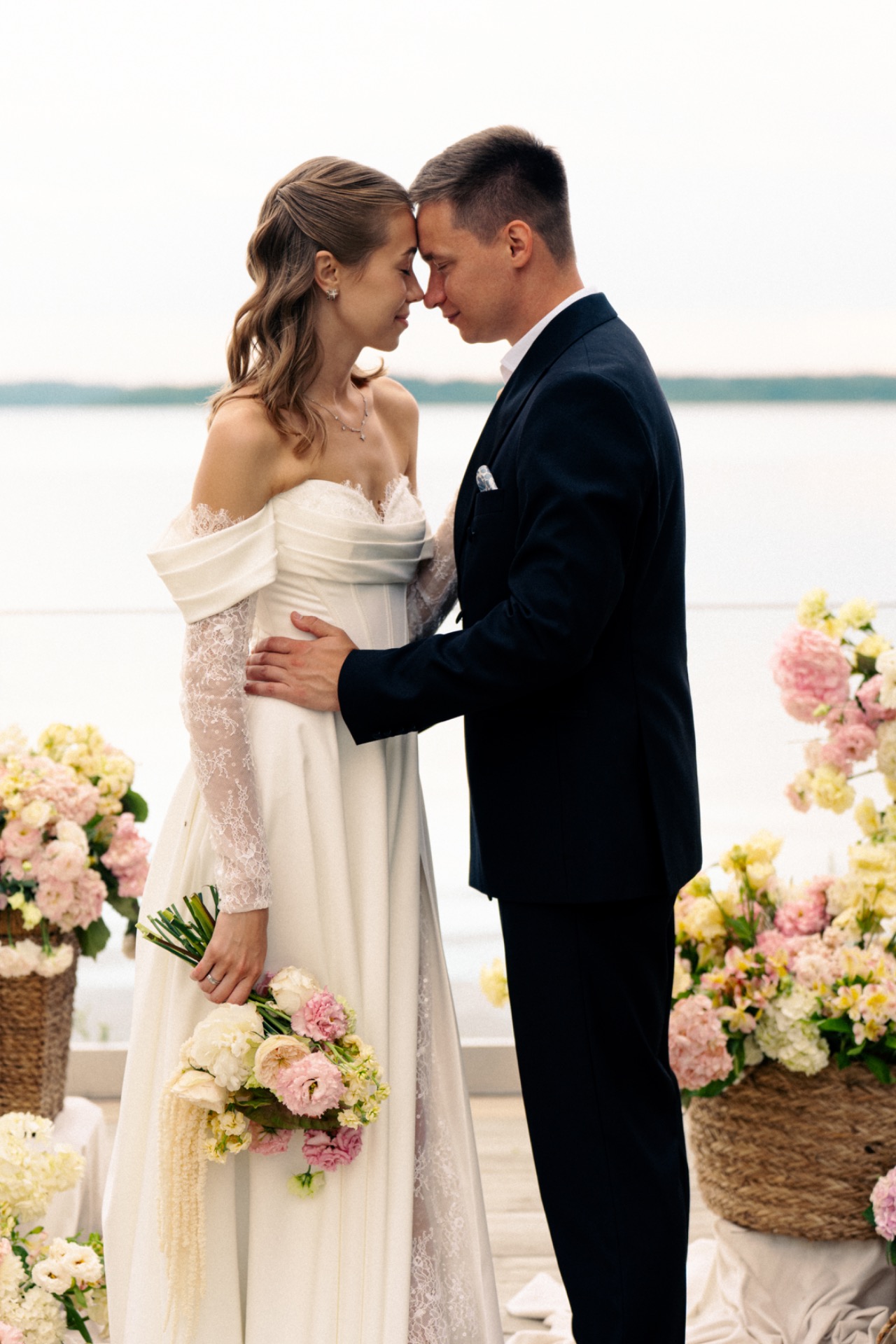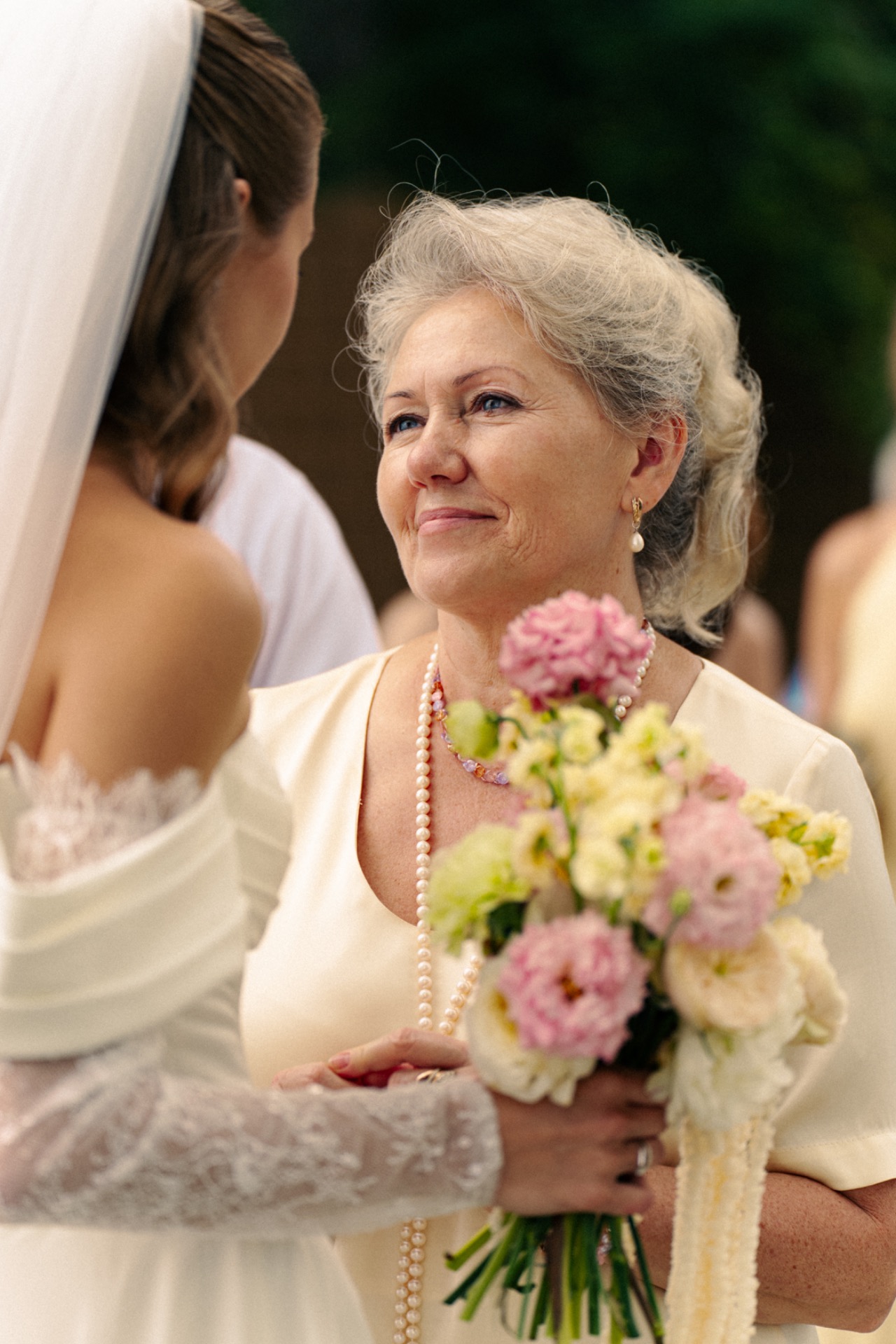Мы провели небольшую утреннюю фотосессию, побегали босиком по траве и начали готовиться к церемонии. Она была очень трогательной — мы успели посмеяться и поплакать. А ещё нам всё время хотелось обнимать и целовать друг друга. В тот момент любовь просто переполняла нас!