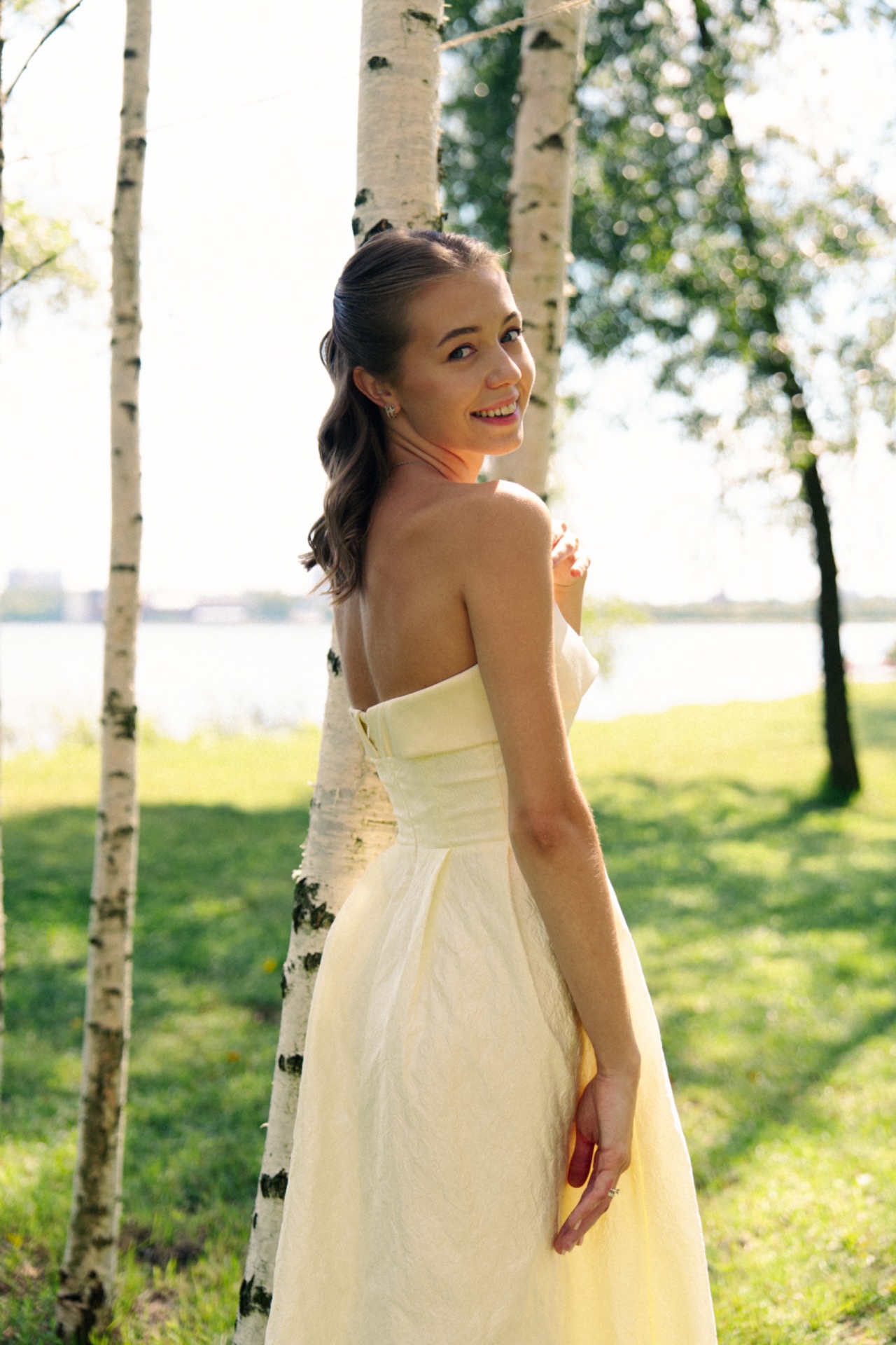 Платье я нашла ещё в апреле в салоне Jully Bride. Я пришла к ним со скриншотами из социальной сети, и среди шести вариантов лишь одно вызвало у меня слёзы радости. Тогда менеджер салона спросила меня: «Вы говорите «Да» этому платью?». В этот момент я поняла, что нашла свой идеальный наряд.