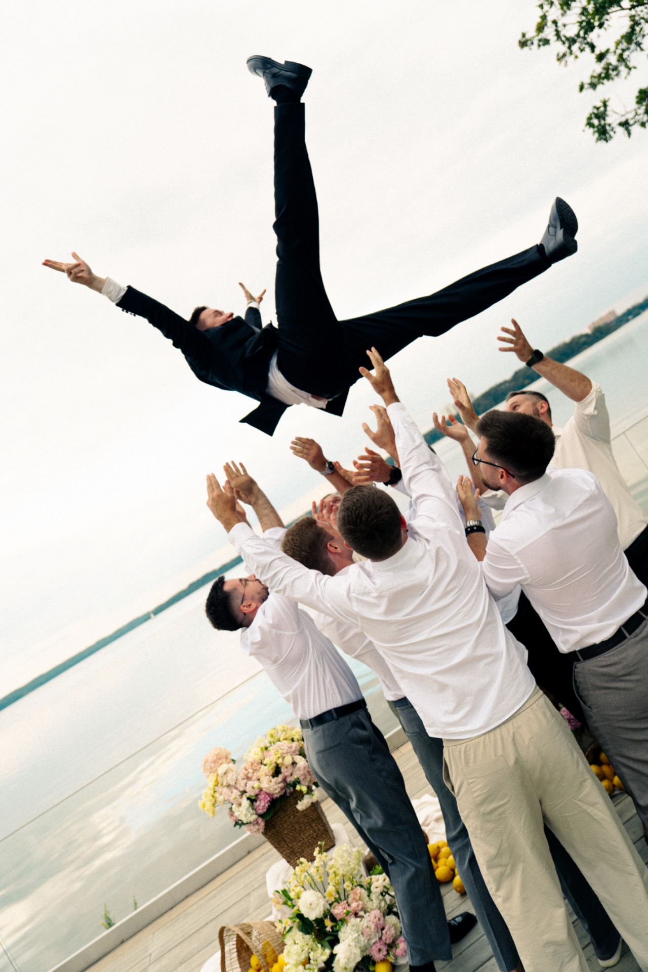 Букет я бросала с пожеланиями любви и счастья, а Лёша разыграл бутылку вина среди мужчин с помощью весёлого конкурса с монеткой.