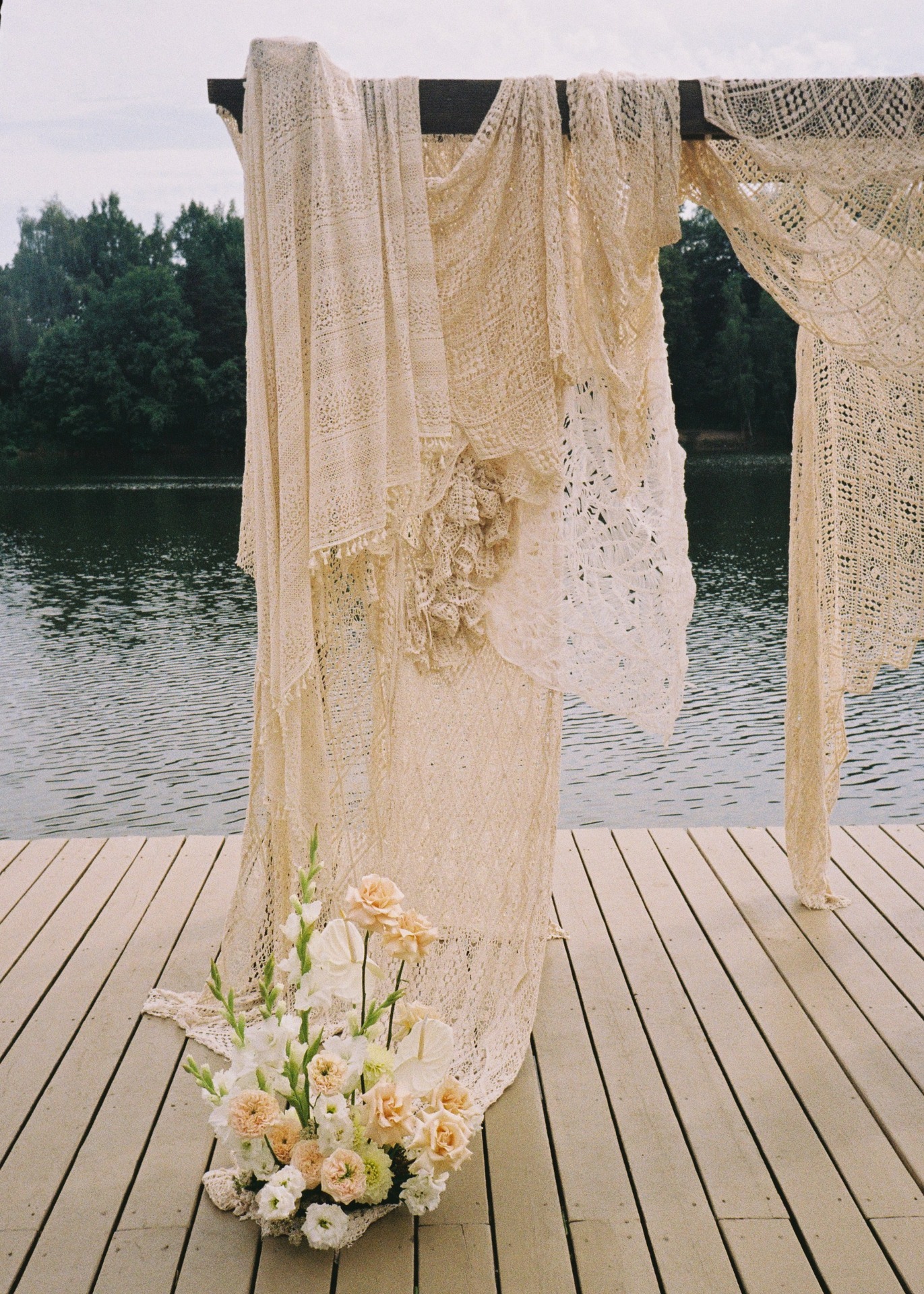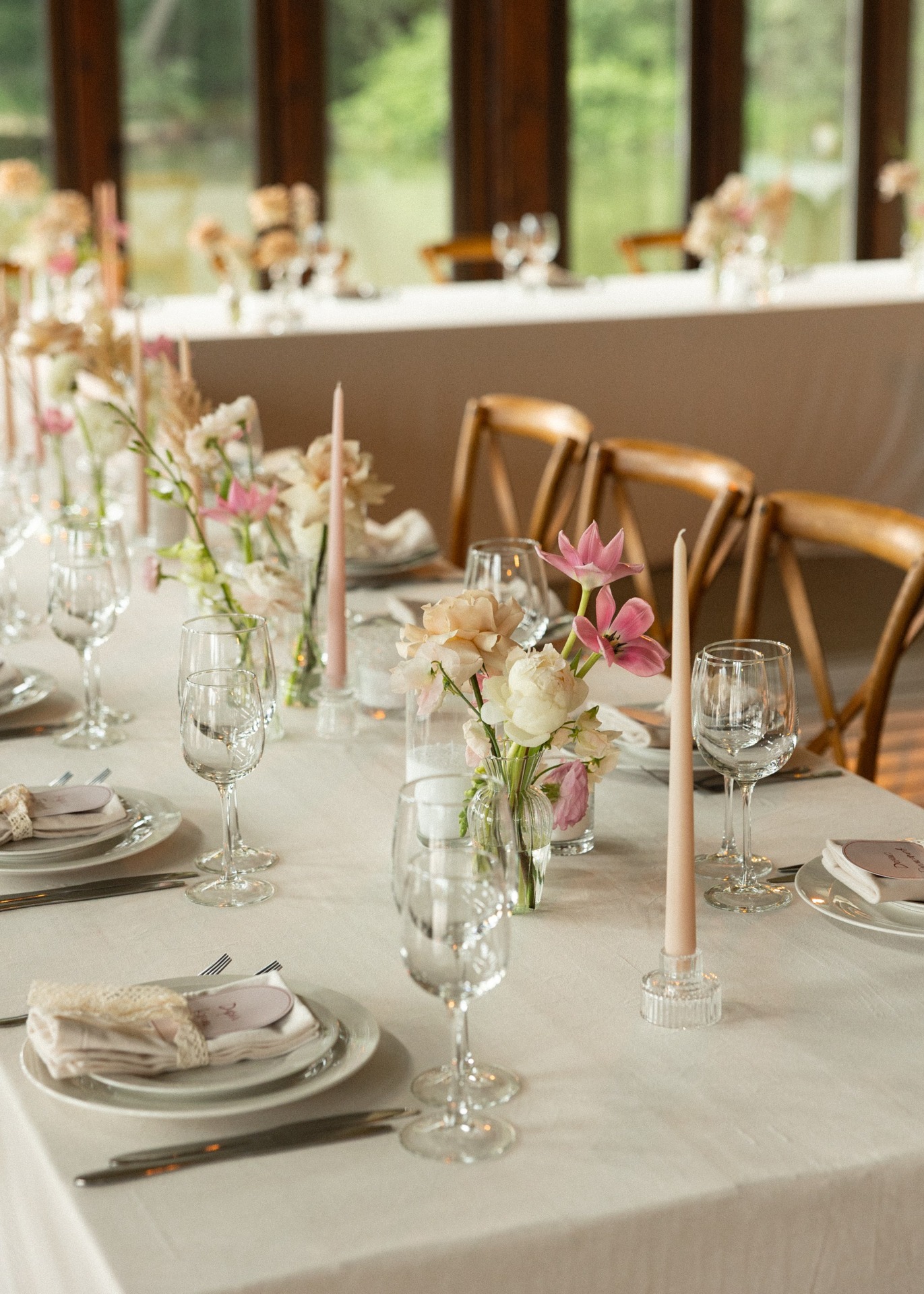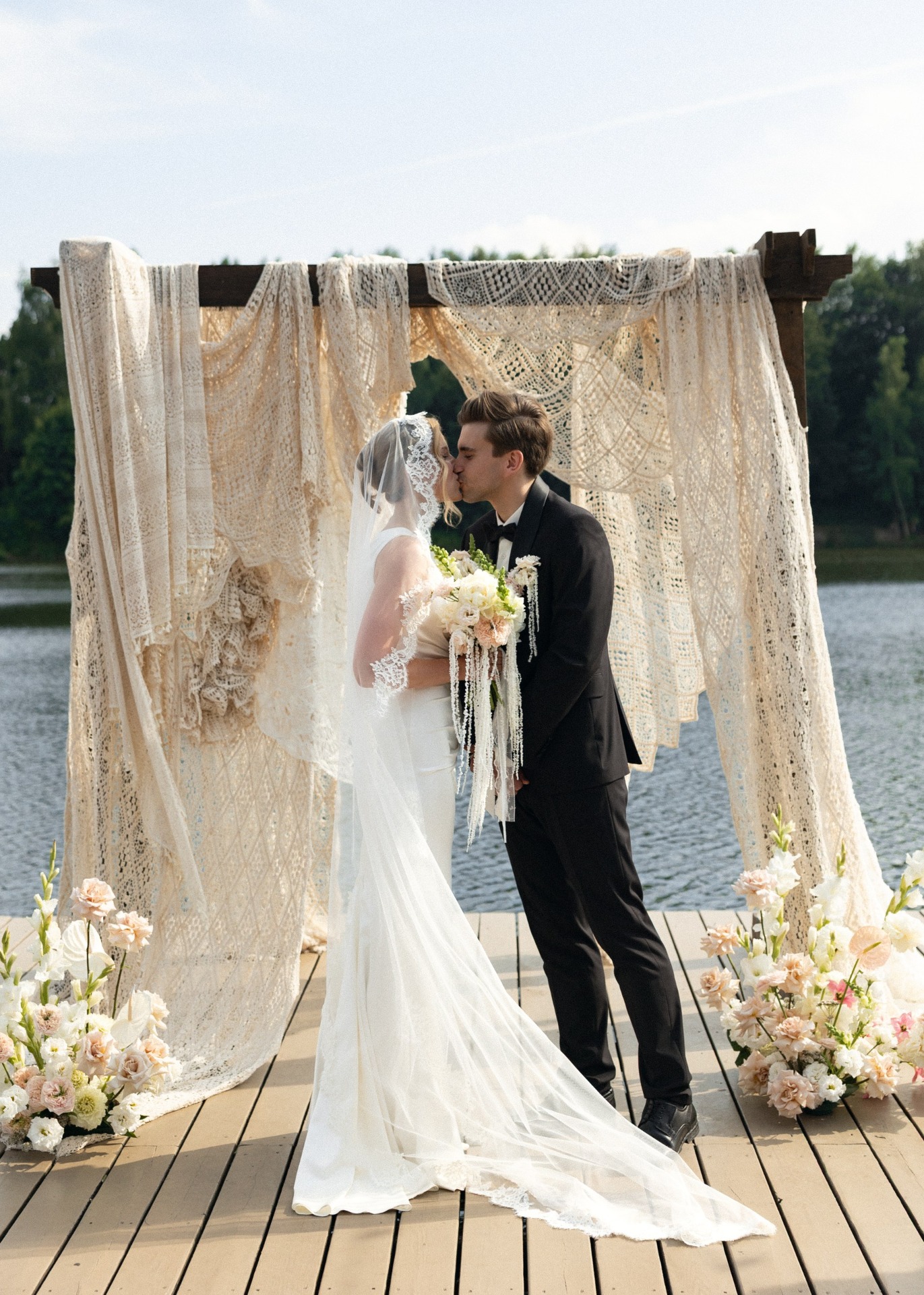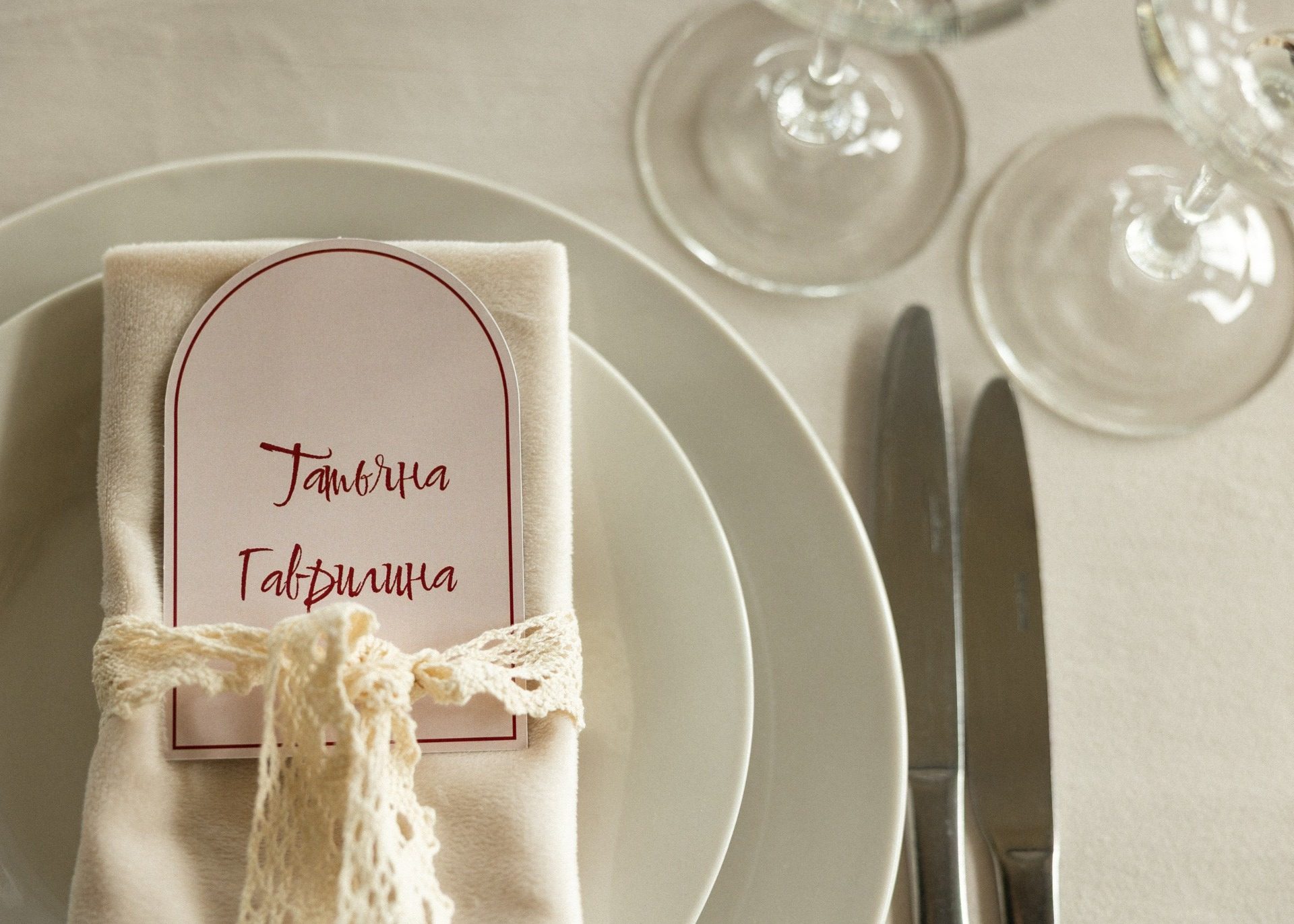 Команда Vozdukh weddings помогла продумать всё до мелочей. В декоре преобладали молочные, бежевые и розово-бордовые оттенки, кружево и свечи создавали ощущение нежности.