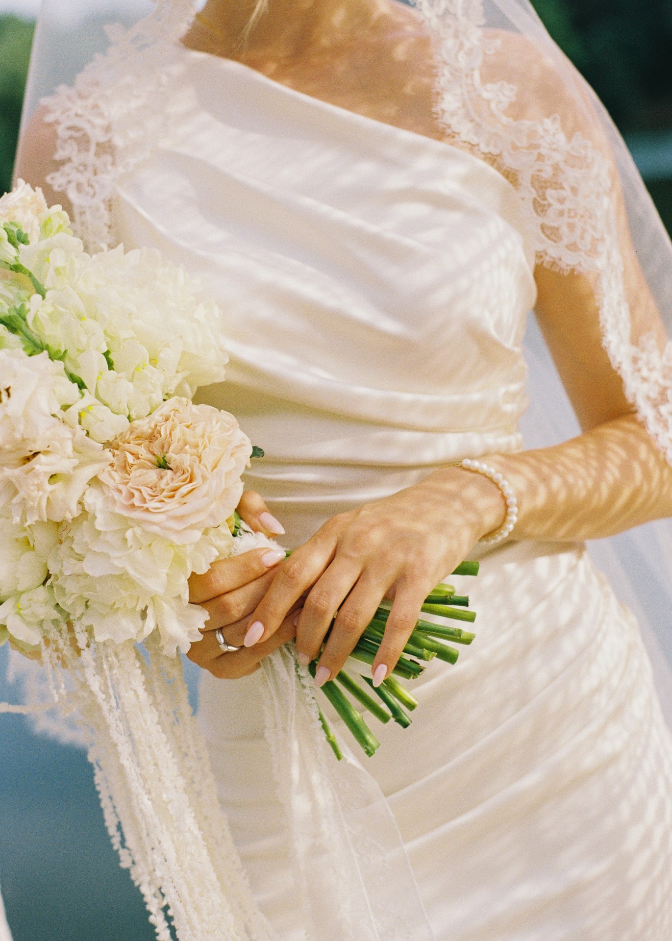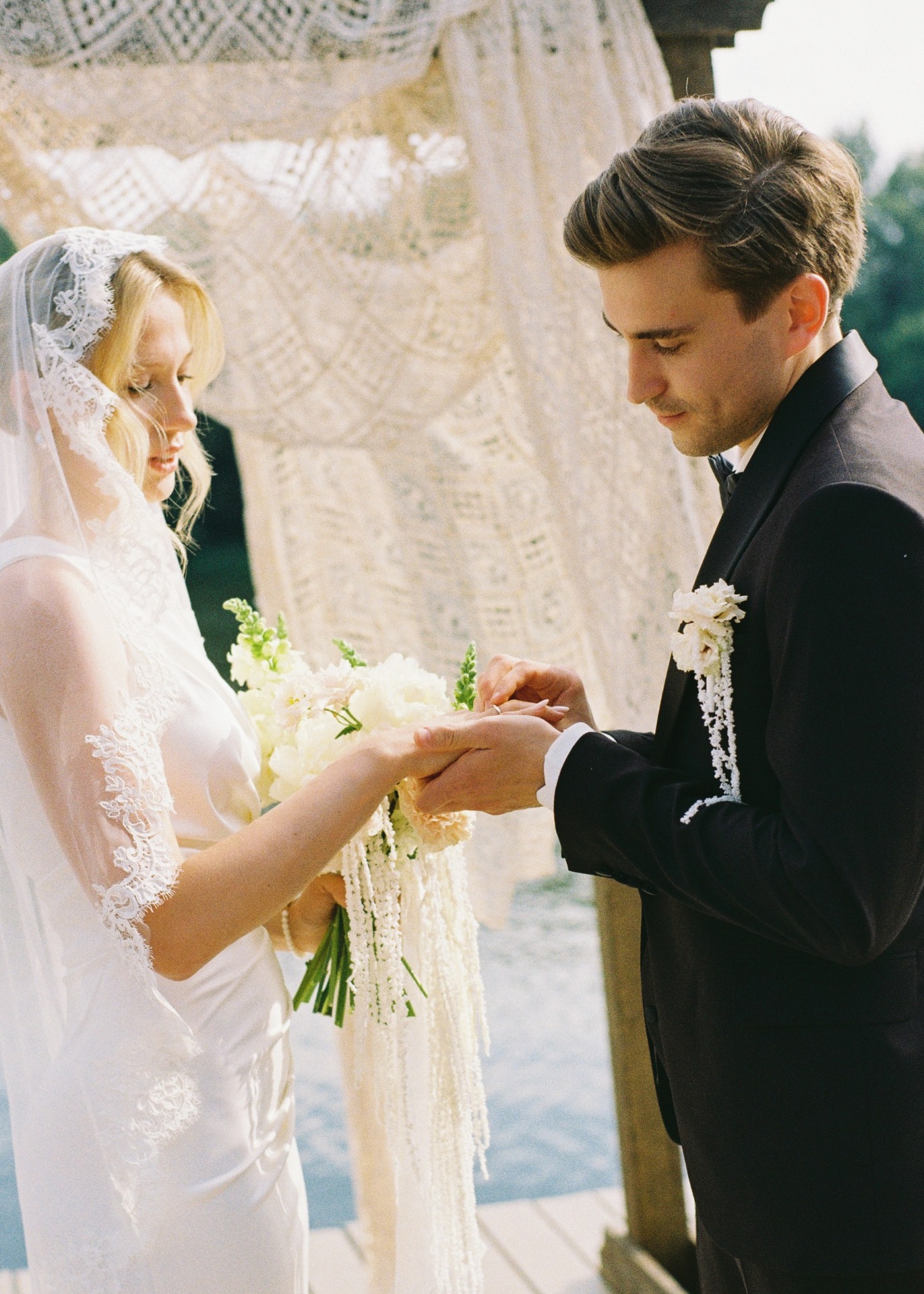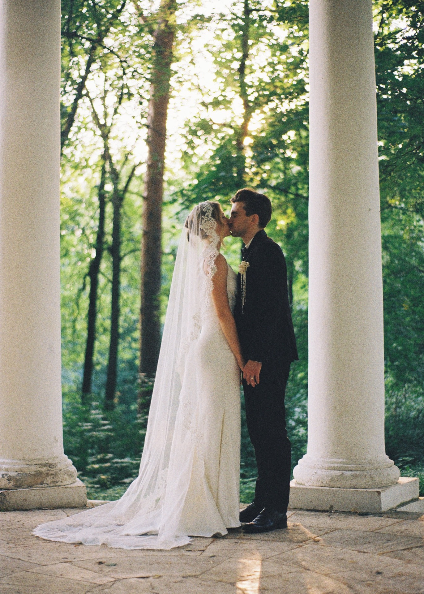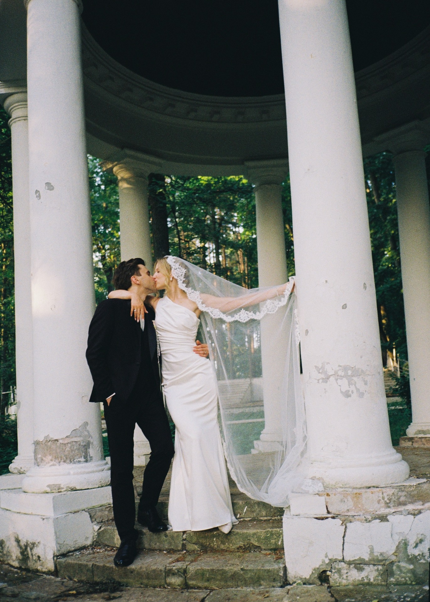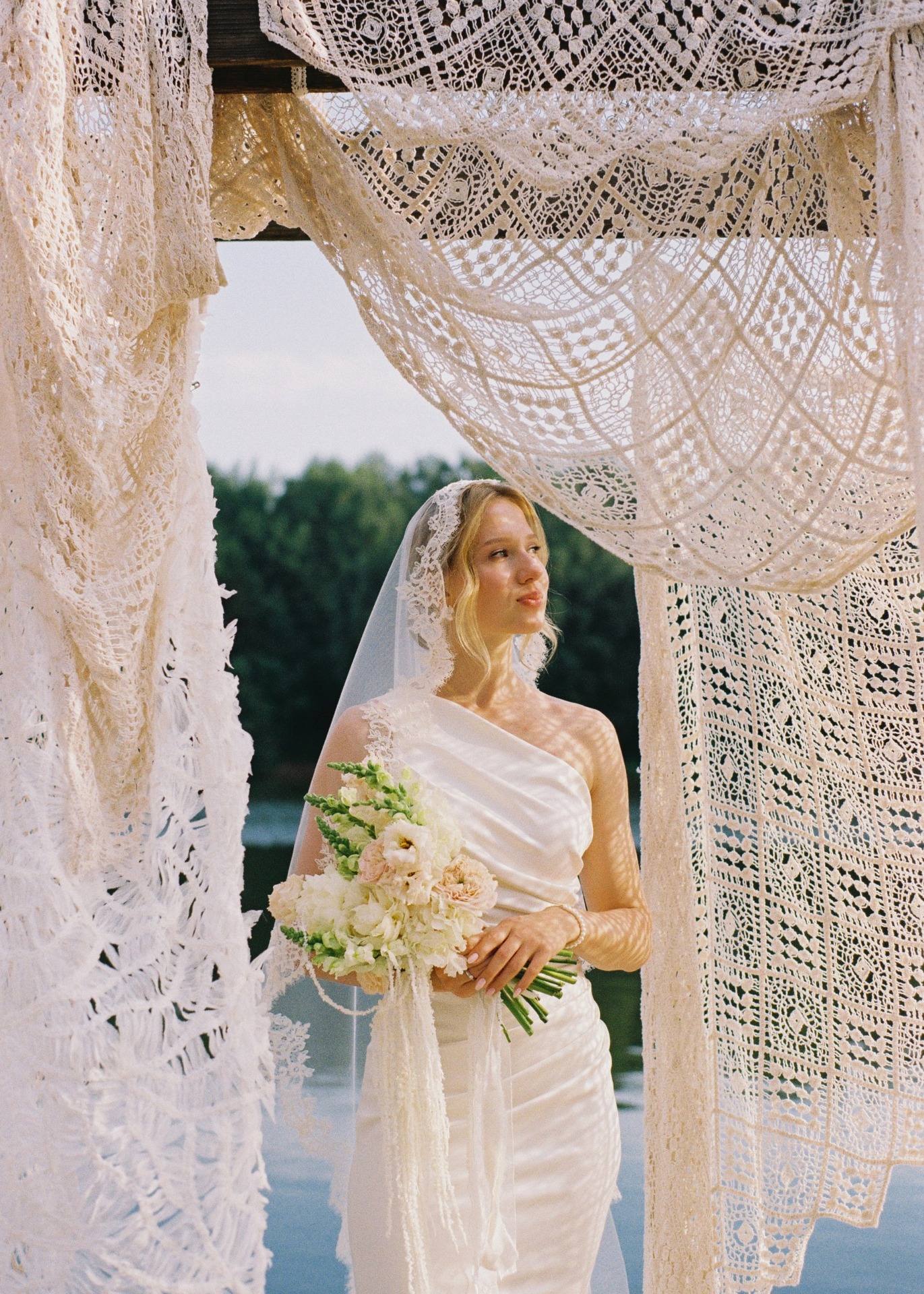 Вдохновением для наших образов стала итальянская классика. Моё основное платье прямого силуэта с асимметричным плечом и мягкими драпировками я дополнила кружевной фатой-испанкой, которая задала нужное настроение и лёгкий южный шарм.