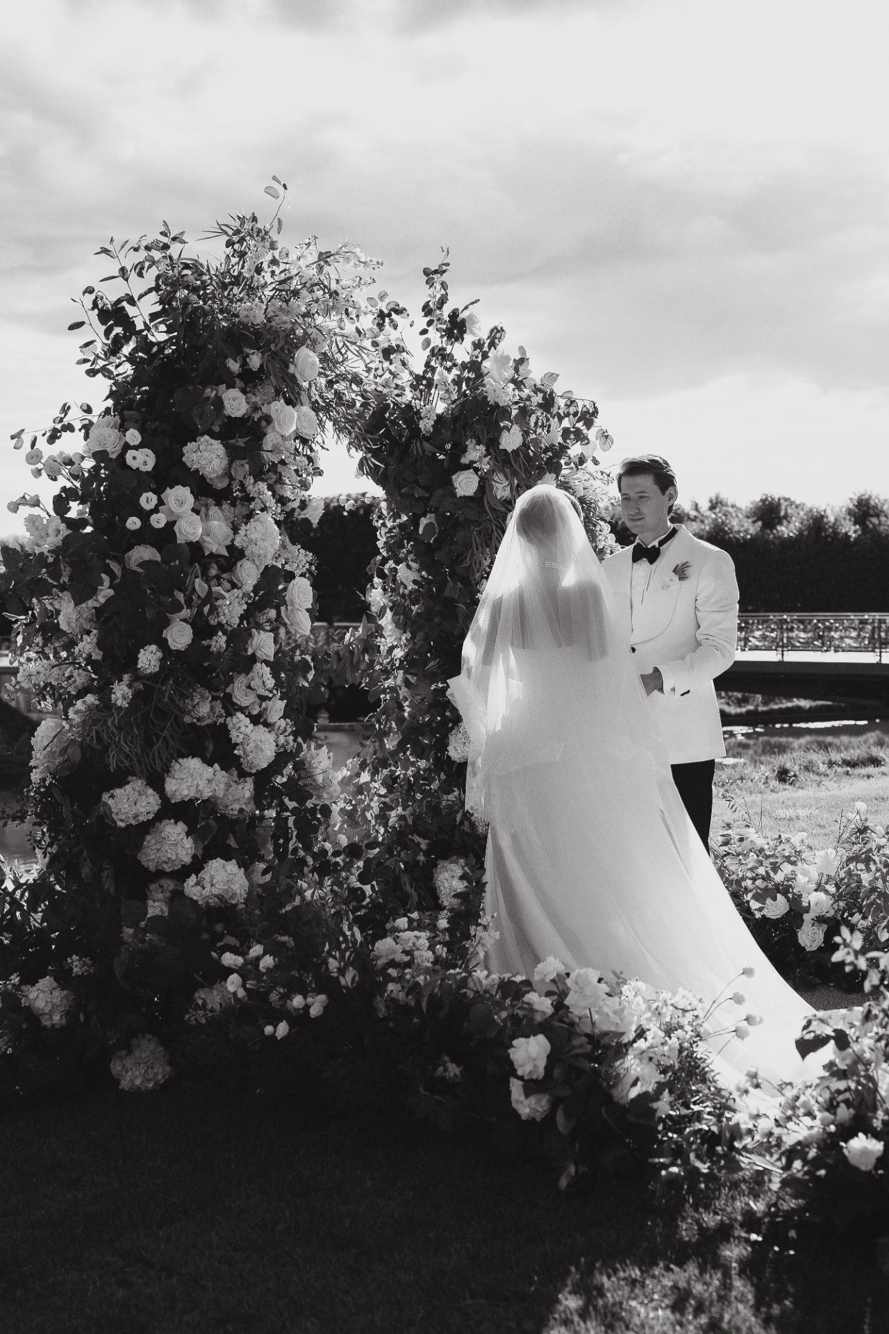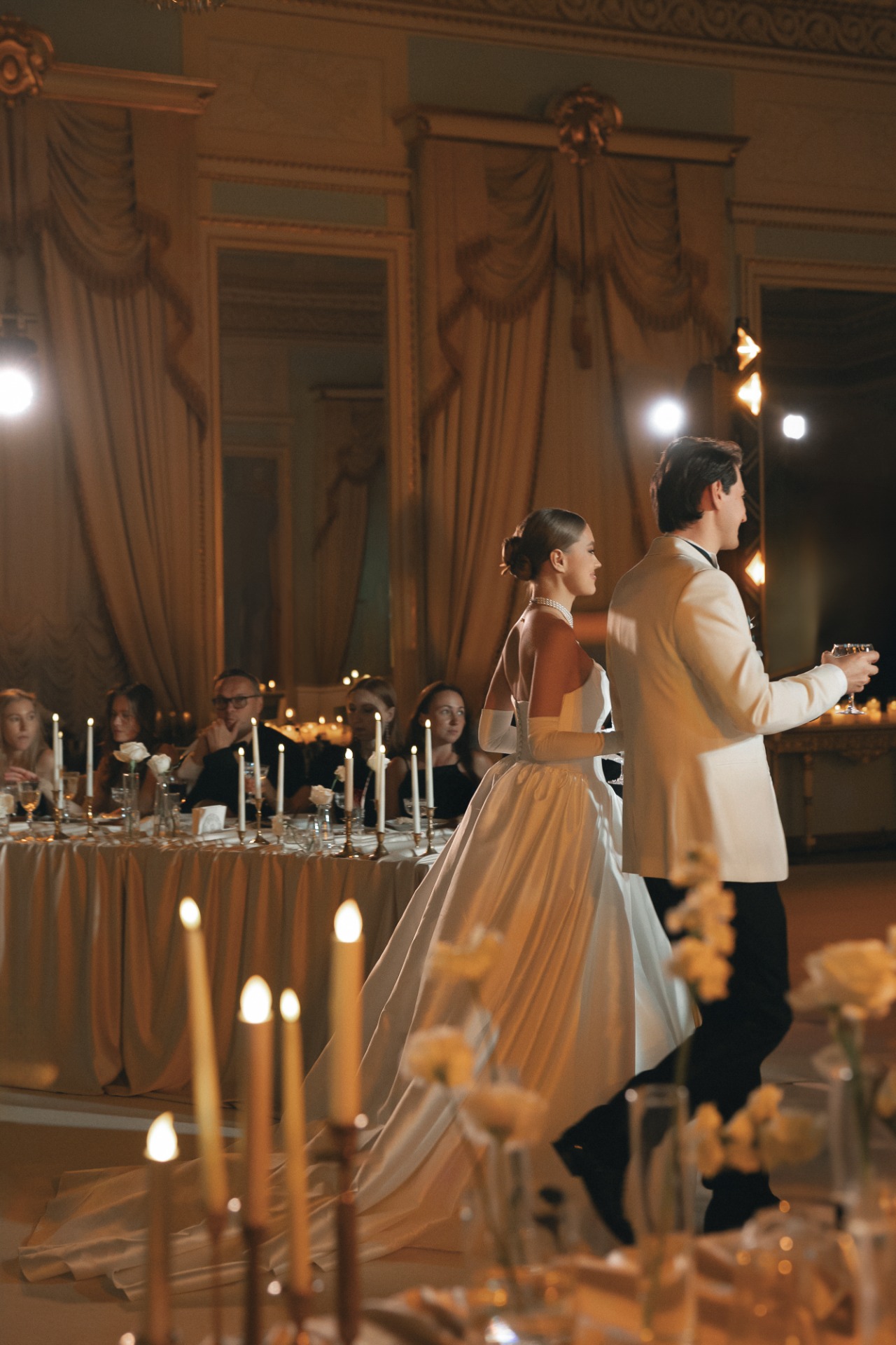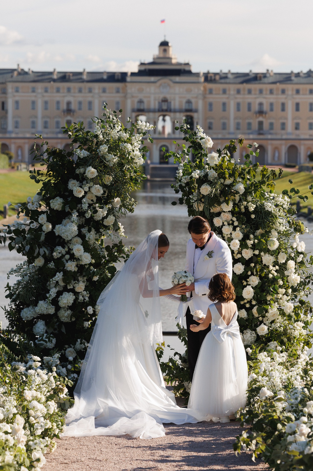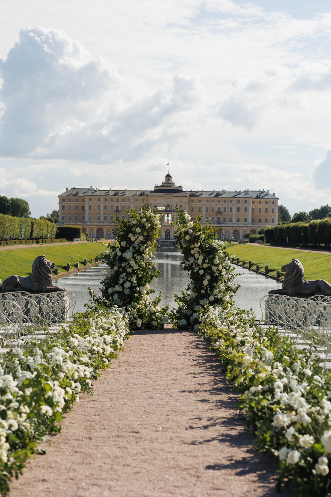Организация далась нам непросто. Мы точно знали, чего хотим: дворцовую эстетику, итальянское настроение, но с уважением к русским традициям. Аутентичность и изысканность были нашими главными ориентирами. Никакого пластика, искусственных, бутафорских материалов. Так, например, мы нашли старинные фотографии Константиновского дворца с кованой садовой мебелью на террасе и решили отыскать точно такие же стулья для церемонии. Декоратор закупил их под нас, и приехали они буквально за неделю до мероприятия.
