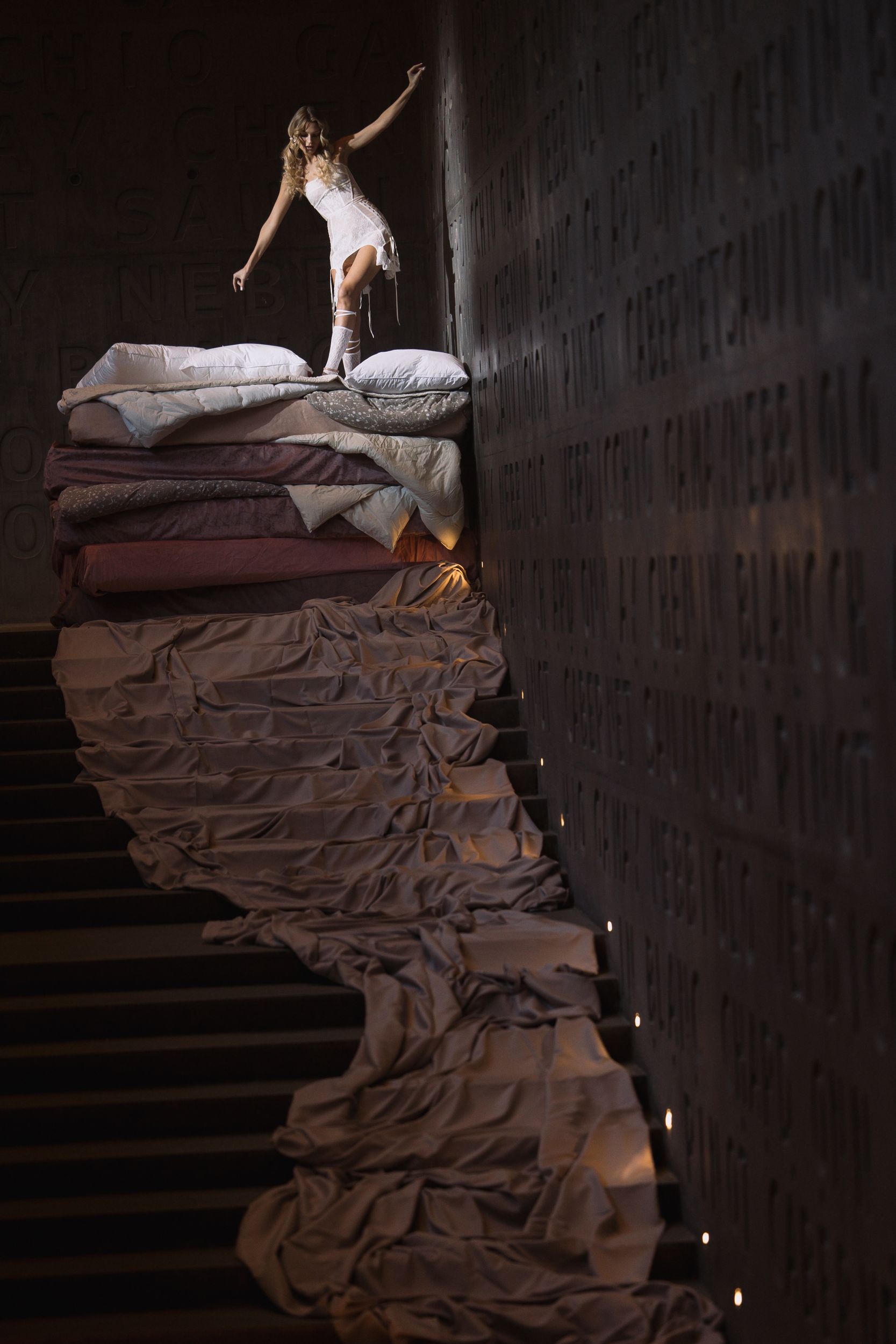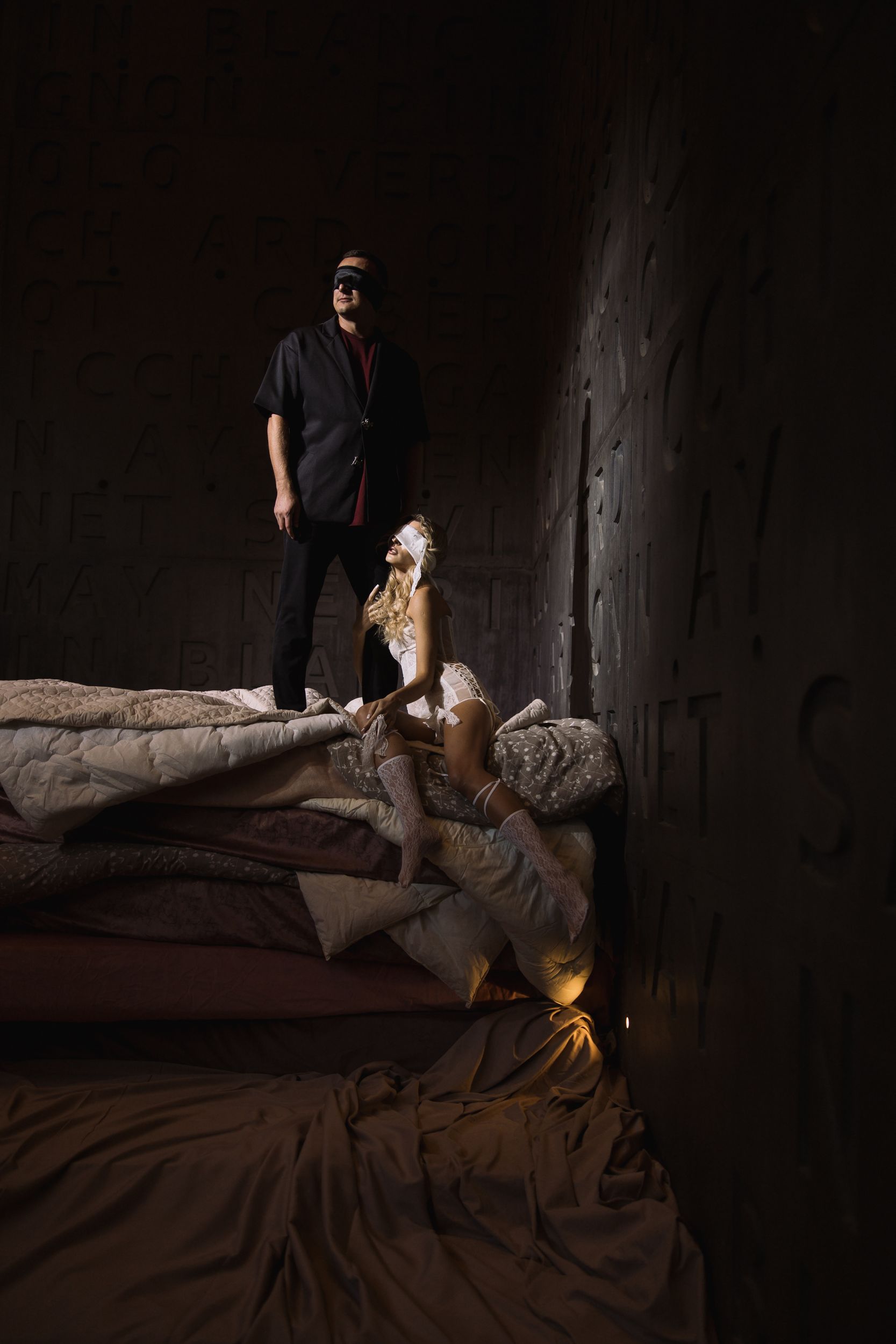 Мы погрузили их в детские мечты — то, о чём они мечтали так давно! Декоратор Анна сделала утрированно большую кровать, а я вписала в их образы элементы детства: хвостики, мальчишечий рукав, брюки длины 7/8, гольфы, смешные броши вместо пуговиц в виде собак, о которых они мечтают, туфли огромного размера, как из маминого гардероба.