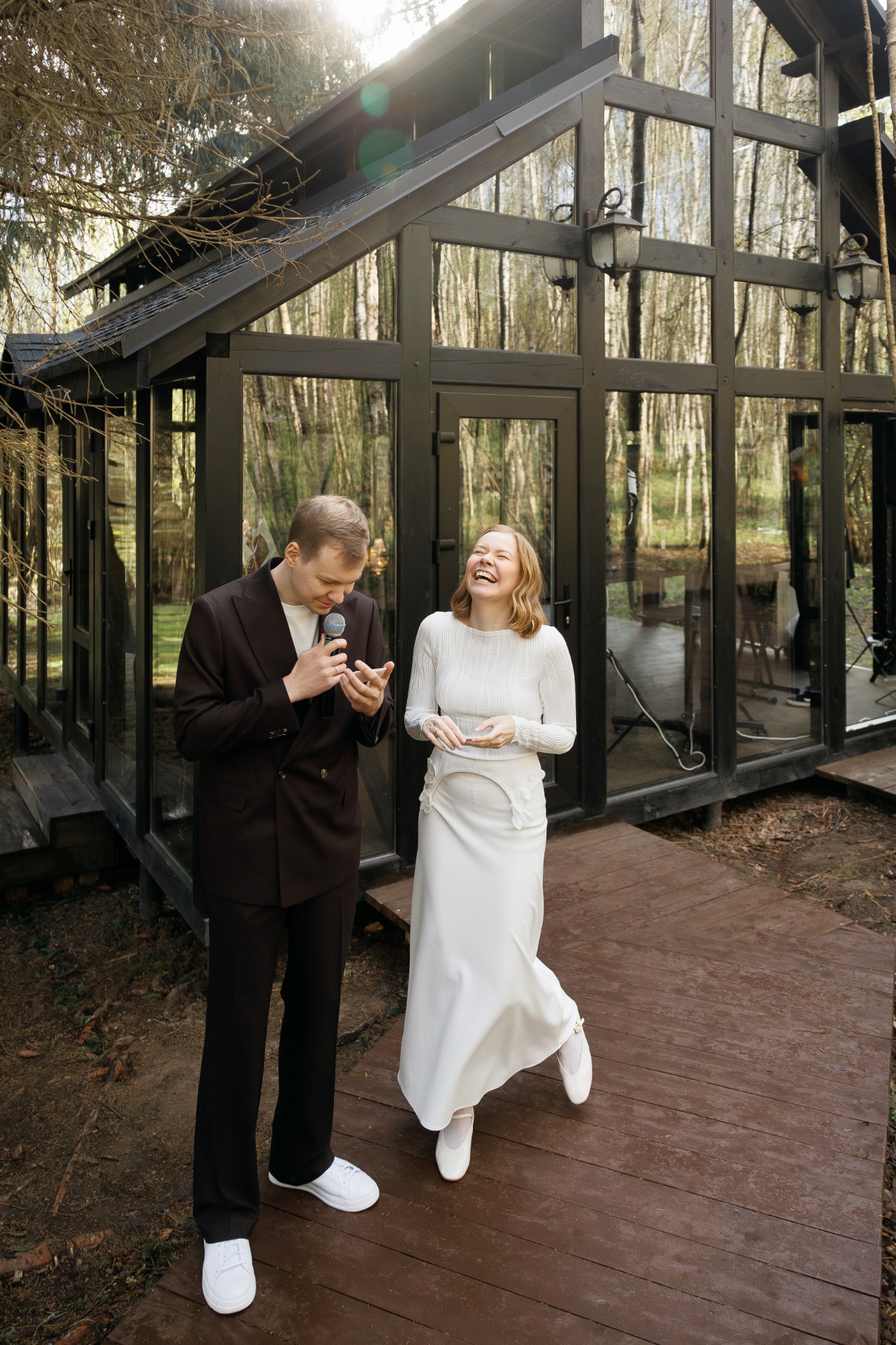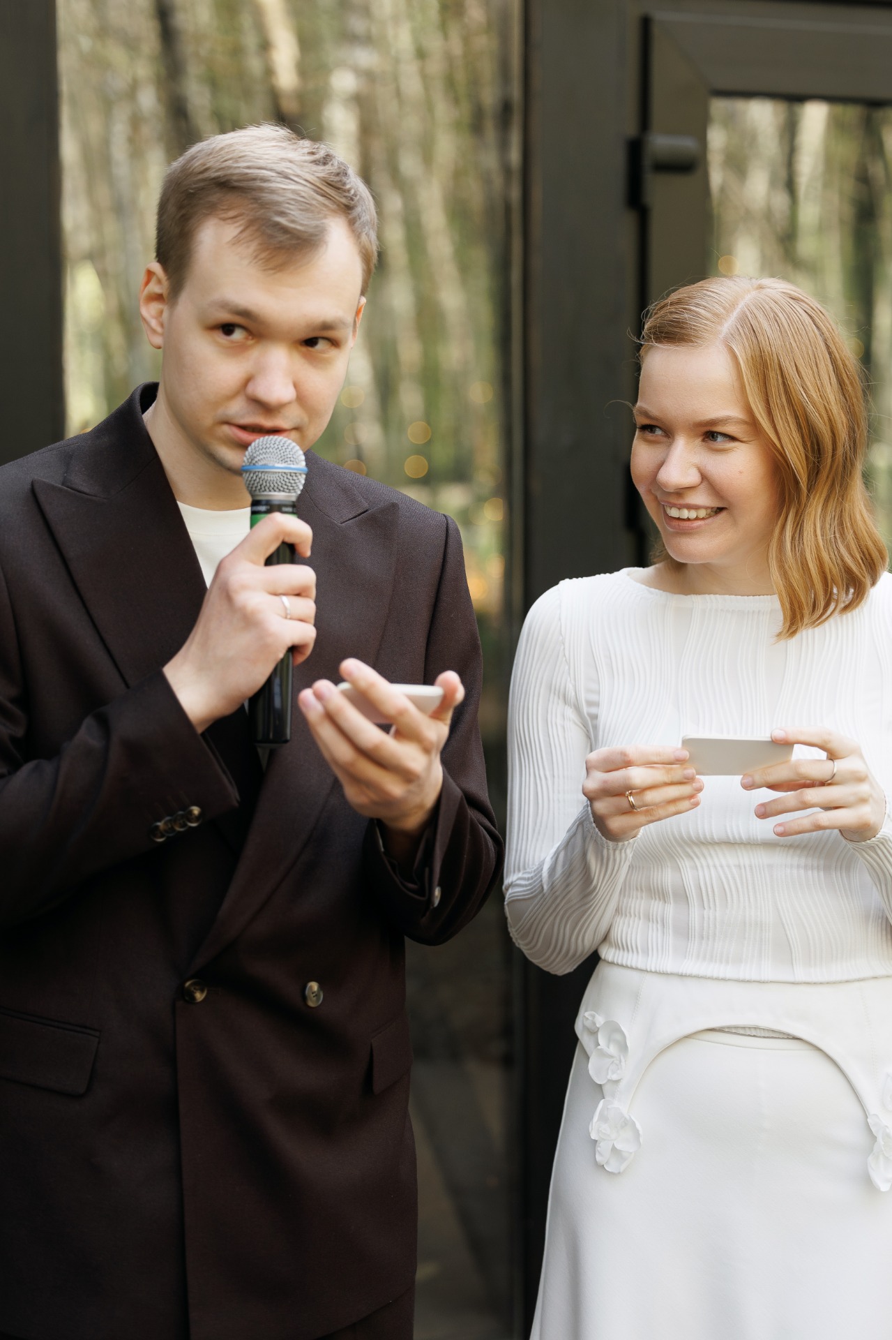 Мы решили отказаться от традиционного свадебного вечера, нам хотелось, чтобы всё было про лёгкость, веселье и атмосферу, а не только про нас. Вместо официальной церемонии были обещания, которые для нас написали гости, их мы скрепили нашим рукопожатием. Вместо криков «Горько!» были весёлые видео с пожеланиями.