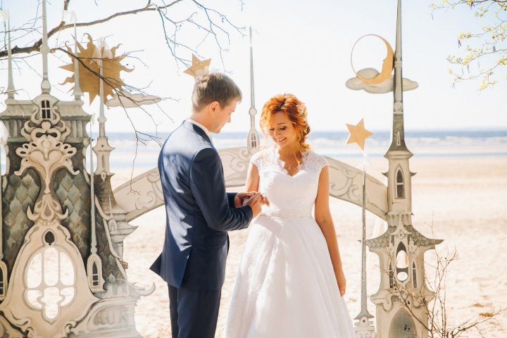 Волшебство в свадебных декорациях со сказочной аркой на фоне Финского залива.