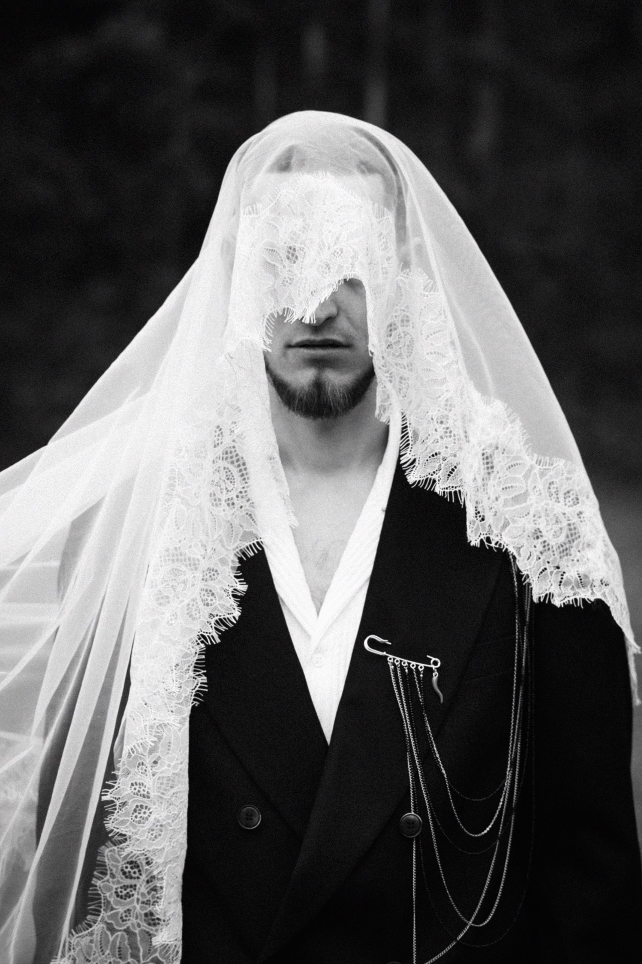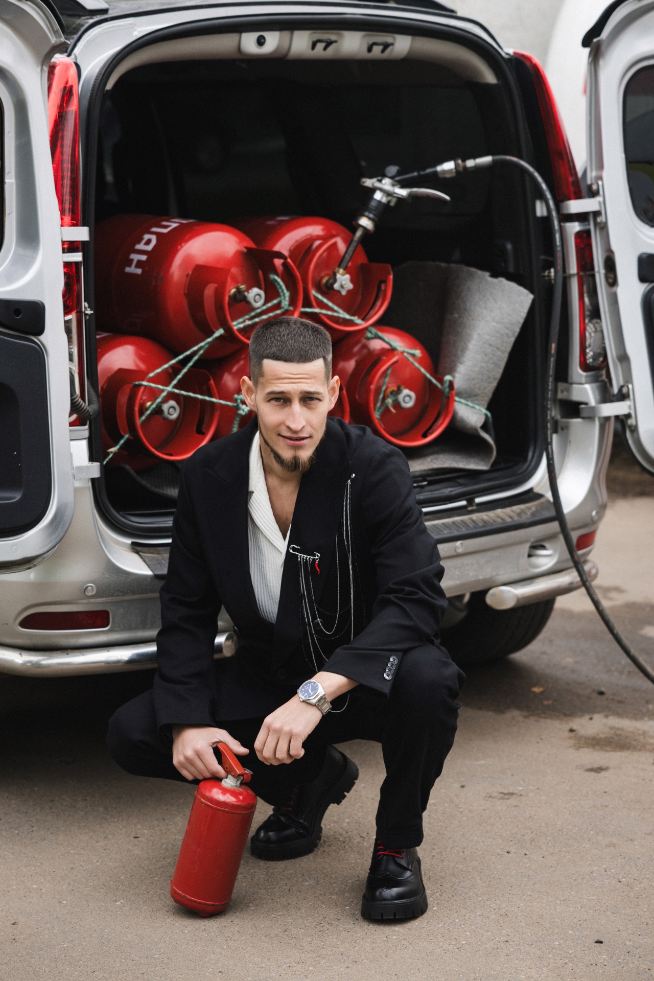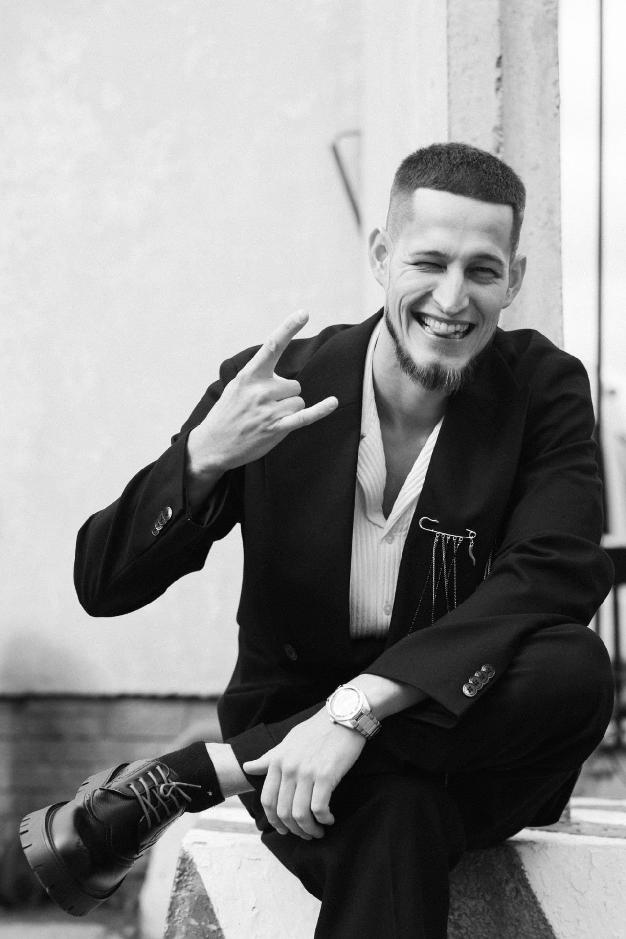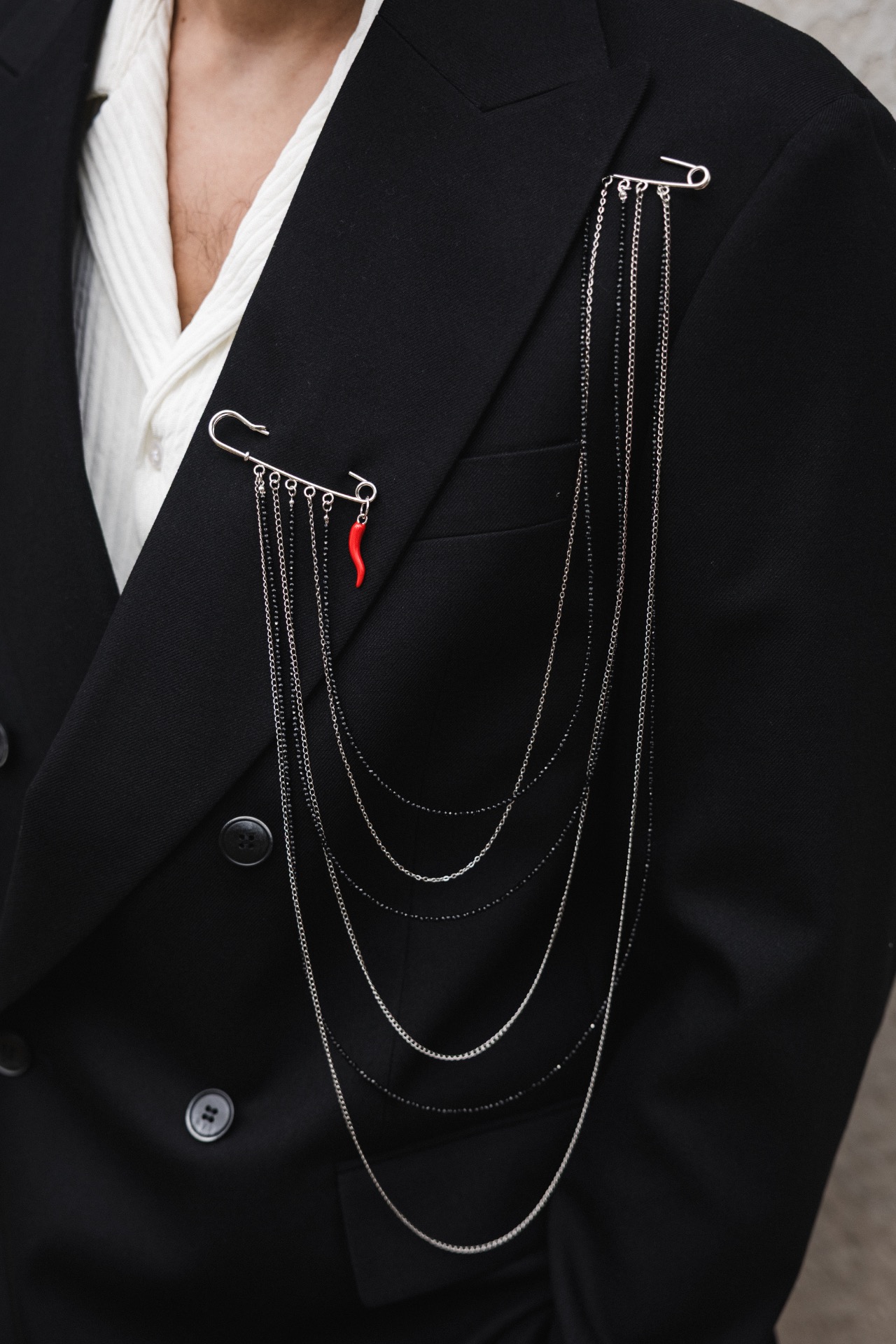 Руслан, как всегда, всё придумал сам. Он хотел чего-то бунтарского и нетипичного. И ему удалось найти идеальное решение. В качестве аксессуара он выбрал брошь с цепями и перцем, расслабленную рубашку и красные шнурки.