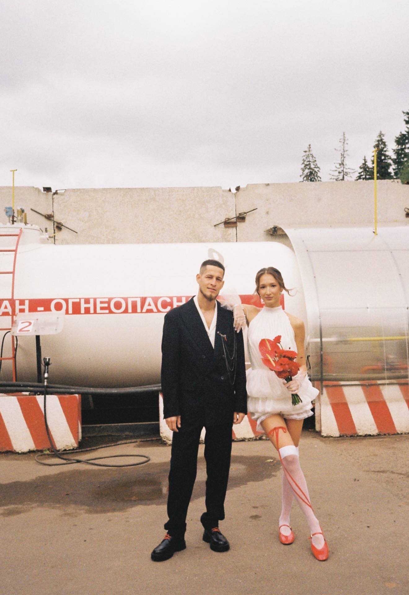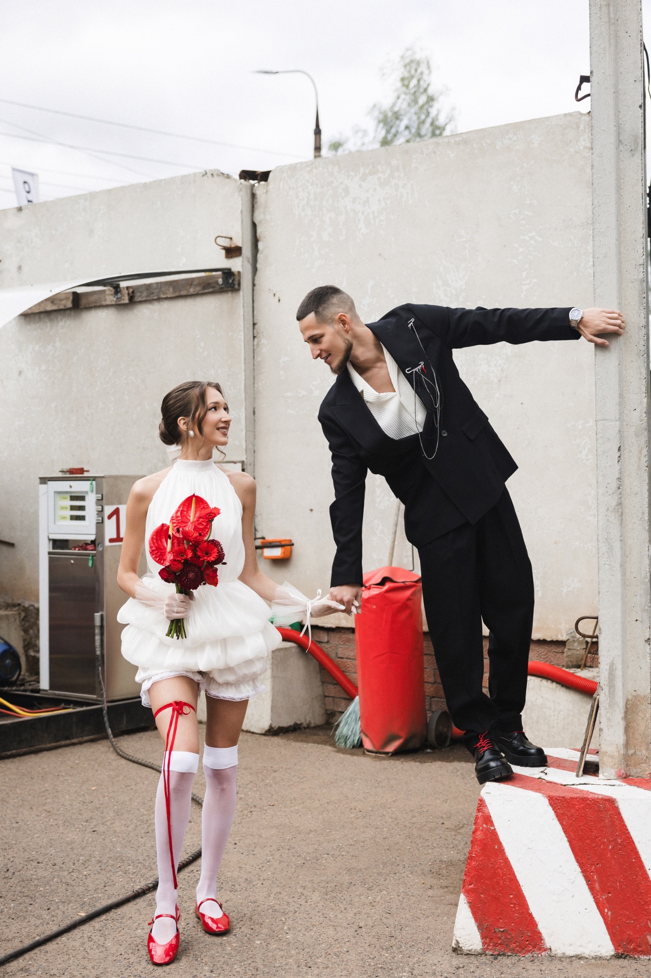 Торт мы решили сделать «горящим» в честь неугасающего огня между нами. А наш гениальный фотограф Диля придумала съёмку на заправке, с неоновой надписью «Огнеопасно».