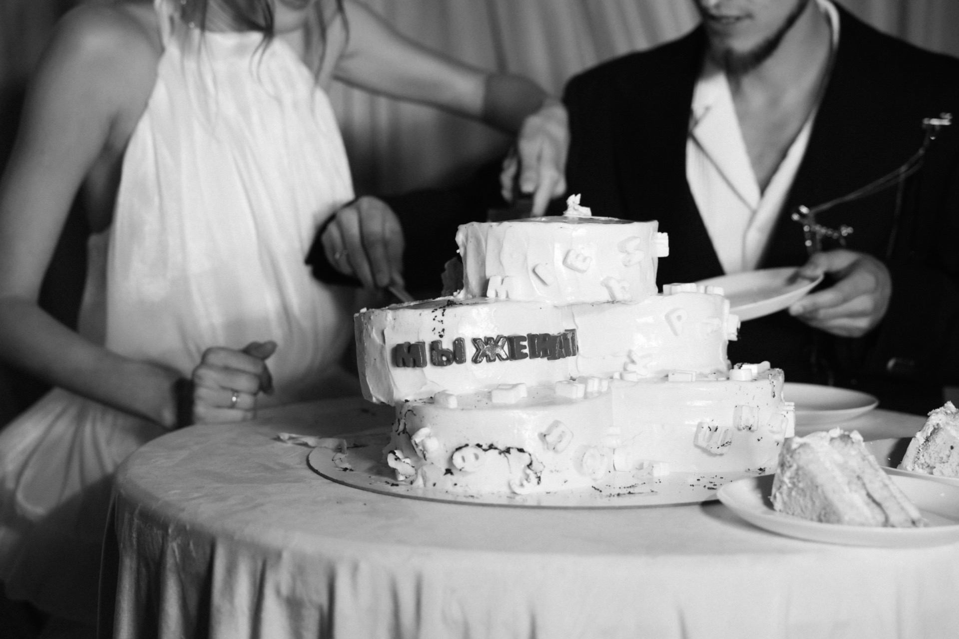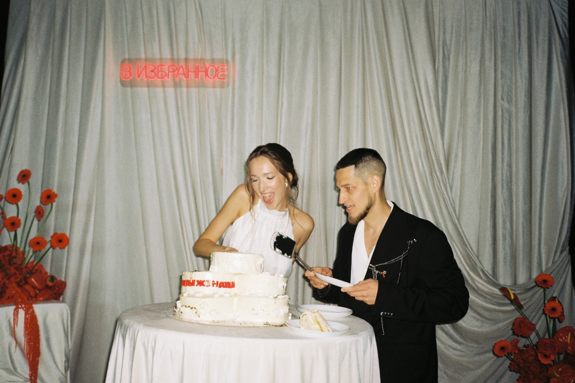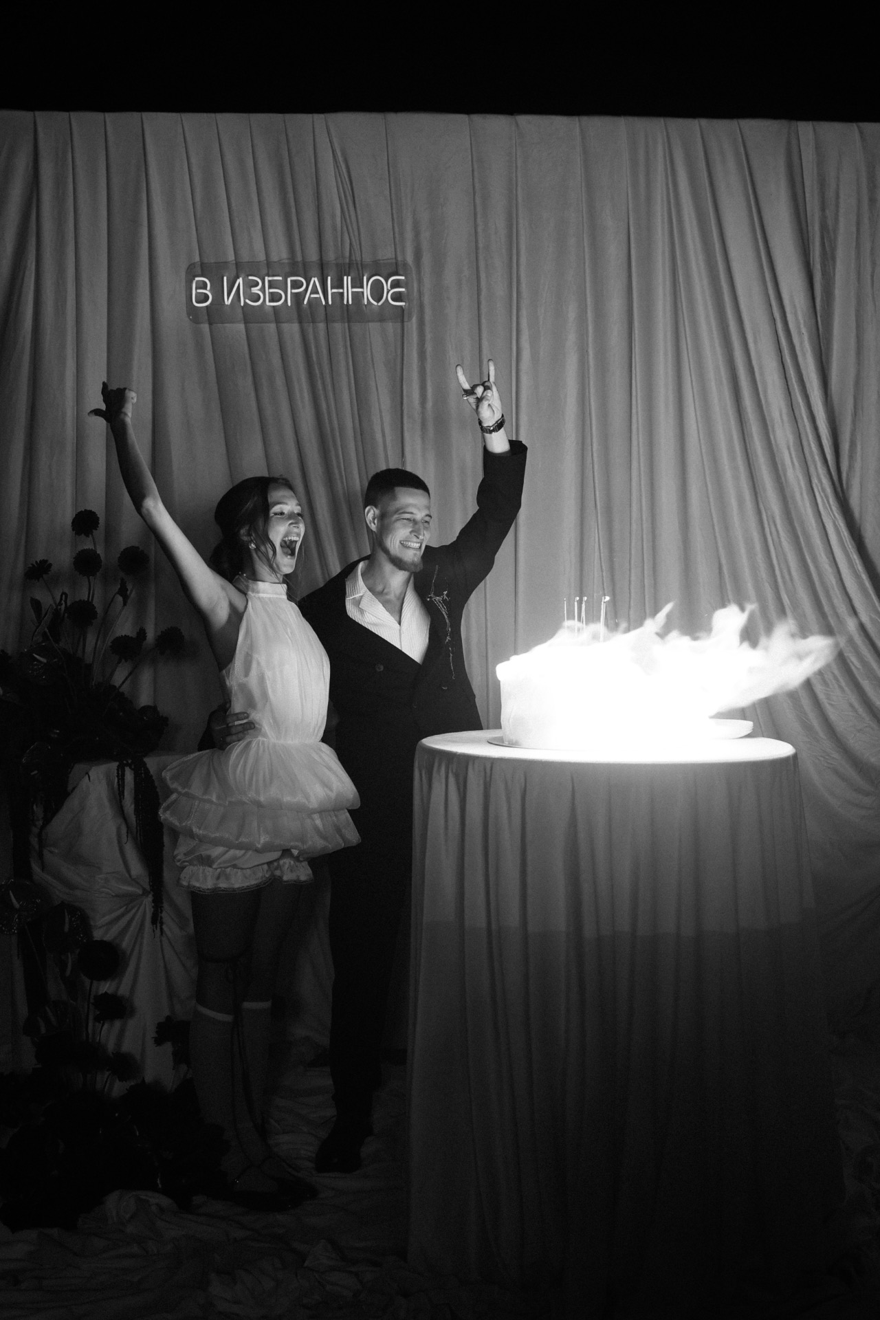 В финале вечера мы пригласили всех гостей в зону, где прошла наша церемония, чтобы вместе зажечь наш торт. Первые кусочки, как и фото на холсте с этого дня, мы подарили родителям. После церемонии разрезания торта мы включили небольшой ролик на проекторе, а в левом углу продолжала гореть вывеска «В избранное», как бы добавляя каждый кадр этого видео в копилку лучших воспоминаний.