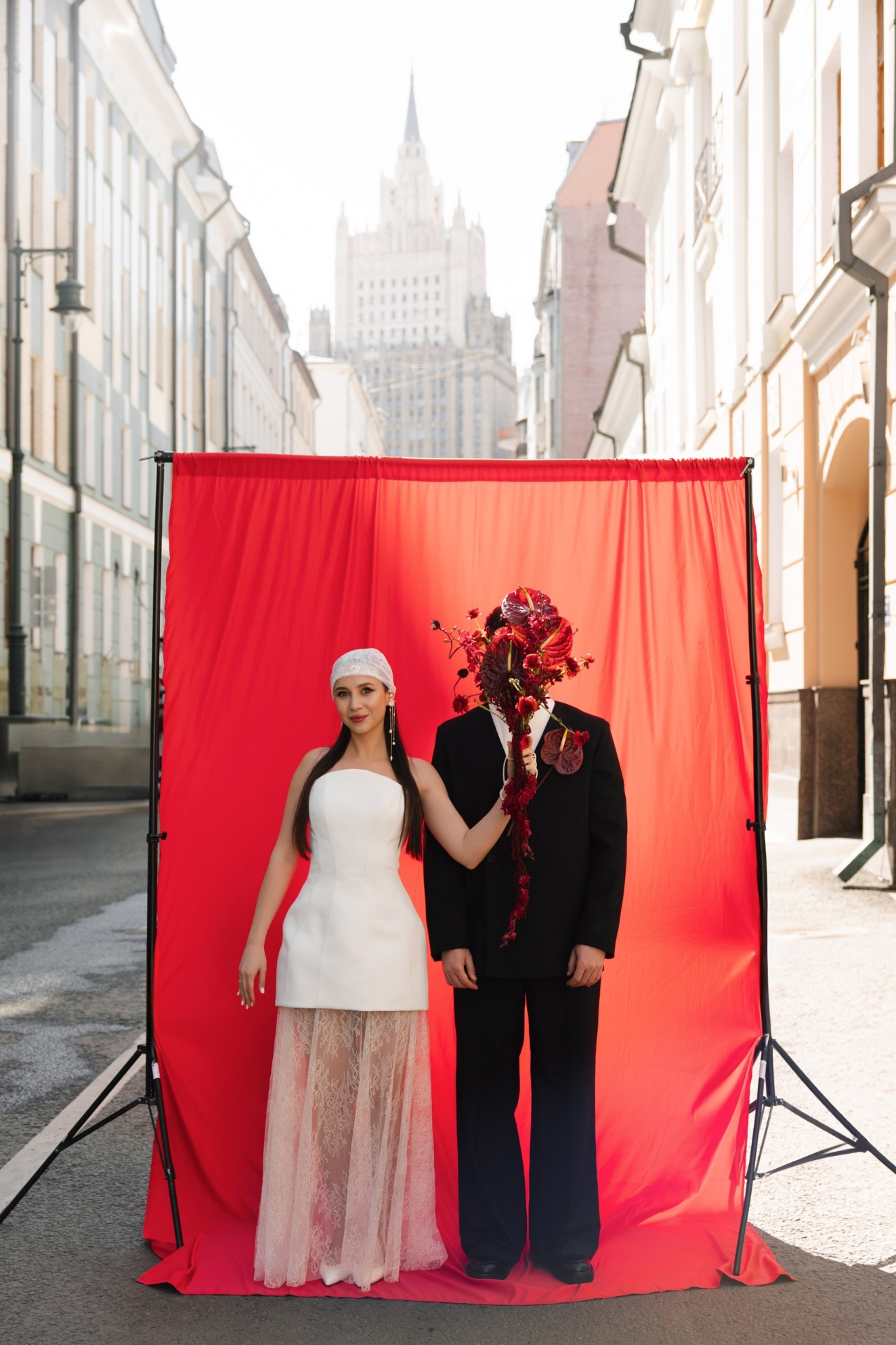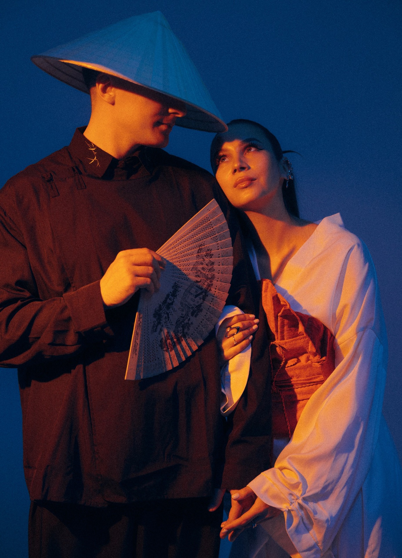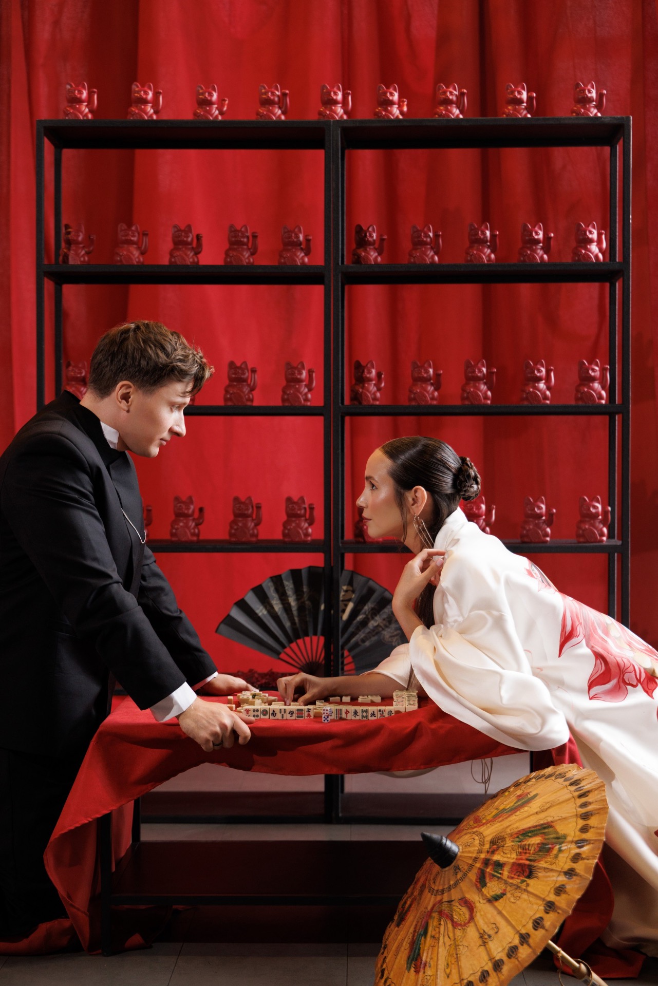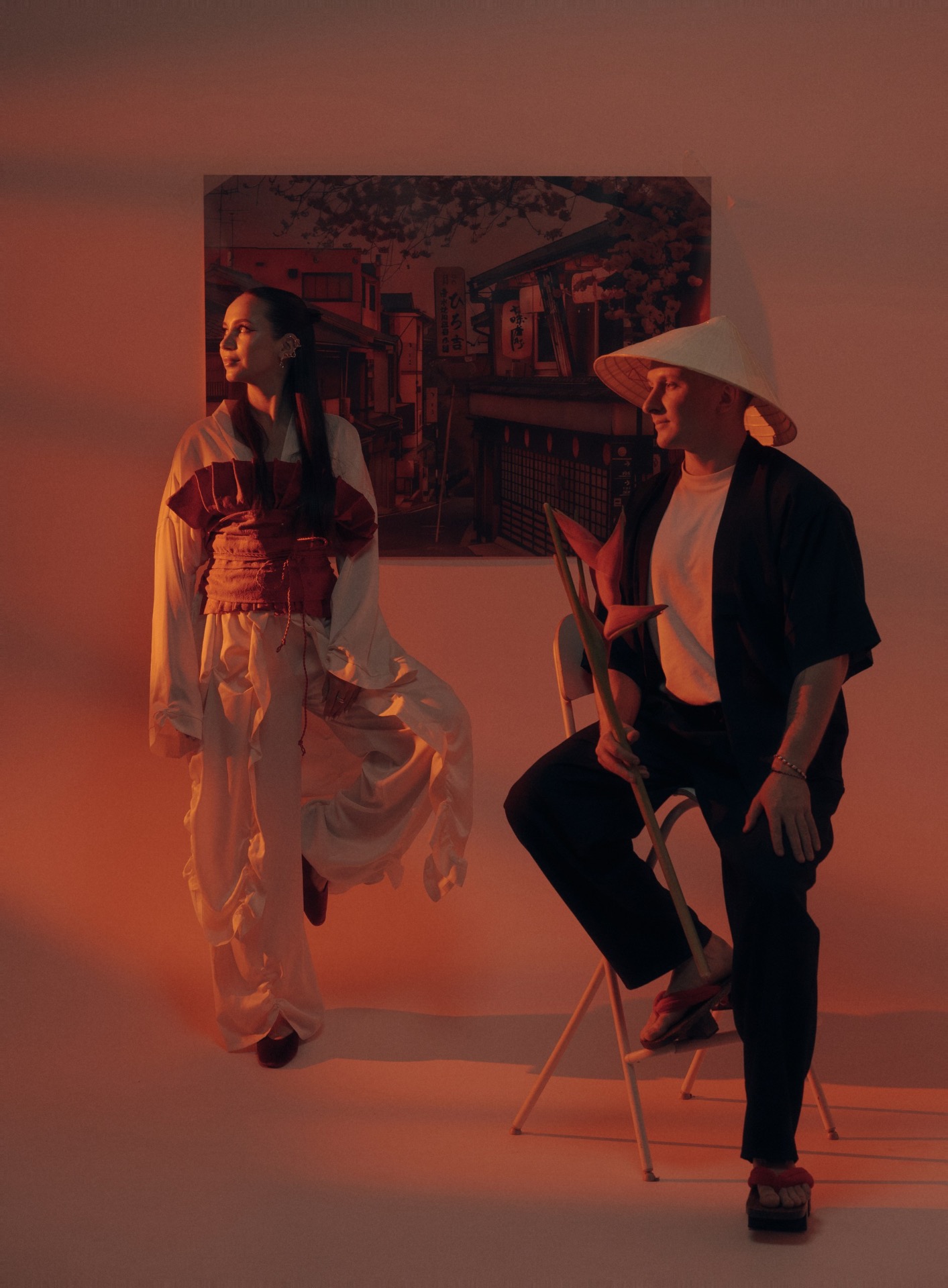 Для предсвадебной фотосессии Ася предложила яркие, смелые азиатские образы: макияж со стрелками, красный корсет, кимоно и конусные шляпки.