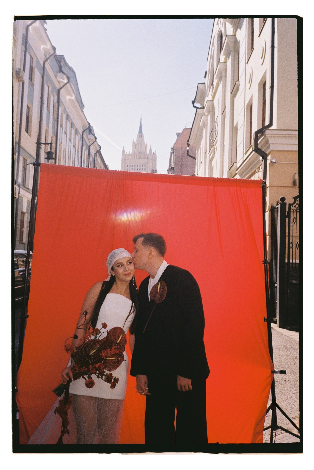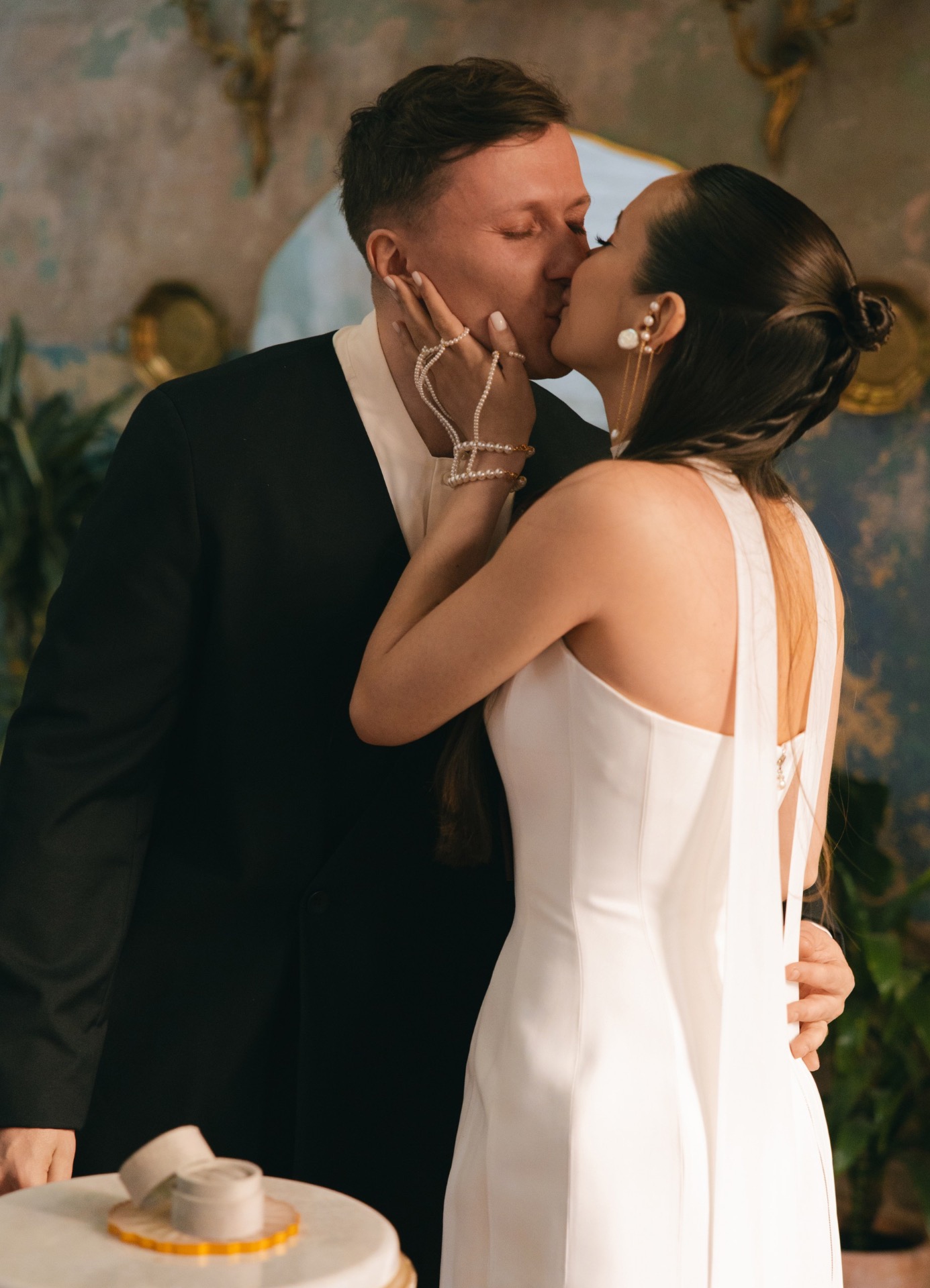 На регистрацию мы выбрали для меня минималистичное платье из Seashell и бандану вместо фаты — лёгкую и современную деталь. Севе мы купили костюм на запах в 31GATE, который идеально вписался в нашу эстетику.