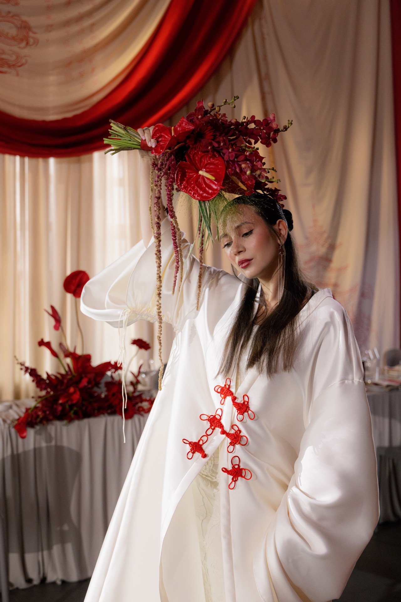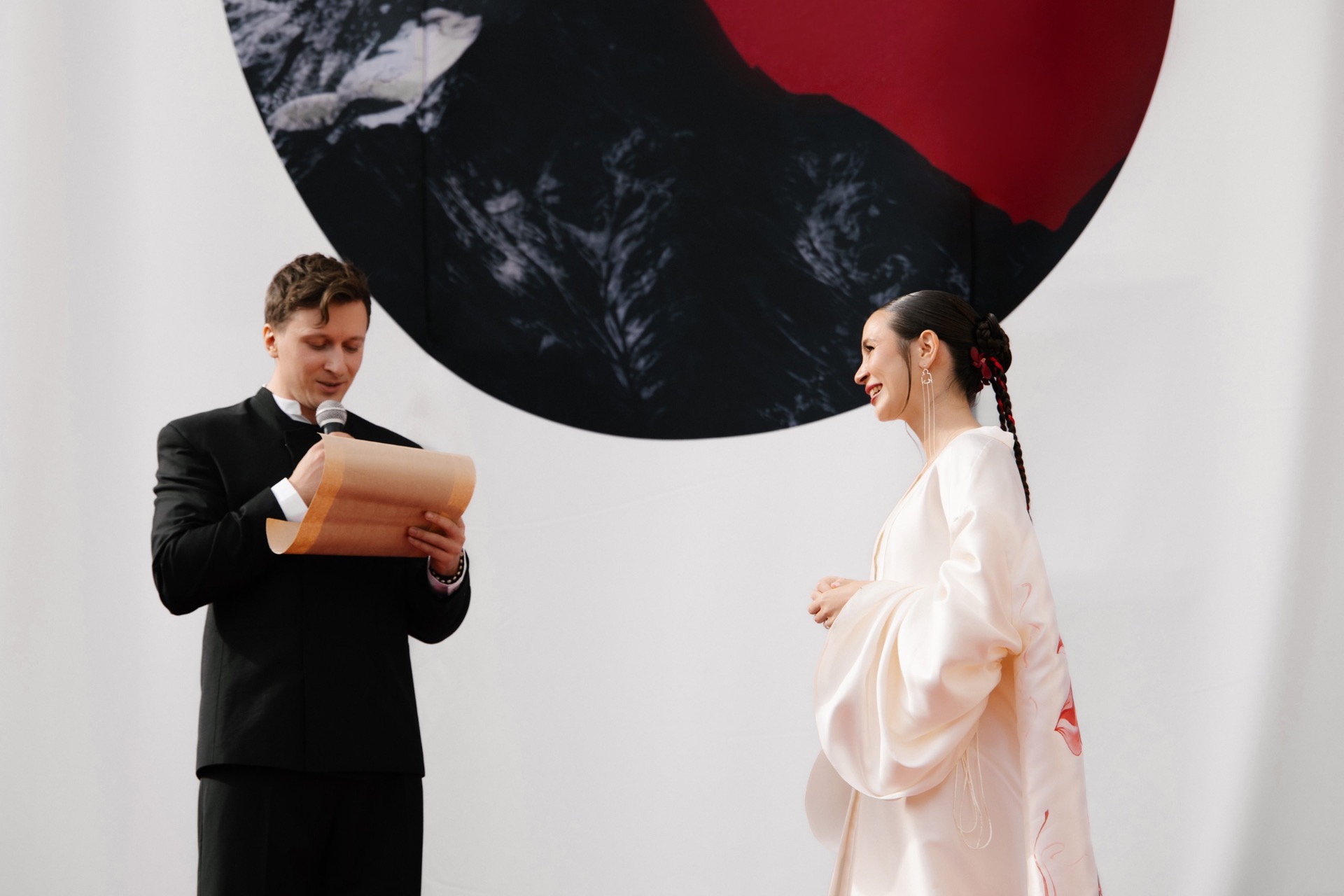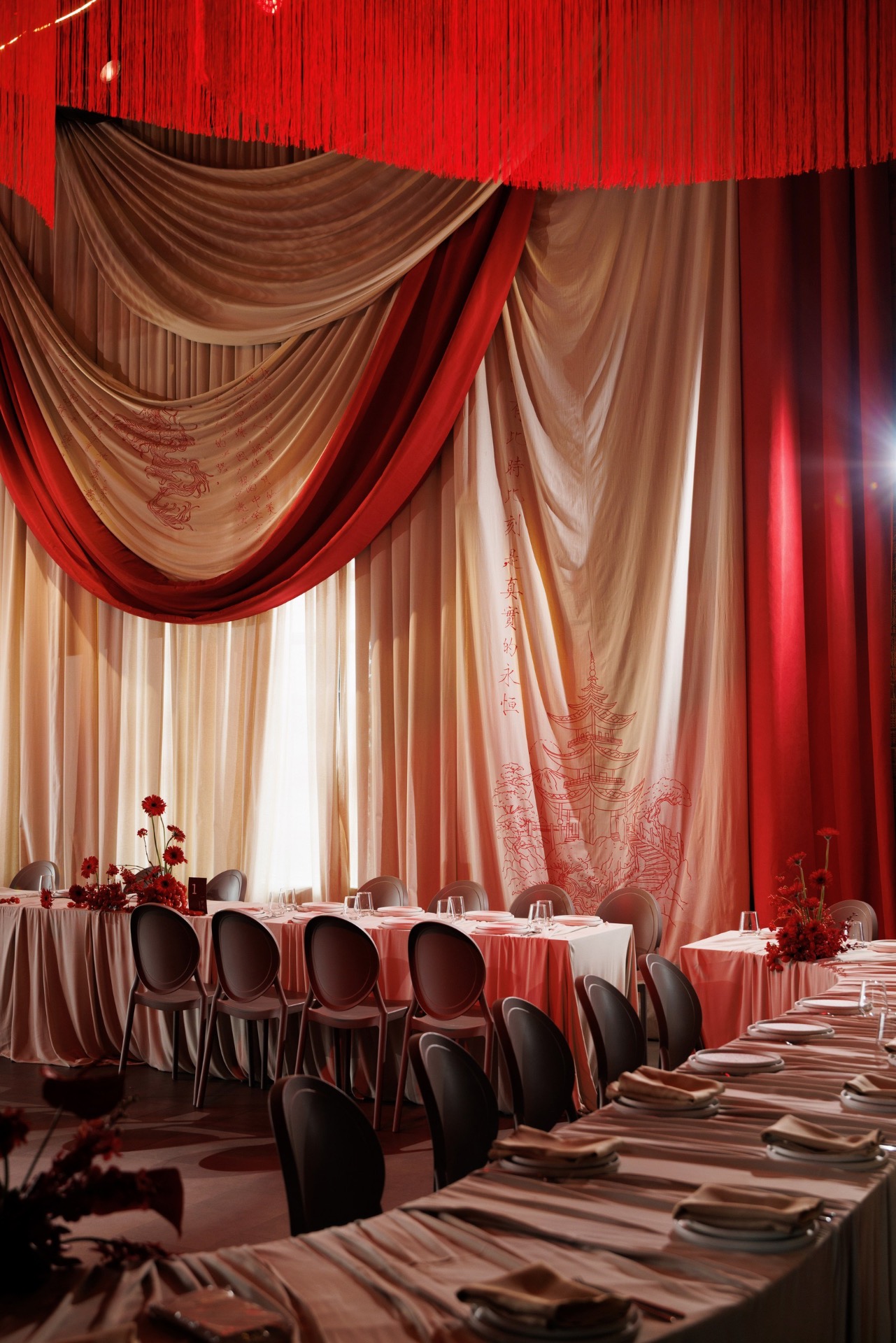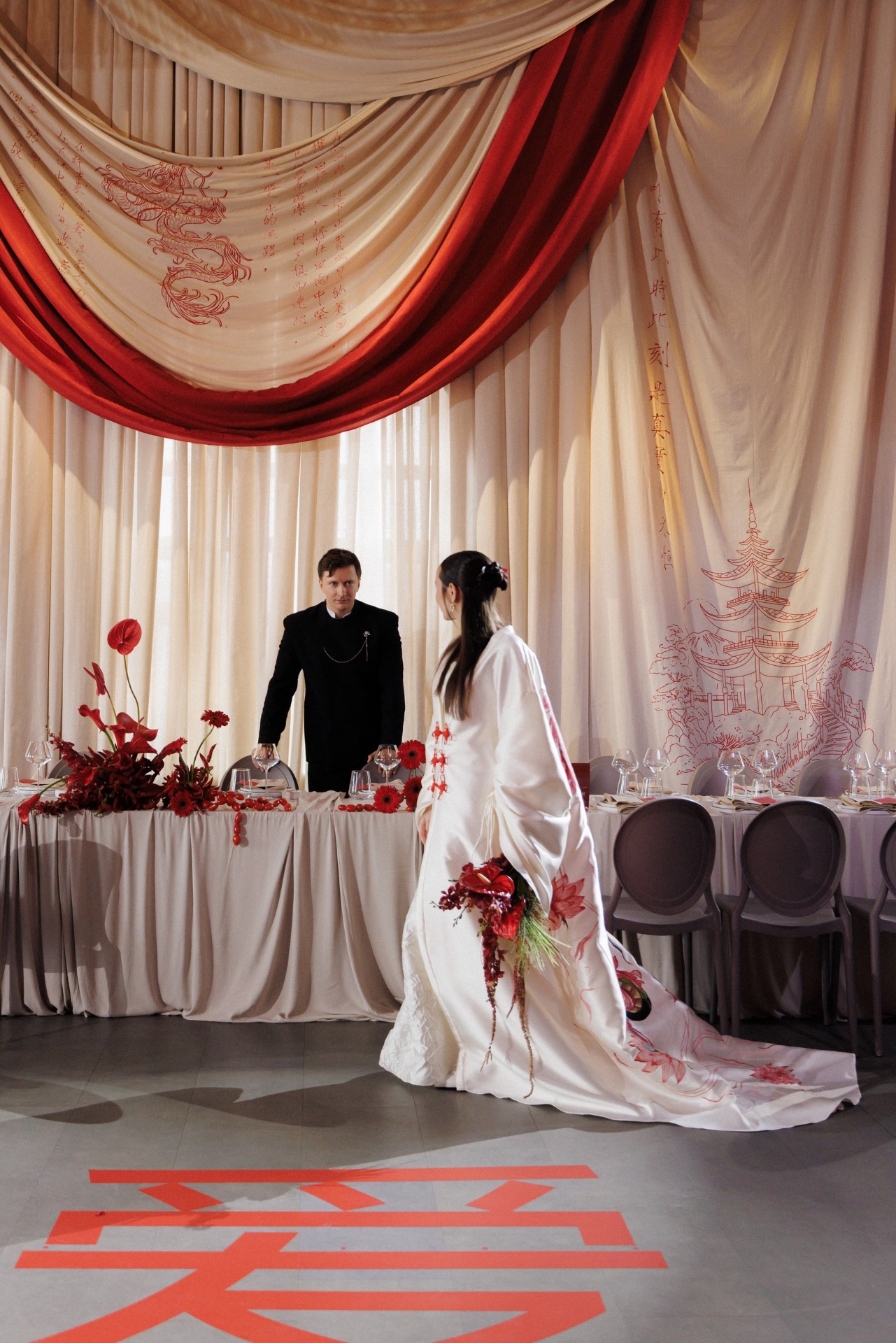 Мы выбрали насыщенный красный цвет, который привёл нас к китайской эстетике. Главным символом стал круг — знак гармонии. Декораторы предложили яркие решения: большое полотно с кругом и горами на церемонии, круглый подиум, красную ткань на полу. В зале — потолок из красной кисеи, напоминающий дракона, и полотна, похожие на летописи. Флористика была полностью красной — с мини-помидорами, перчиками и редкими азиатскими растениями.