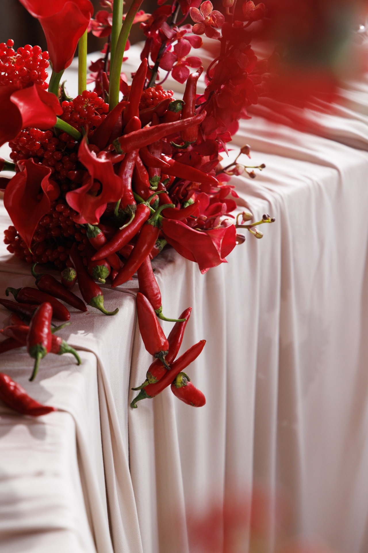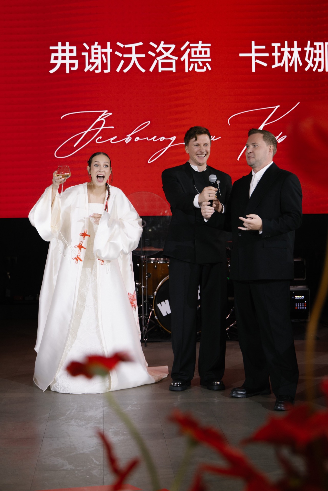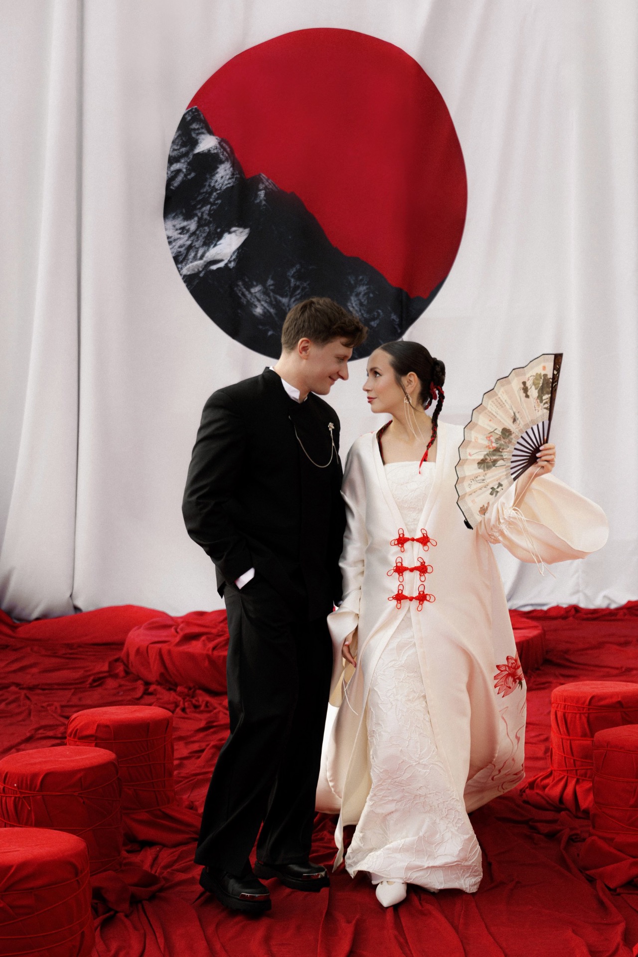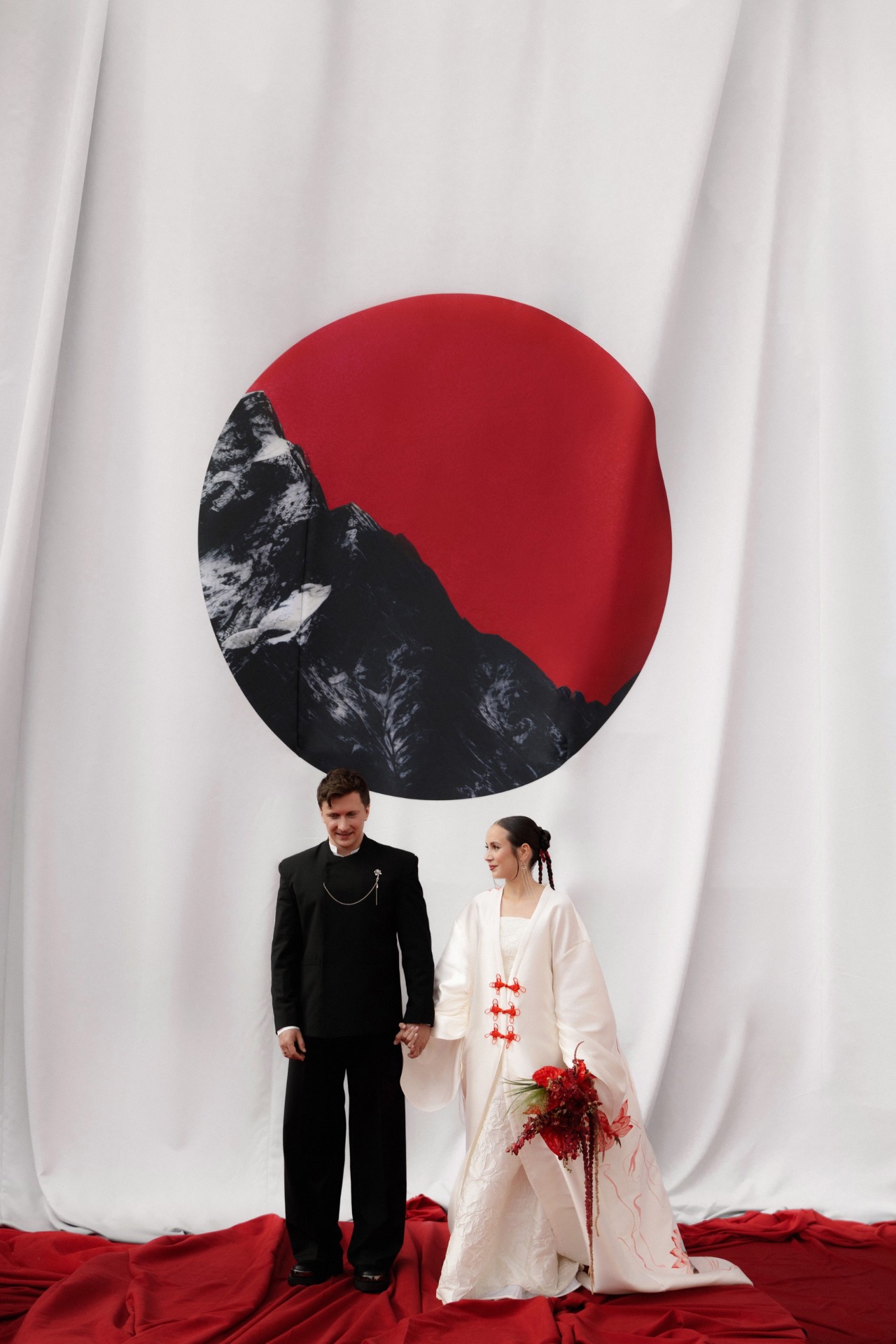 Мы выбрали насыщенный красный цвет, который привёл нас к китайской эстетике. Главным символом стал круг — знак гармонии. Декораторы предложили яркие решения: большое полотно с кругом и горами на церемонии, круглый подиум, красную ткань на полу. В зале — потолок из красной кисеи, напоминающий дракона, и полотна, похожие на летописи. Флористика была полностью красной — с мини-помидорами, перчиками и редкими азиатскими растениями.