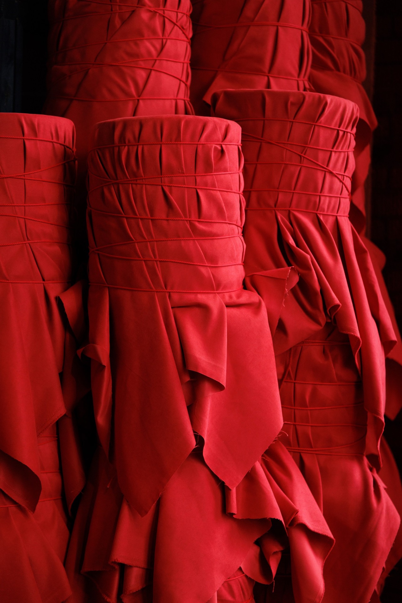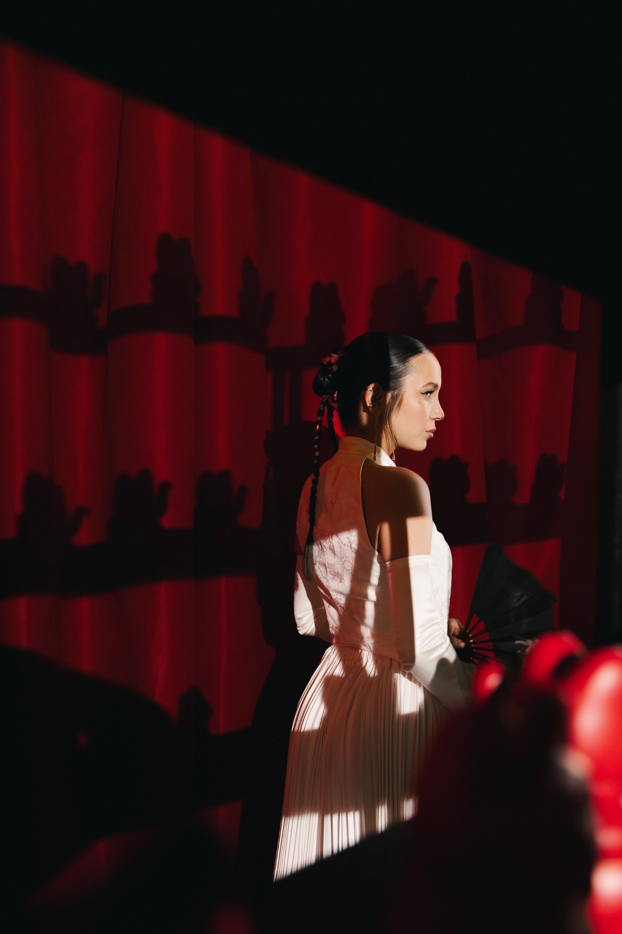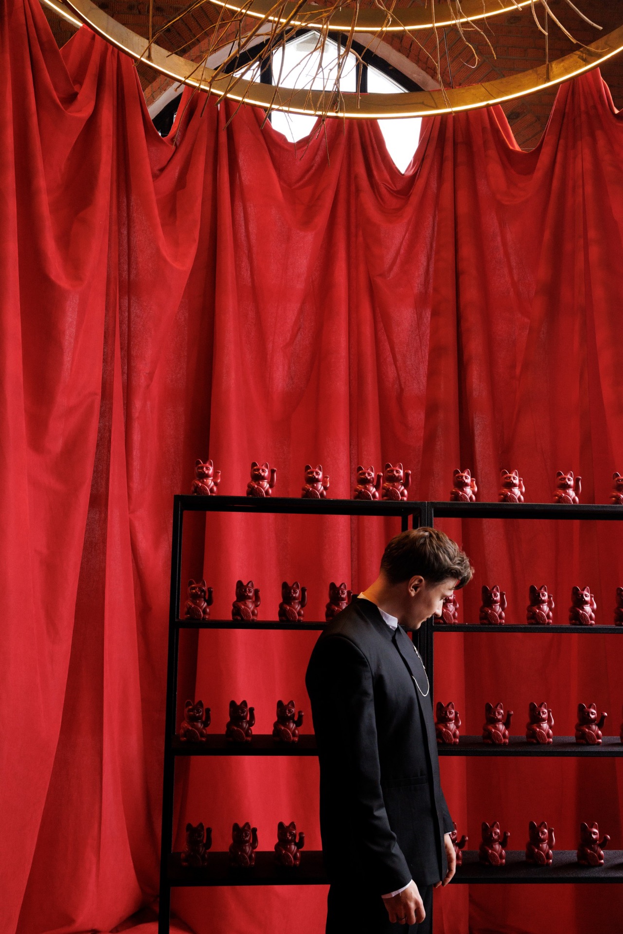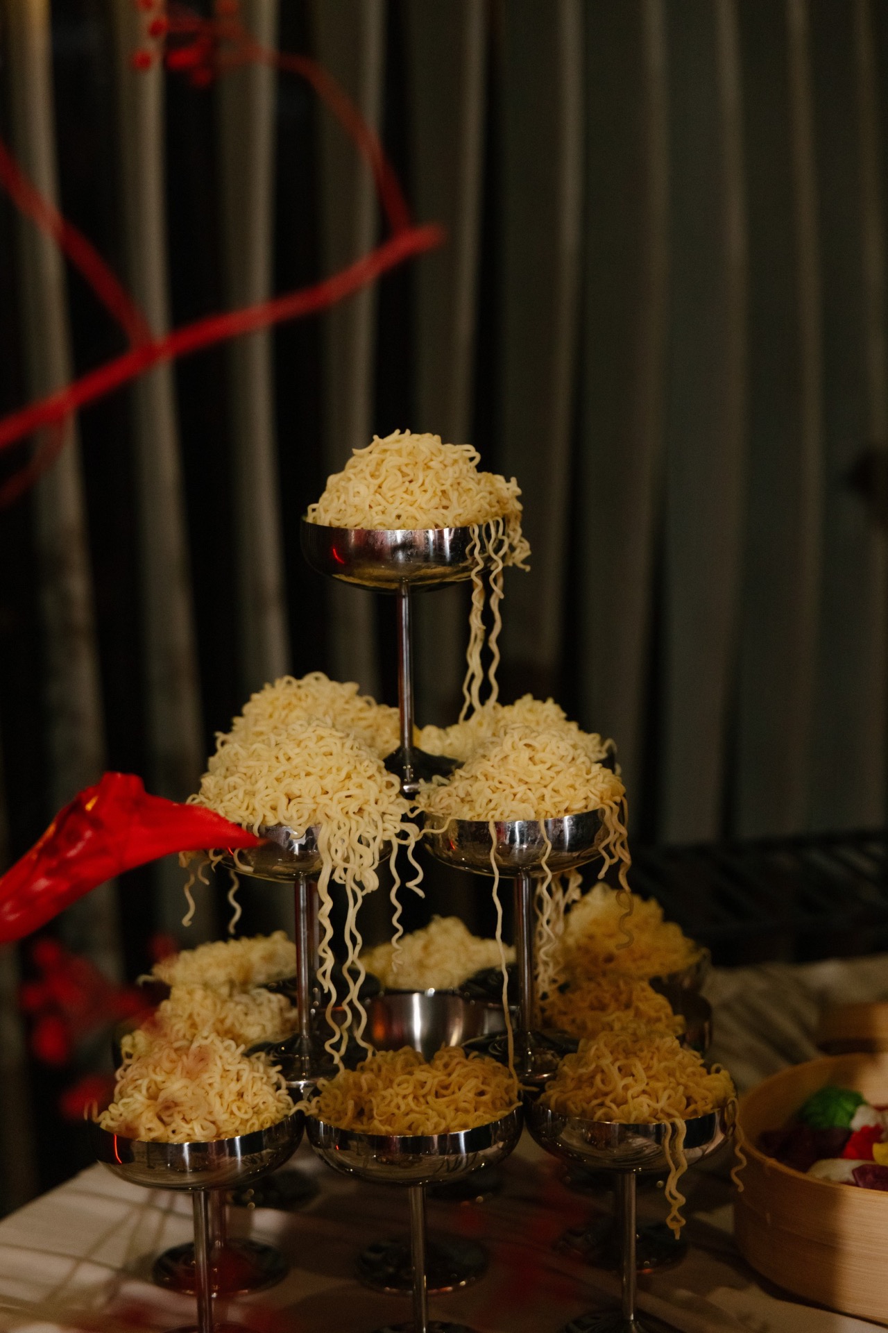 Мы выбрали насыщенный красный цвет, который привёл нас к китайской эстетике. Главным символом стал круг — знак гармонии. Декораторы предложили яркие решения: большое полотно с кругом и горами на церемонии, круглый подиум, красную ткань на полу. В зале — потолок из красной кисеи, напоминающий дракона, и полотна, похожие на летописи. Флористика была полностью красной — с мини-помидорами, перчиками и редкими азиатскими растениями.