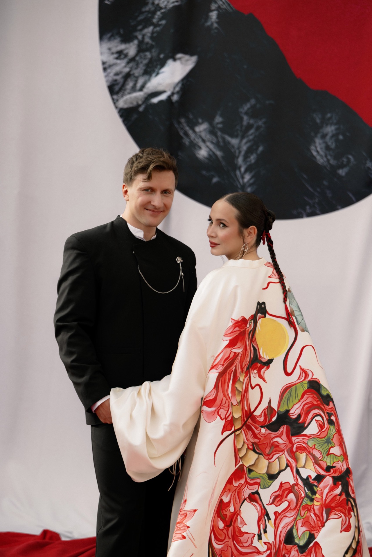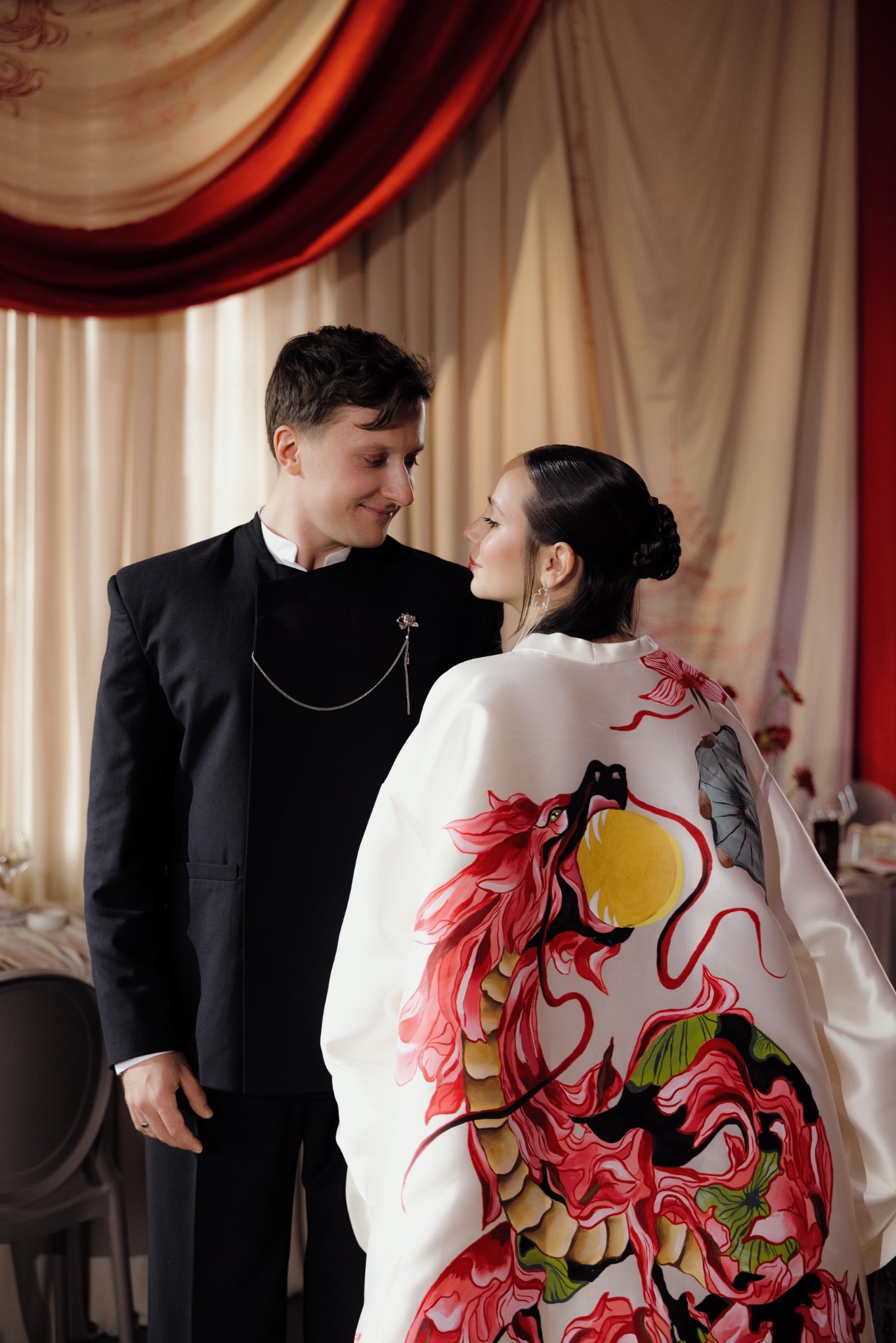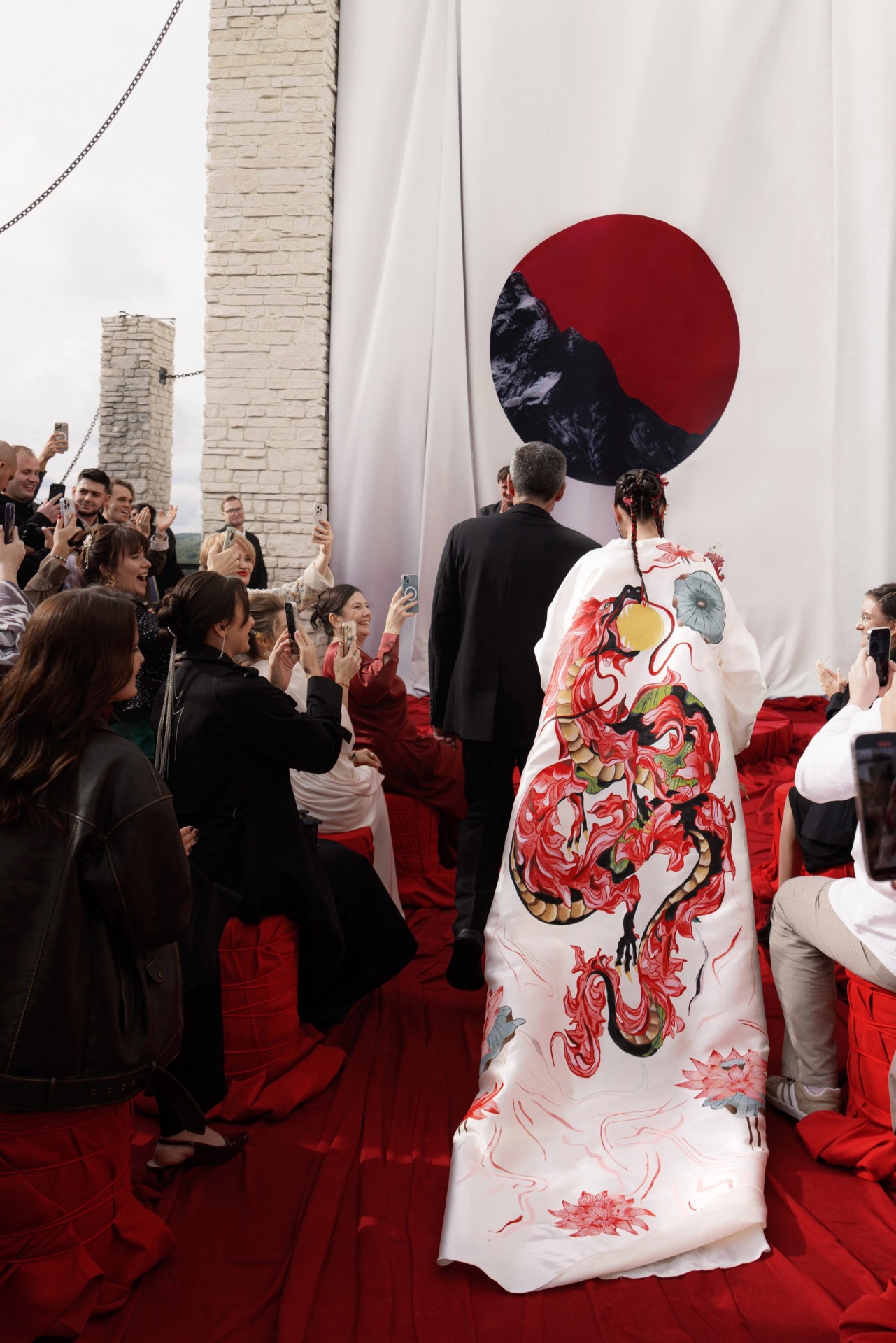 В момент церемонии главным элементом моего наряда стал кейп с ручной росписью дракона — акцент, который сразу создавал связь с концепцией.
