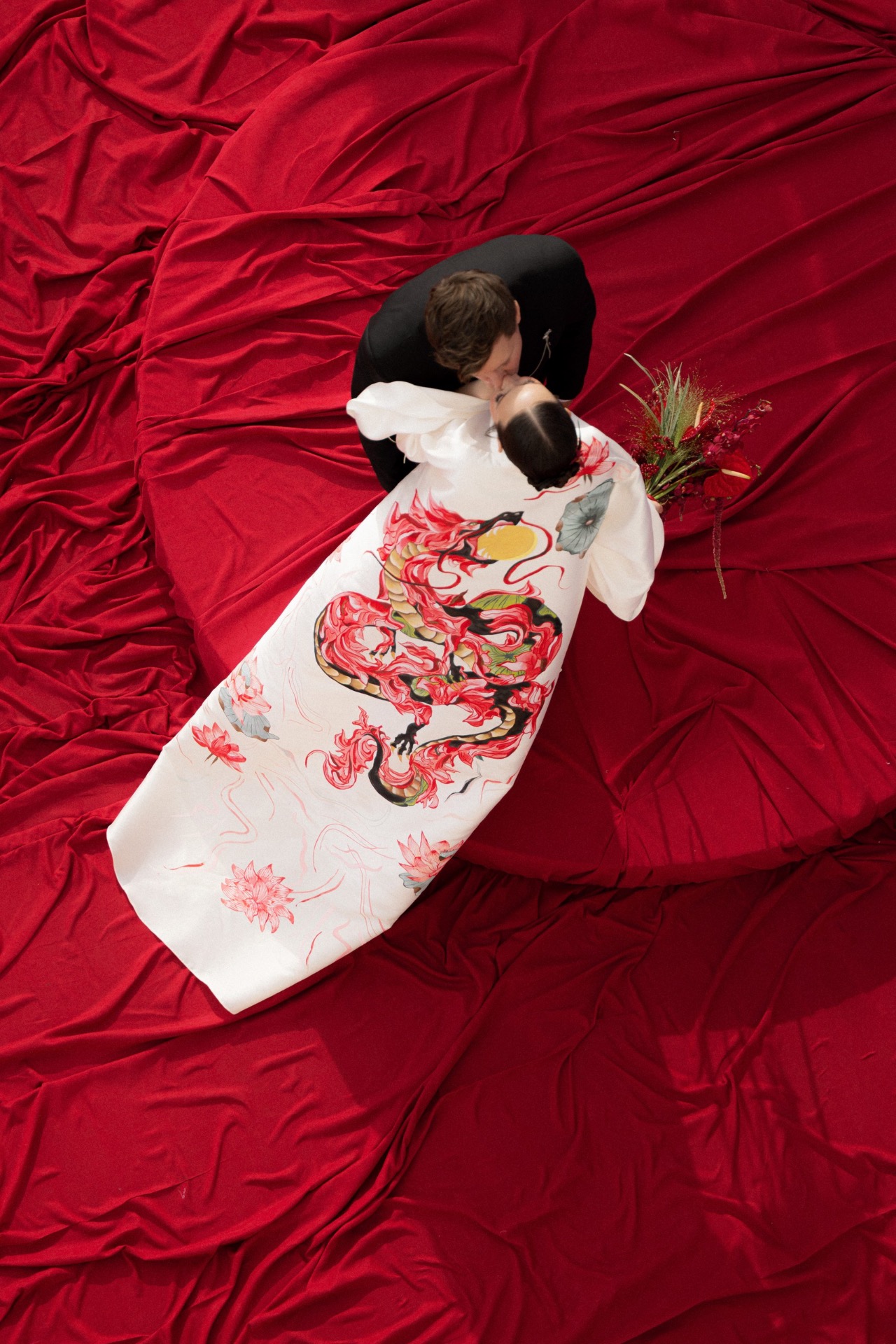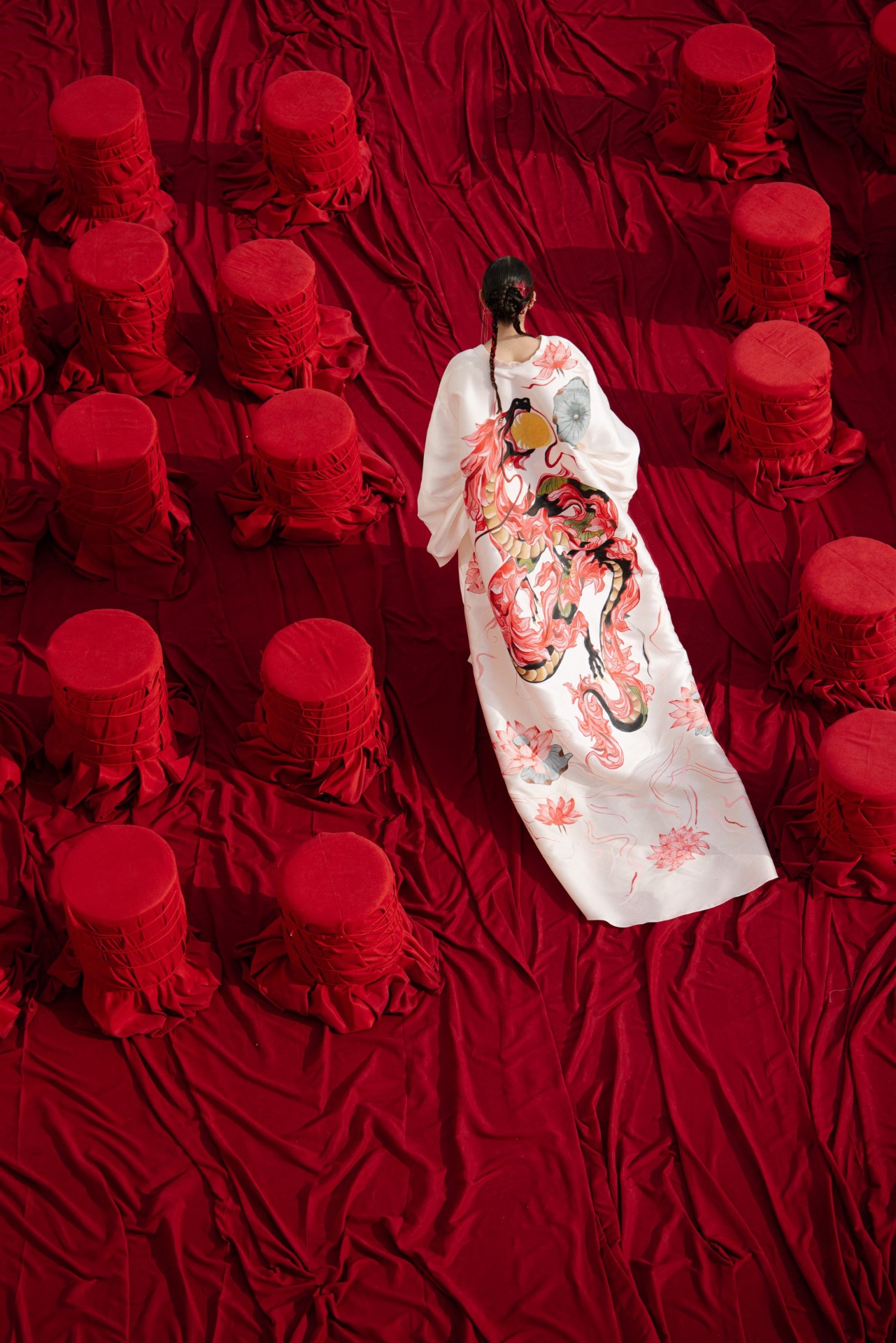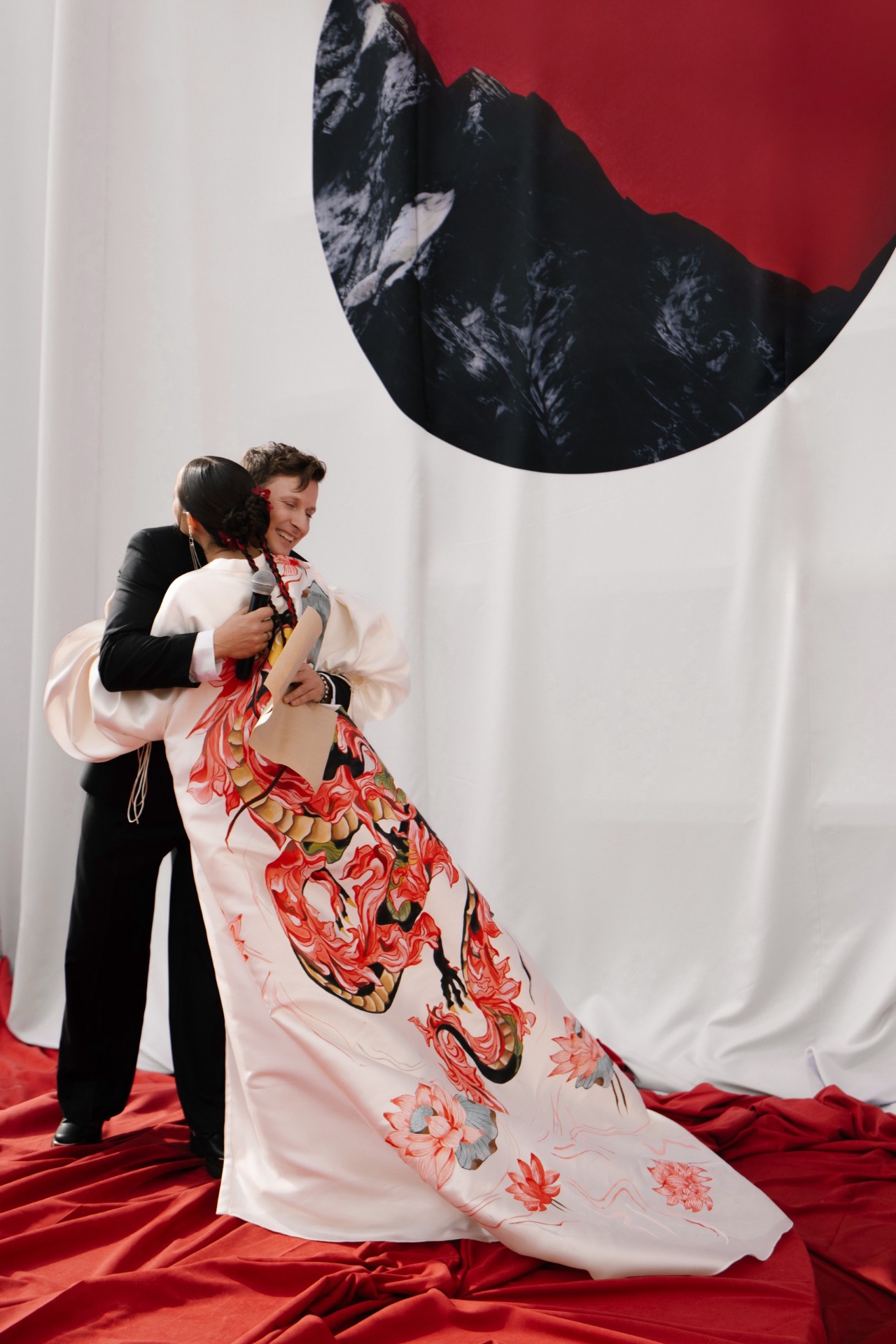 В момент церемонии главным элементом моего наряда стал кейп с ручной росписью дракона — акцент, который сразу создавал связь с концепцией.