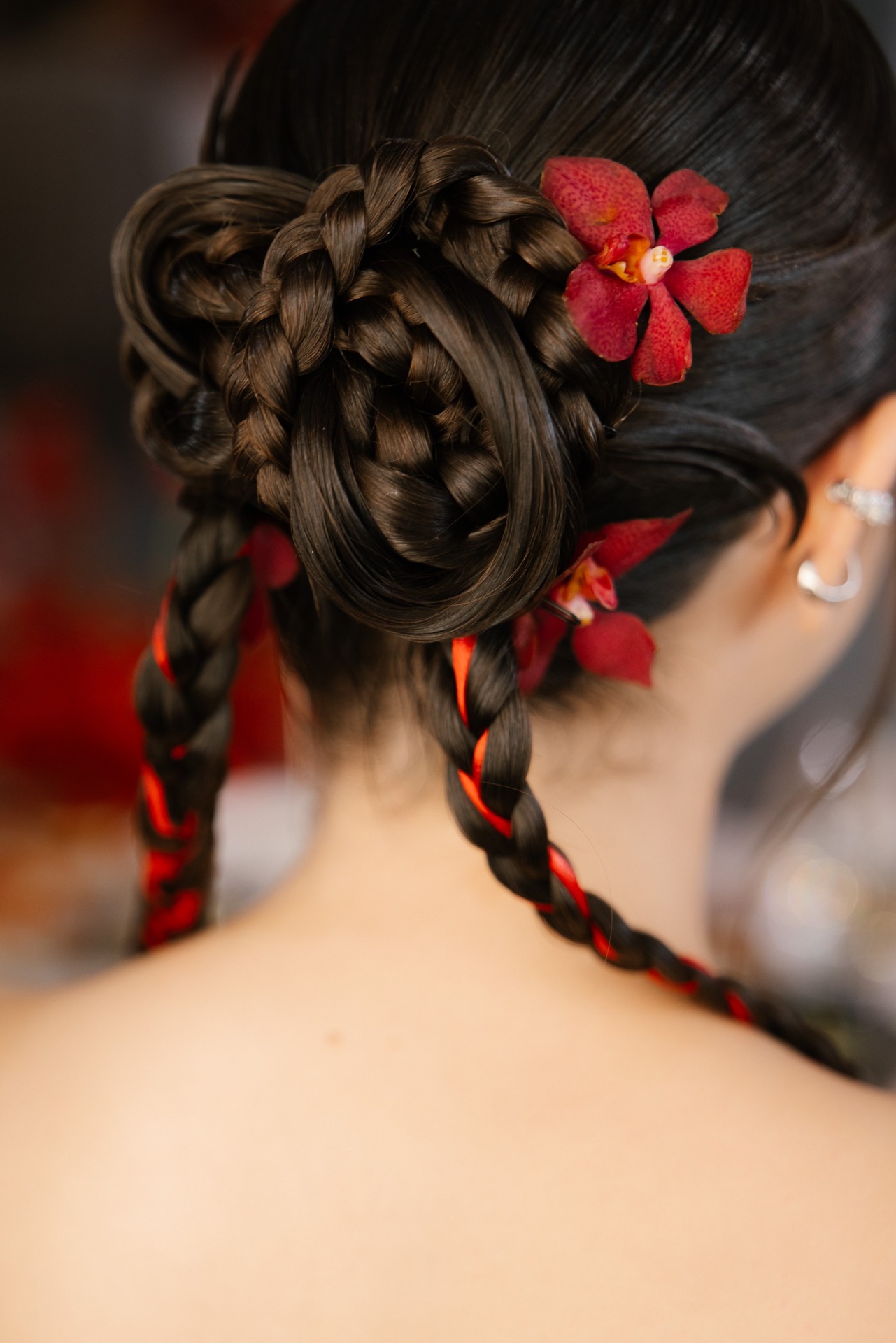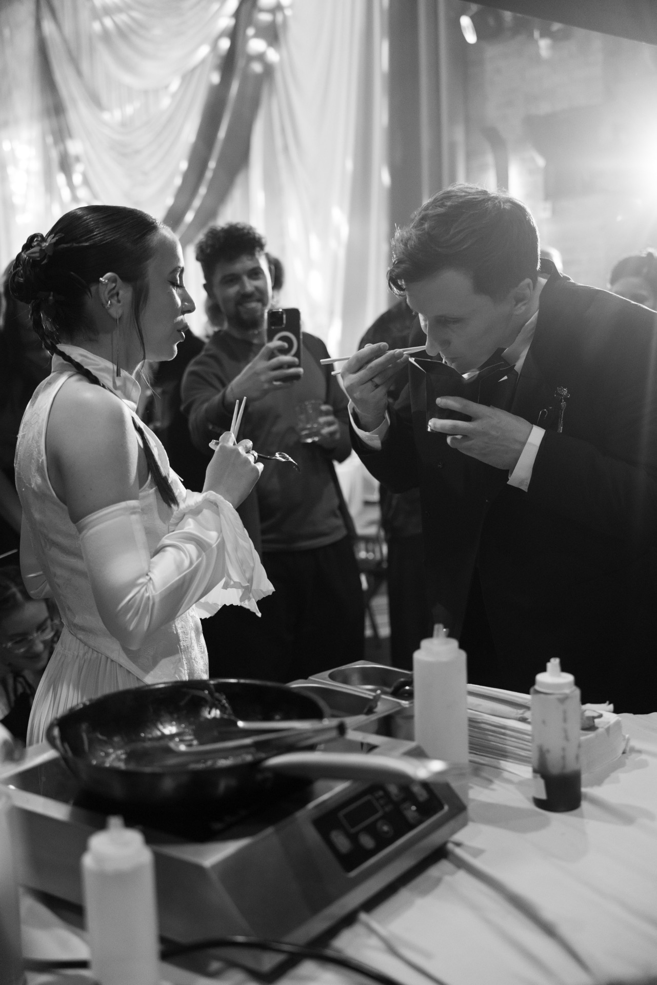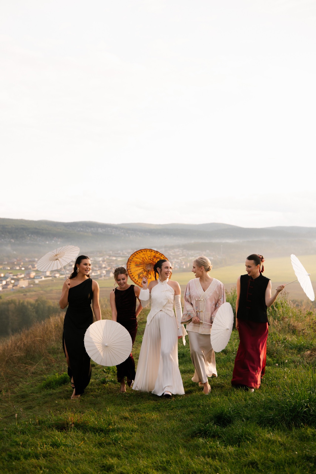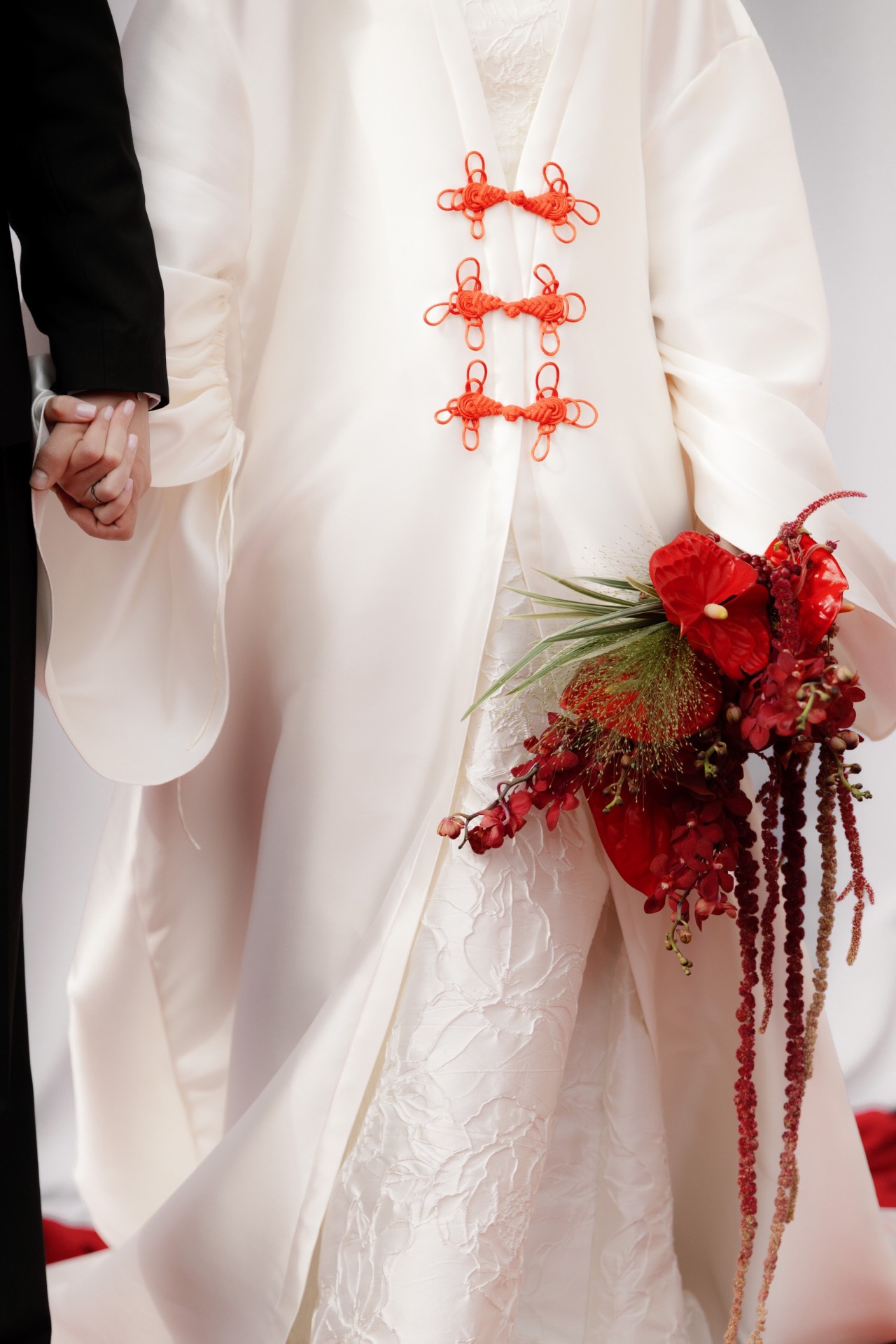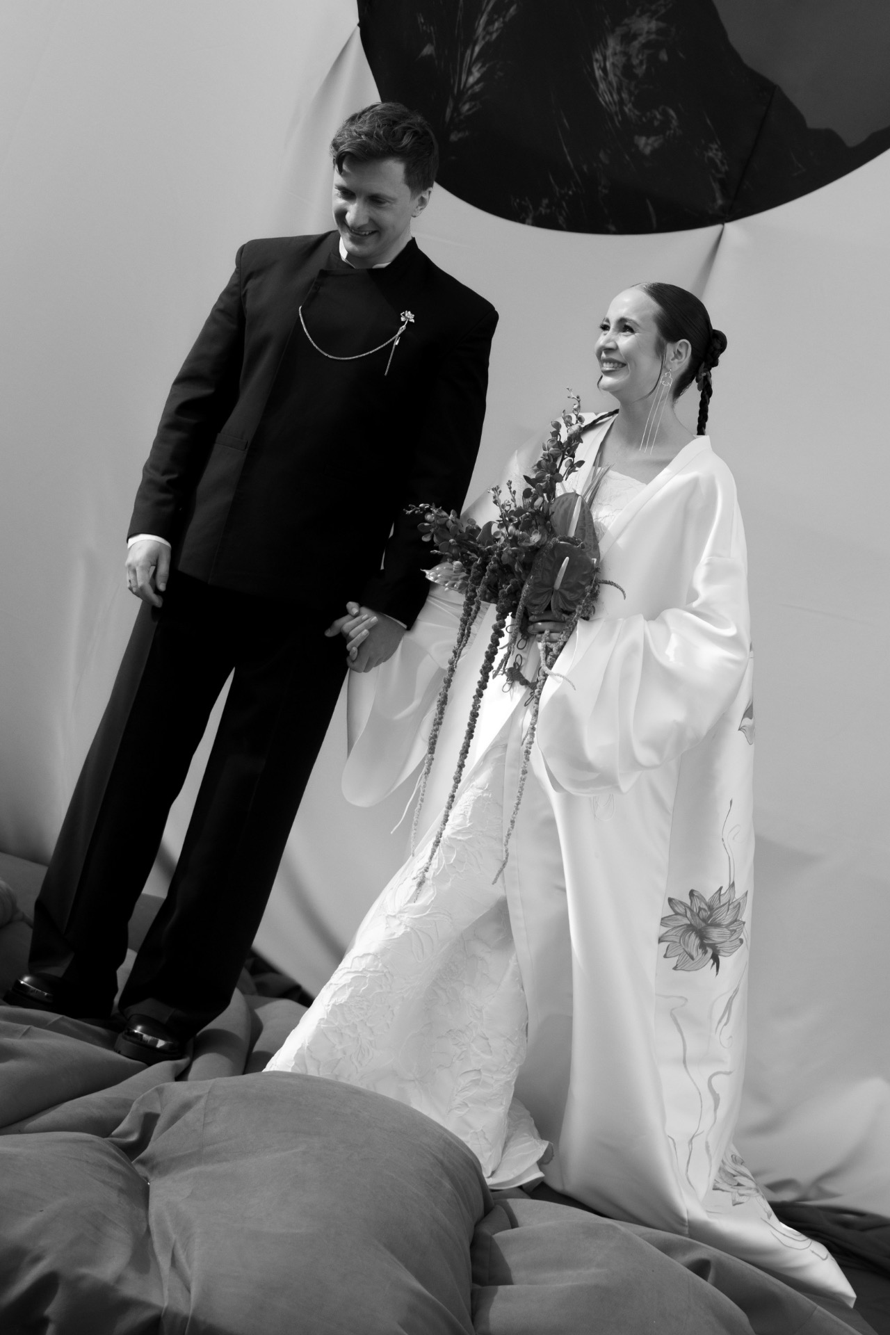 Выбор образов стал для нас одной из самых интересных частей подготовки. Мы понимали, что вписать наряды в нашу азиатскую концепцию будет непросто, поэтому обратились к стилисту Асе Гимбатовой. Она сопровождала нас на всех этапах — от фотосессии и регистрации до основного торжества.