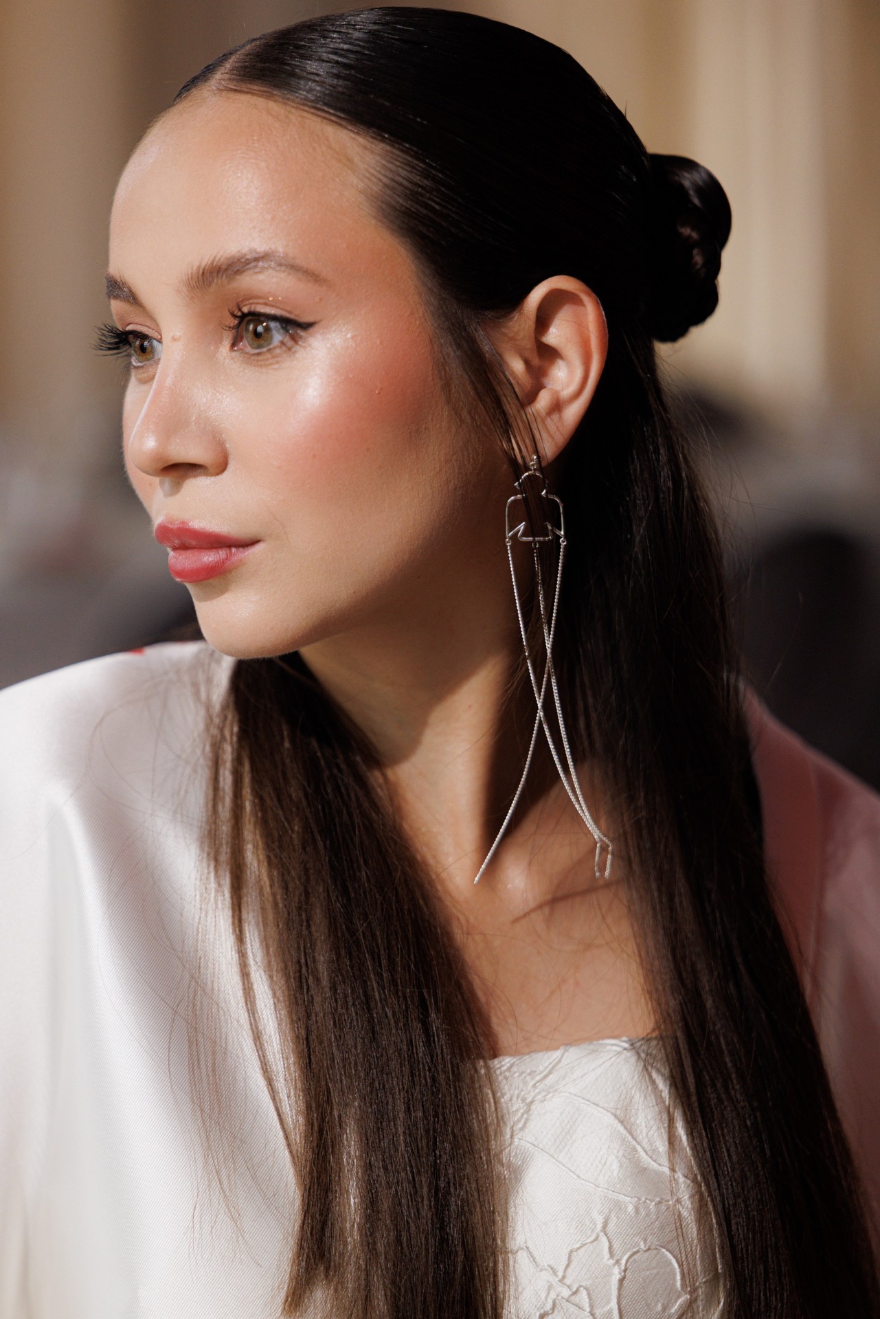 В качестве утреннего образа мы выбрали гофрированные брюки, блузу в китайском стиле и съёмные рукава — комфортный, подвижный образ, в котором можно и танцевать, и свободно перемещаться.