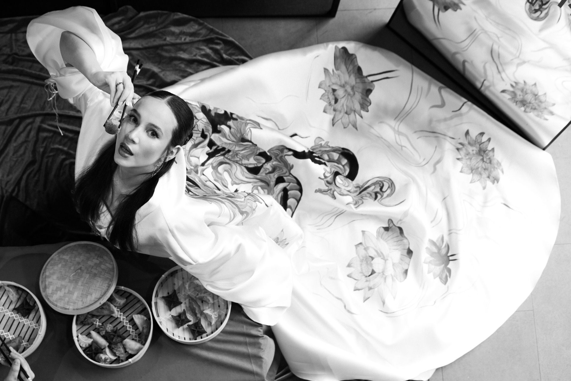 Для банкета я остановилась на более классическом силуэте, но ткань с цветочным жаккардовым рисунком мягко возвращала весь образ к азиатской теме.