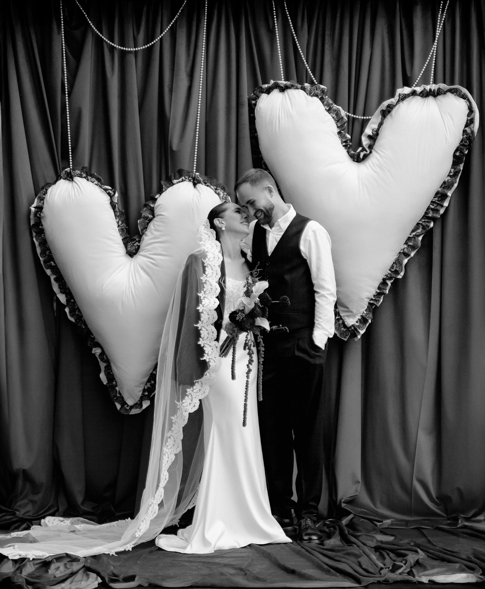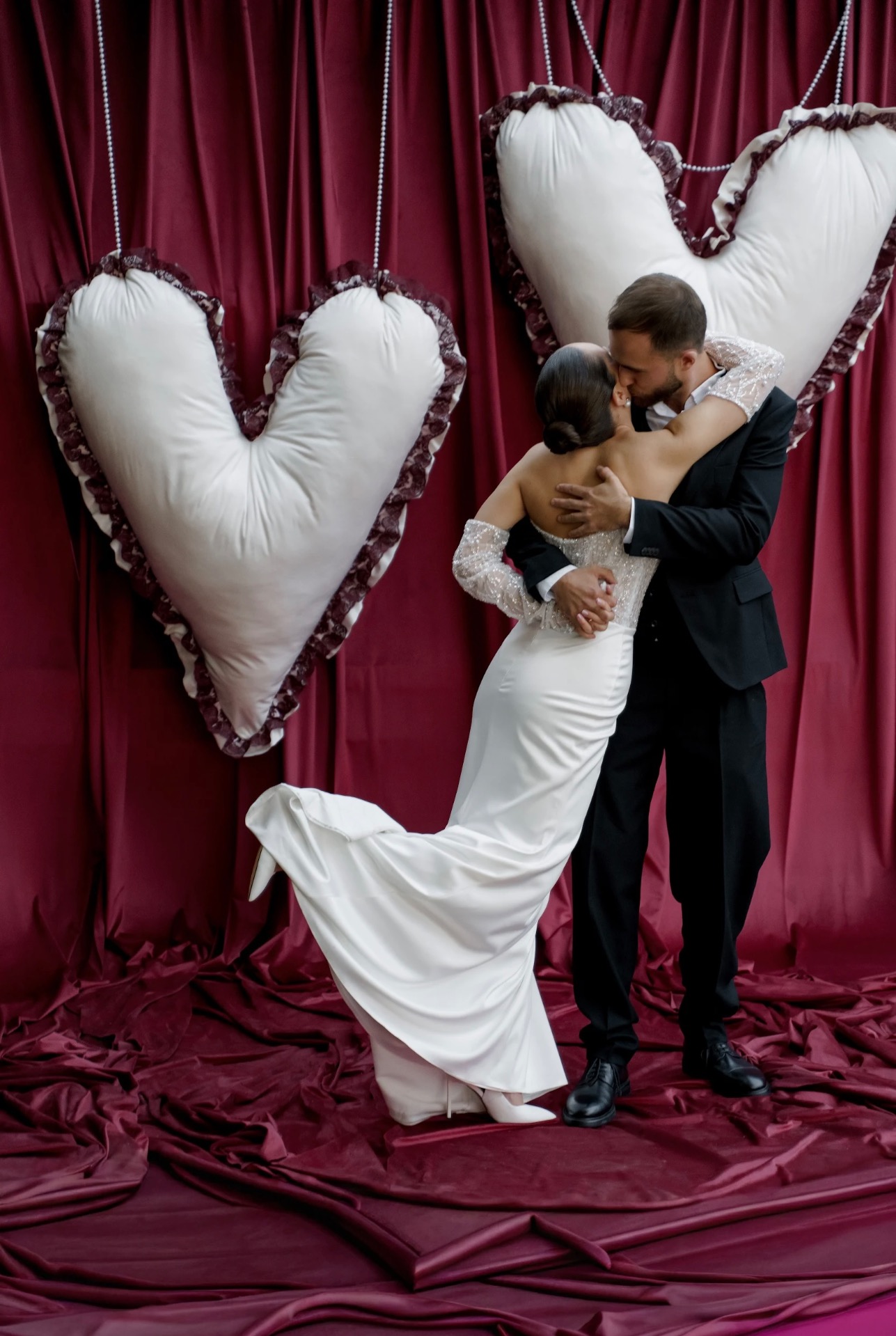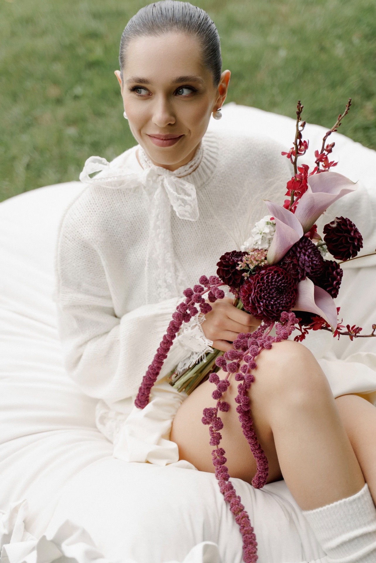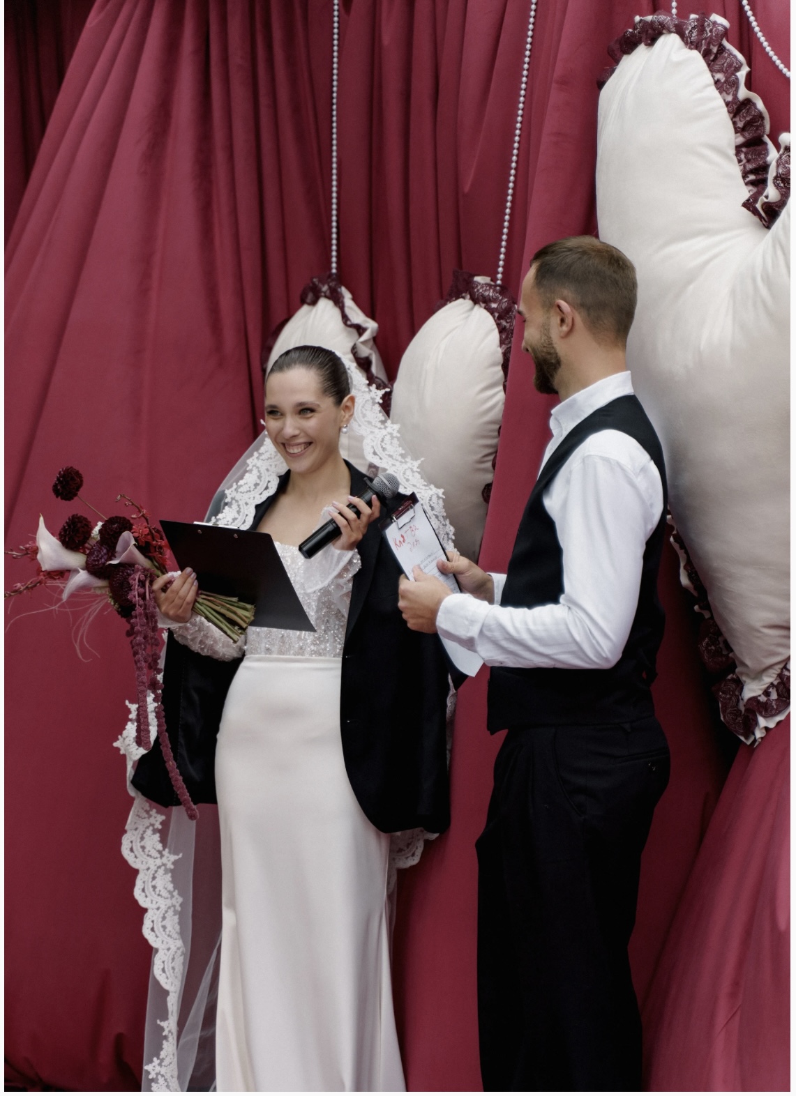 С цветовой палитрой мы определились единогласно и остановились на бордовых оттенках, ведь осеннее торжество и этот цвет так идеально перекликаются с красками природы. В процессе обсуждения она также предложила использовать в качестве акцента на выездной регистрации мягкие сердечки. Всё складывалось наилучшим образом — эта концепция полностью отражала нас. Мы были в восторге от неё даже на этапе подготовки, а вживую всё получилось и вовсе потрясающе!