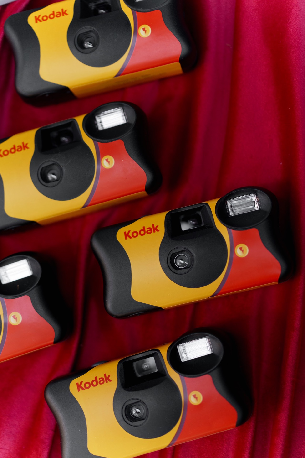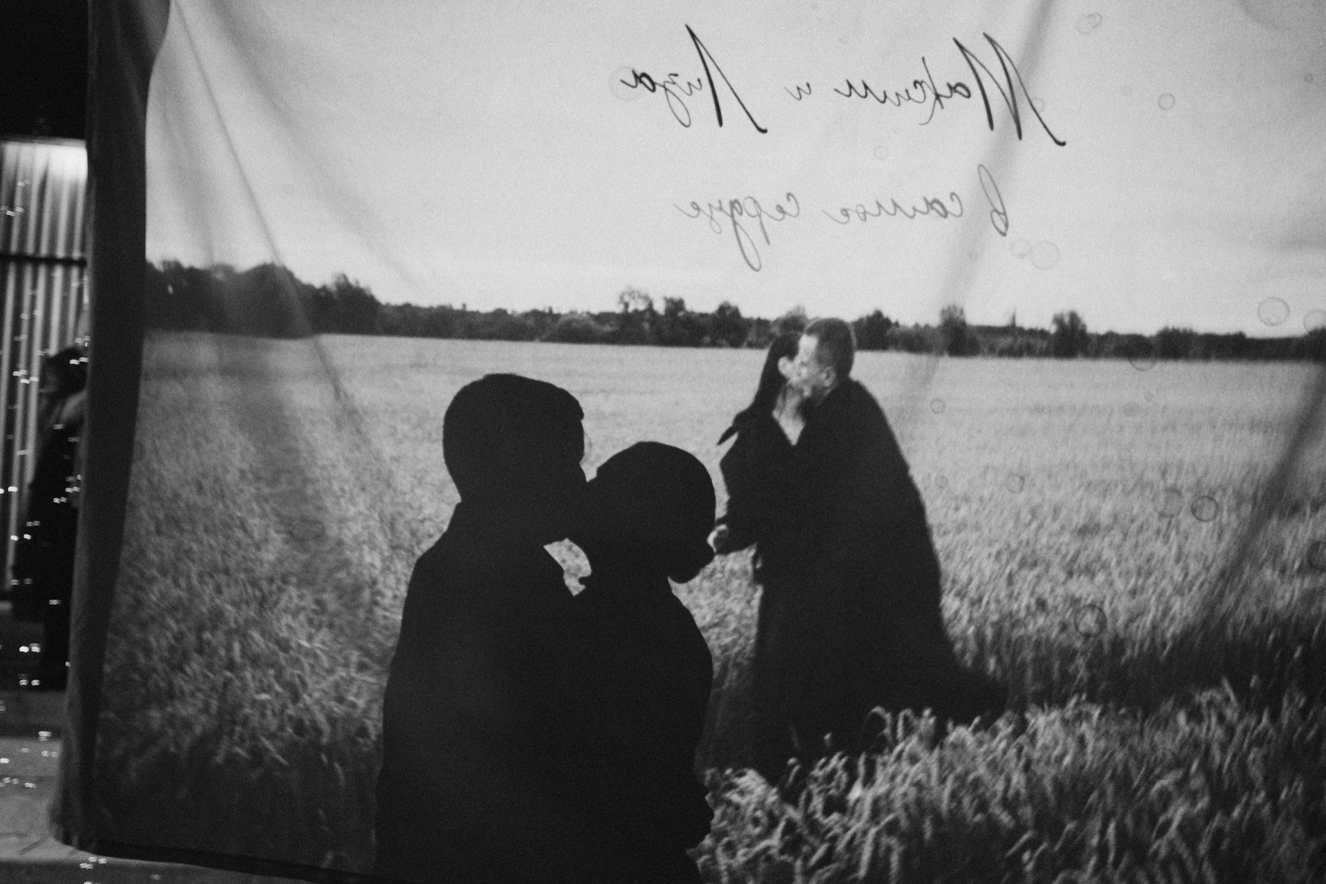 В welcome-зоне был организован бар, а названия коктейлей отсылали к важным моментам нашей жизни. Вместо книги пожеланий мы выбрали картину, на которой гости могли оставить тёплые слова и вклеить фото, снятые на Полароид. Также у гостей была возможность фотографировать весь день на плёночные фотоаппараты.
