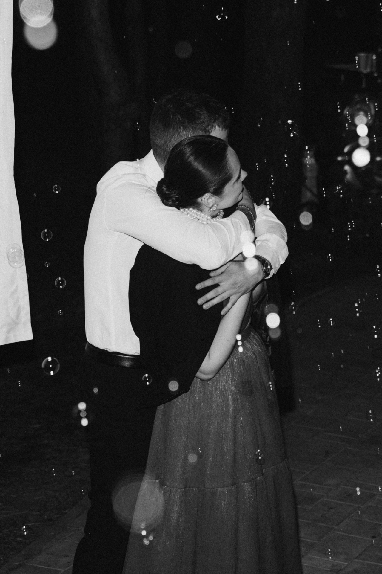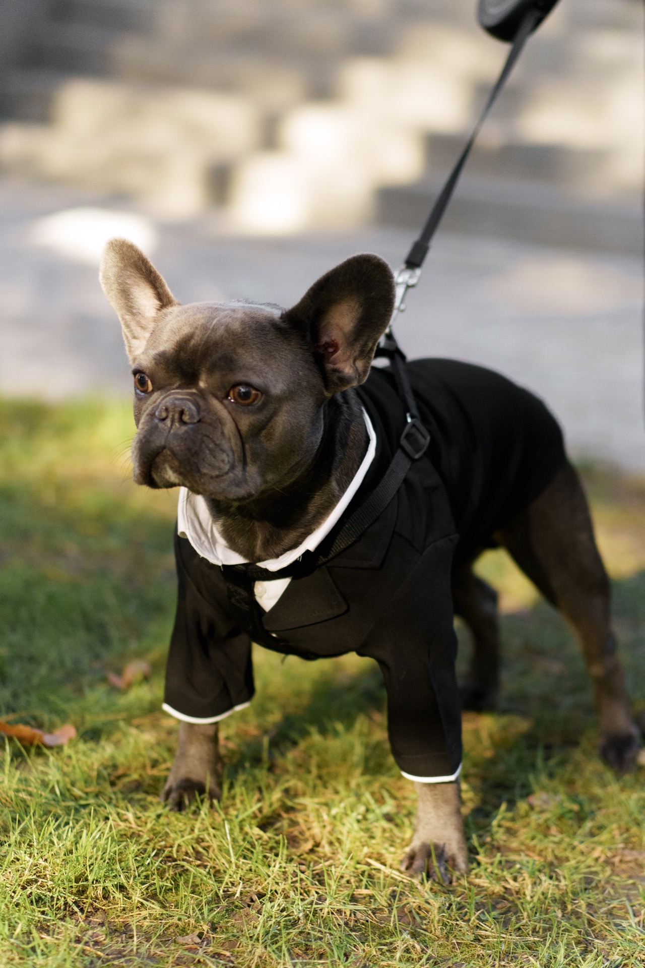 Образ жениха был более лаконичным: классический чёрный костюм. В финале вечера он остался в белой рубашке и брюках.