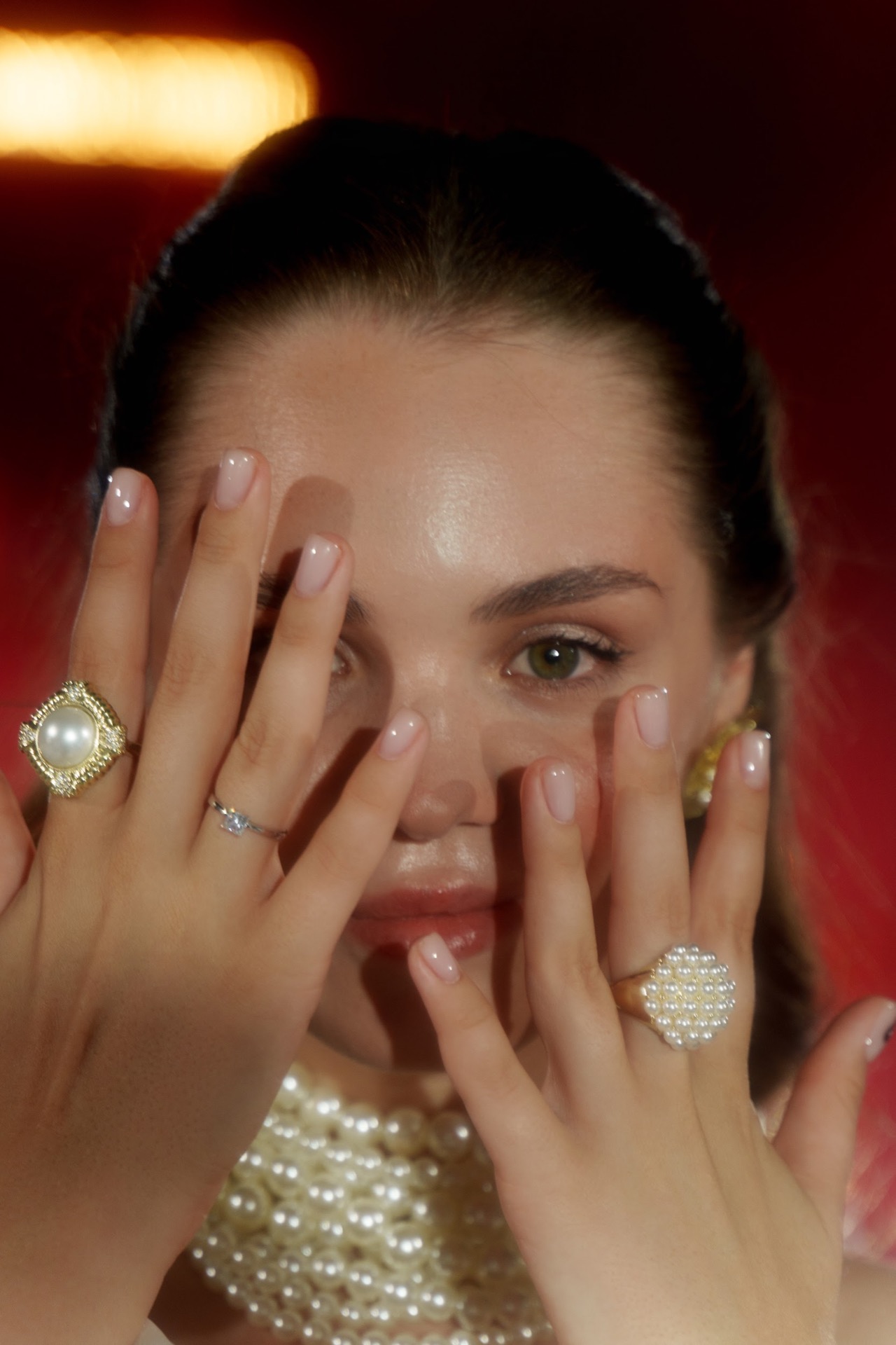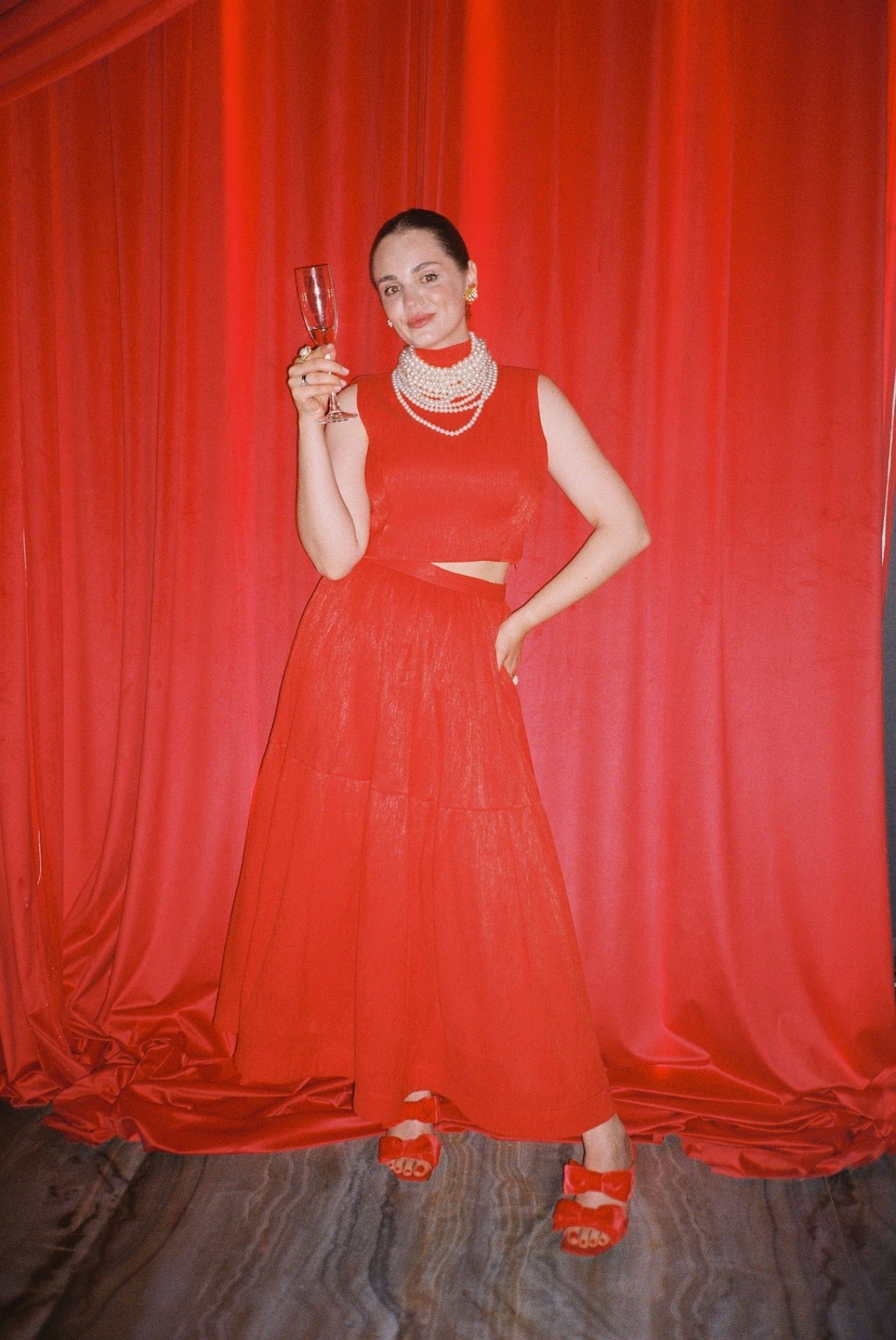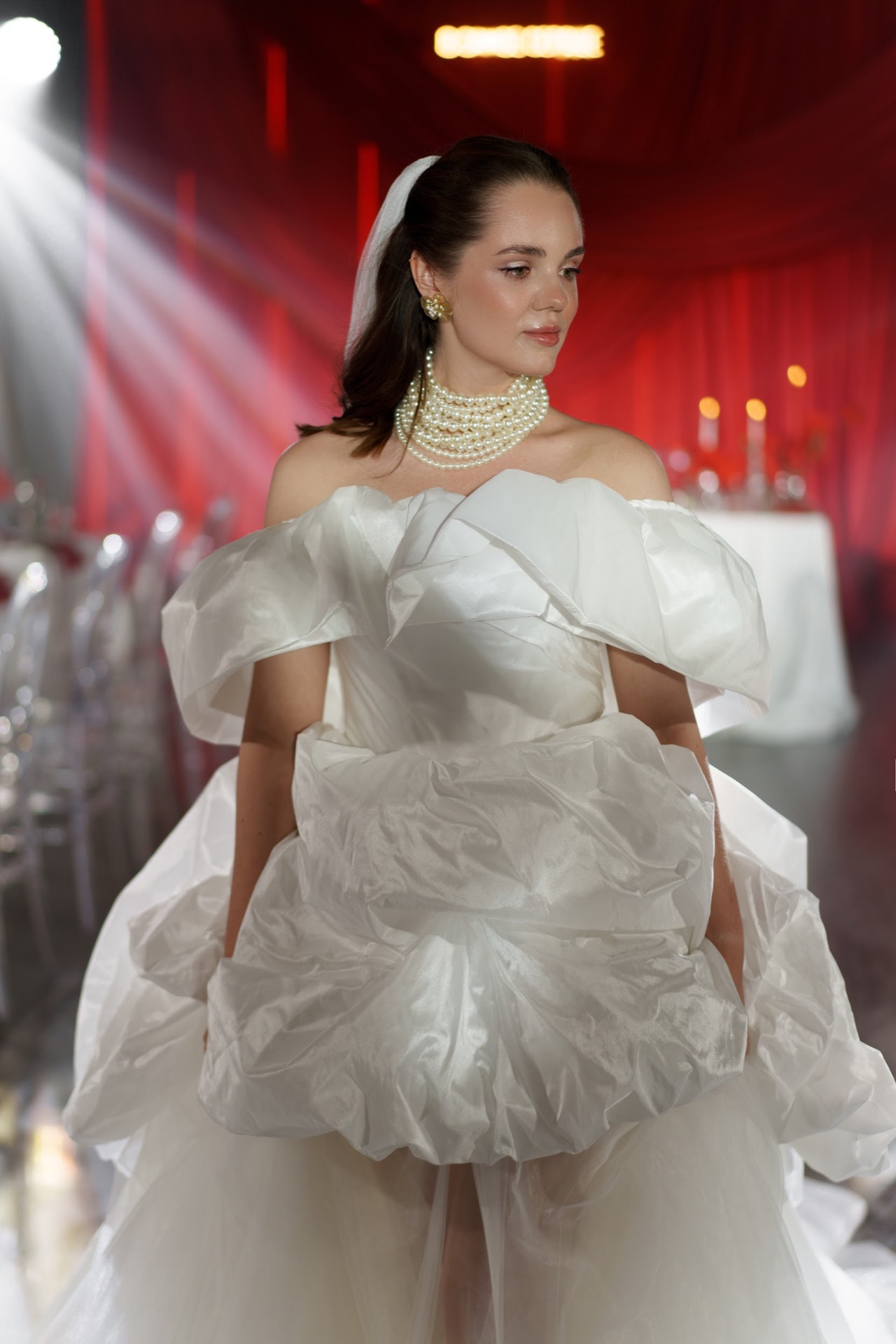 У меня было три образа. Утро началось с гладкого пучка, жемчуга и простого, лаконичного чёрного костюма — юбки и топа. Затем было свадебное платье-трансформер, в котором я могла показать всю воздушность и игривость своего характера. На церемонии образ дополняла фата. После первых тостов я сняла массивные юбки и осталась в коротком белом платье. На финальную часть был заготовлен третий образ — гладкий пучок и огненно-красный костюм (юбка и топ) с жемчужными акцентами.