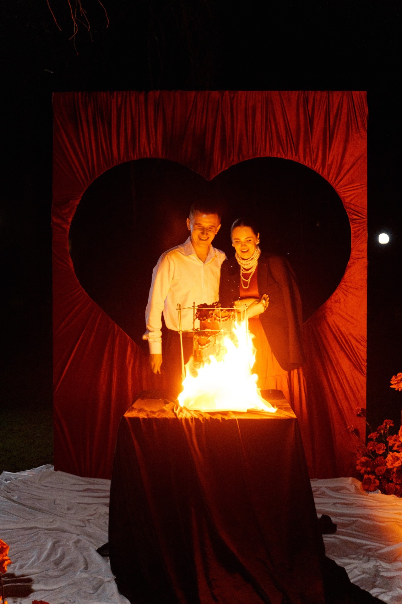 Вечер завершился эффектным трёхъярусным красным тортом в стиле «Ламбет», он был не только красивым, но и горящим! После этого — бенгальские огни, просмотр видео на проекторе и благодарственные титры с упоминанием всех гостей и команды под песню Сергея Лазарева «В самое сердце».