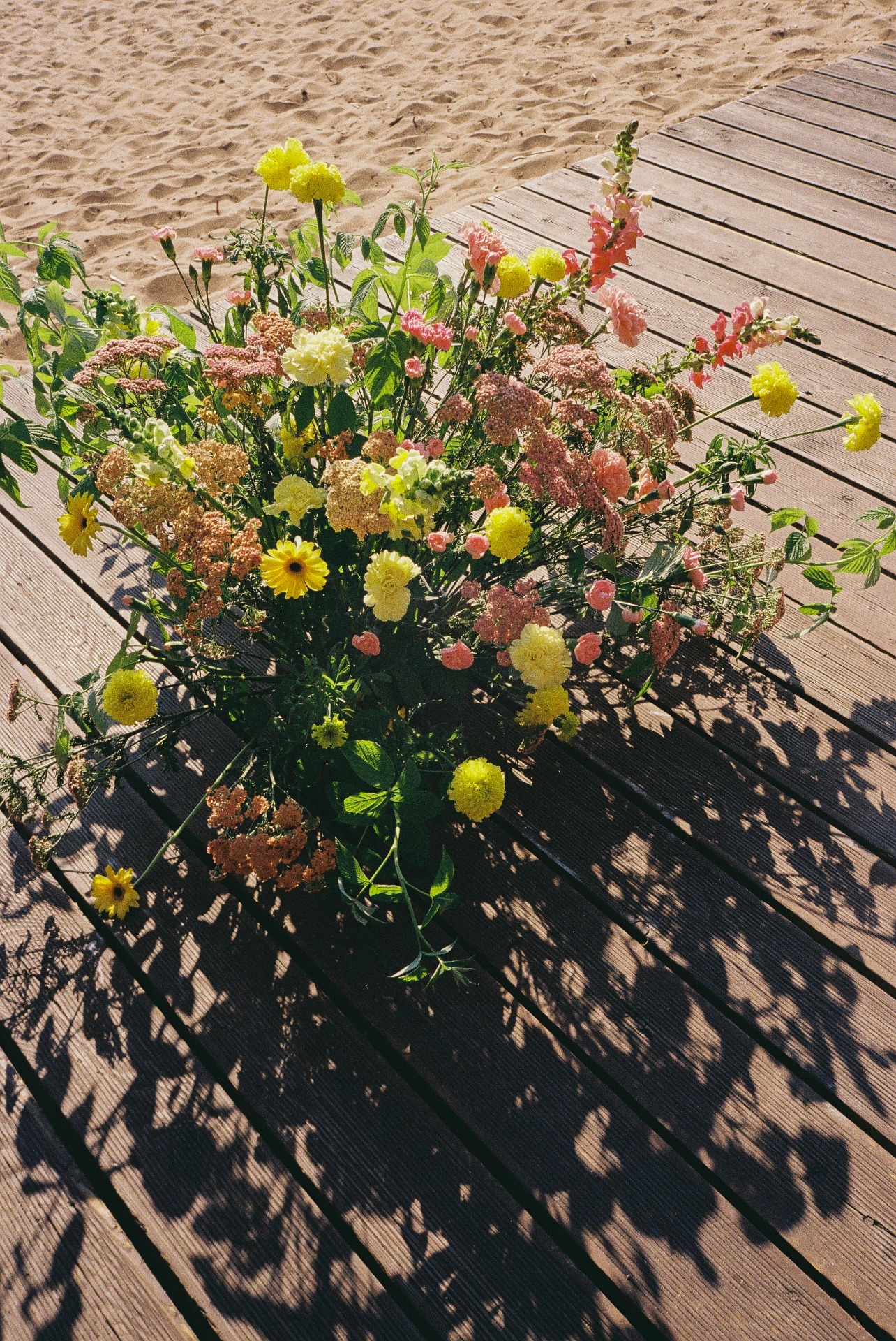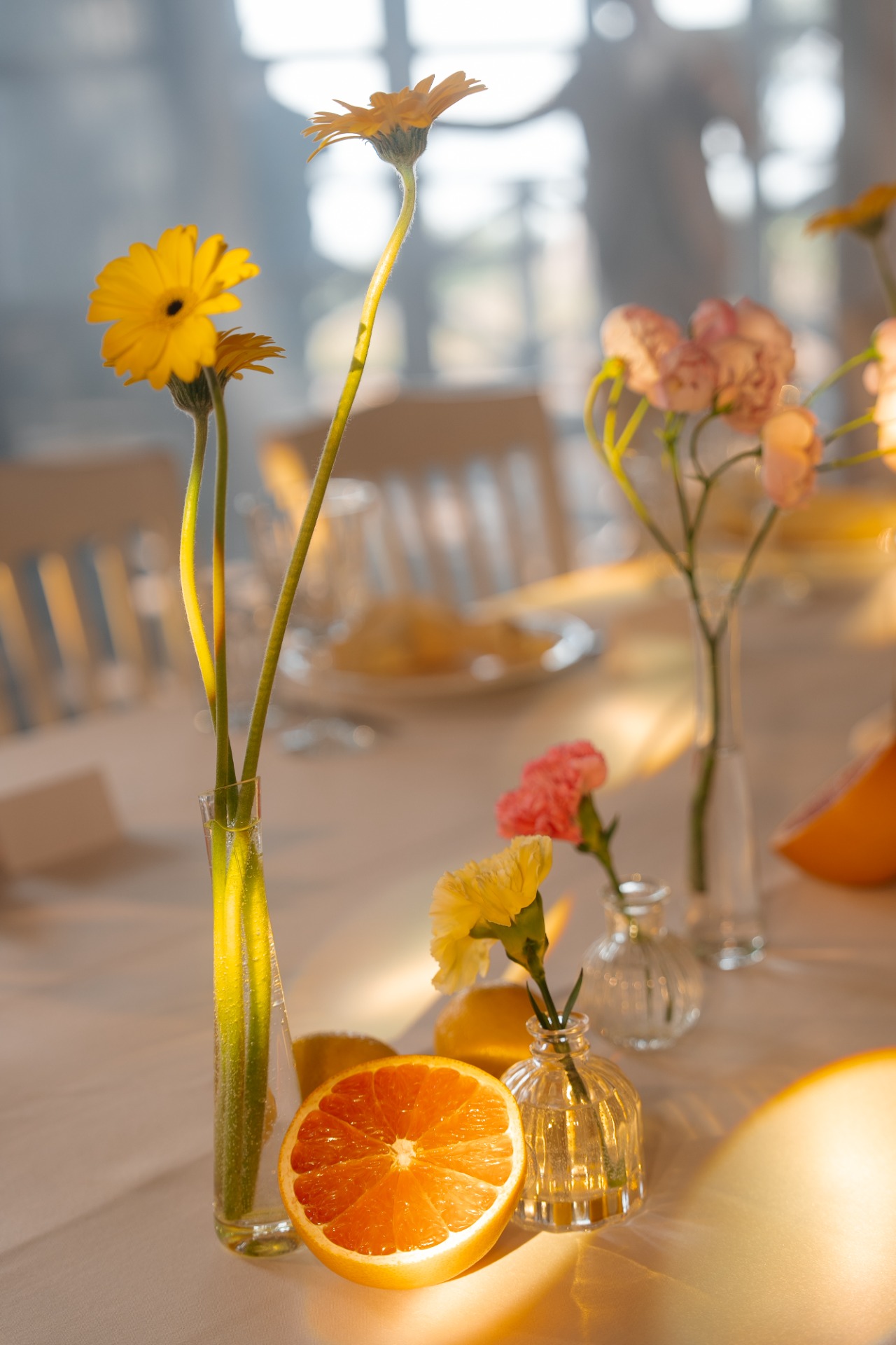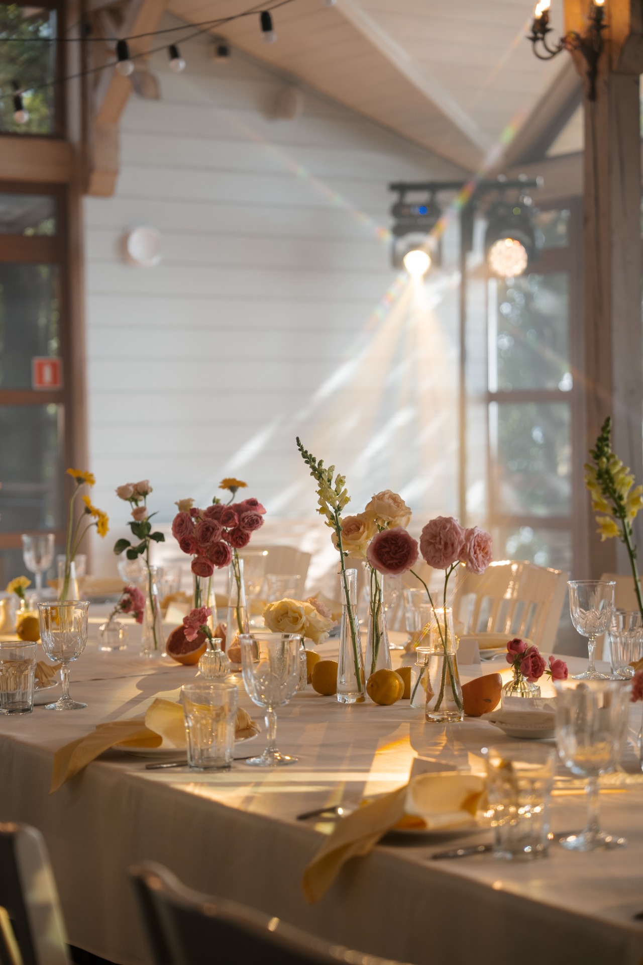 В декоре мы использовали мои любимые садовые цветы: георгины, розы, диантусы, эустому и дельфиниум. Все они были в ярких оттенках. А на столах мы разложили лимоны и грейпфруты, чтобы добавить свежести.