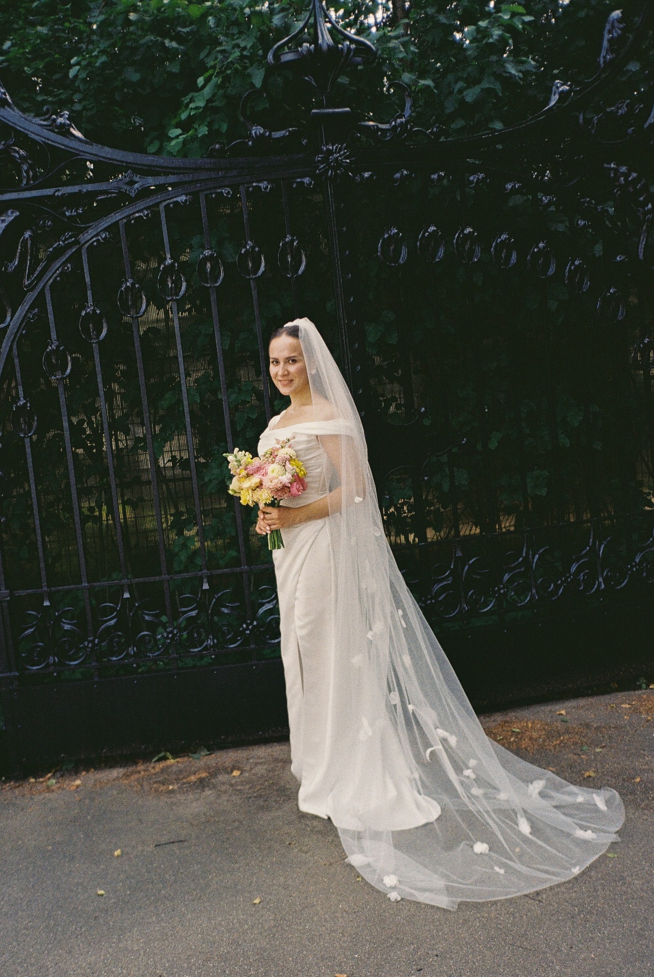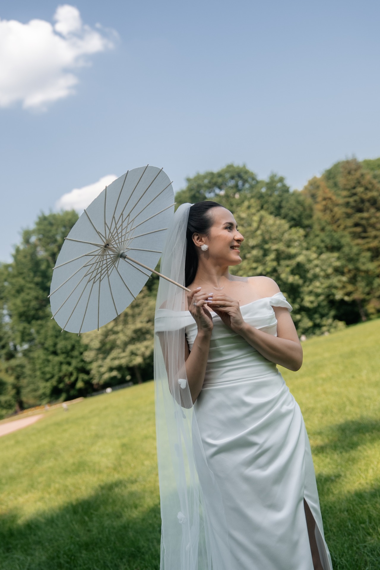 Особой деталью образа стала фата ручной работы с вышитыми цветами и бабочками. Из украшений к своему наряду я добавила серьги и подвеску на тонкой леске.