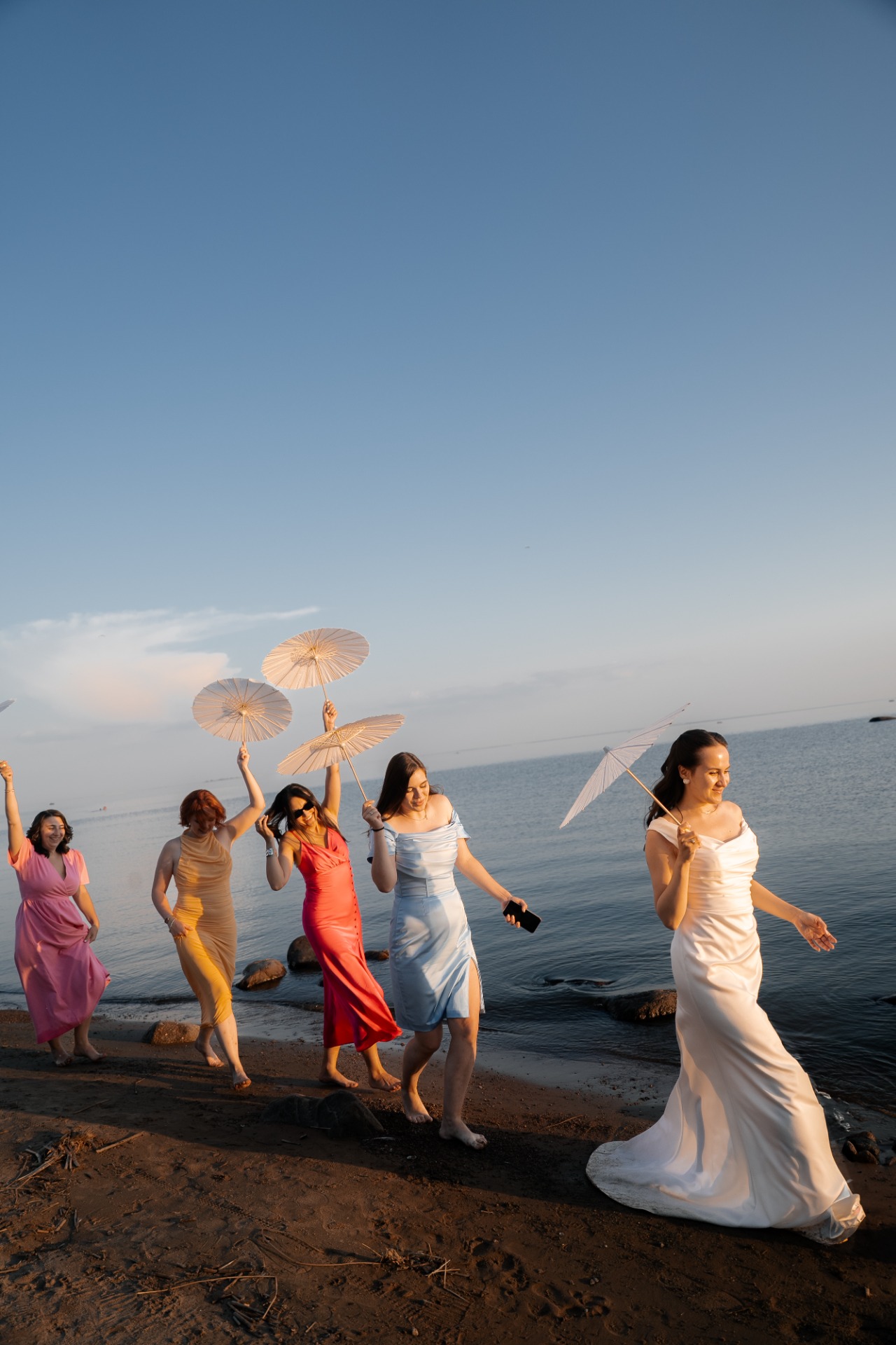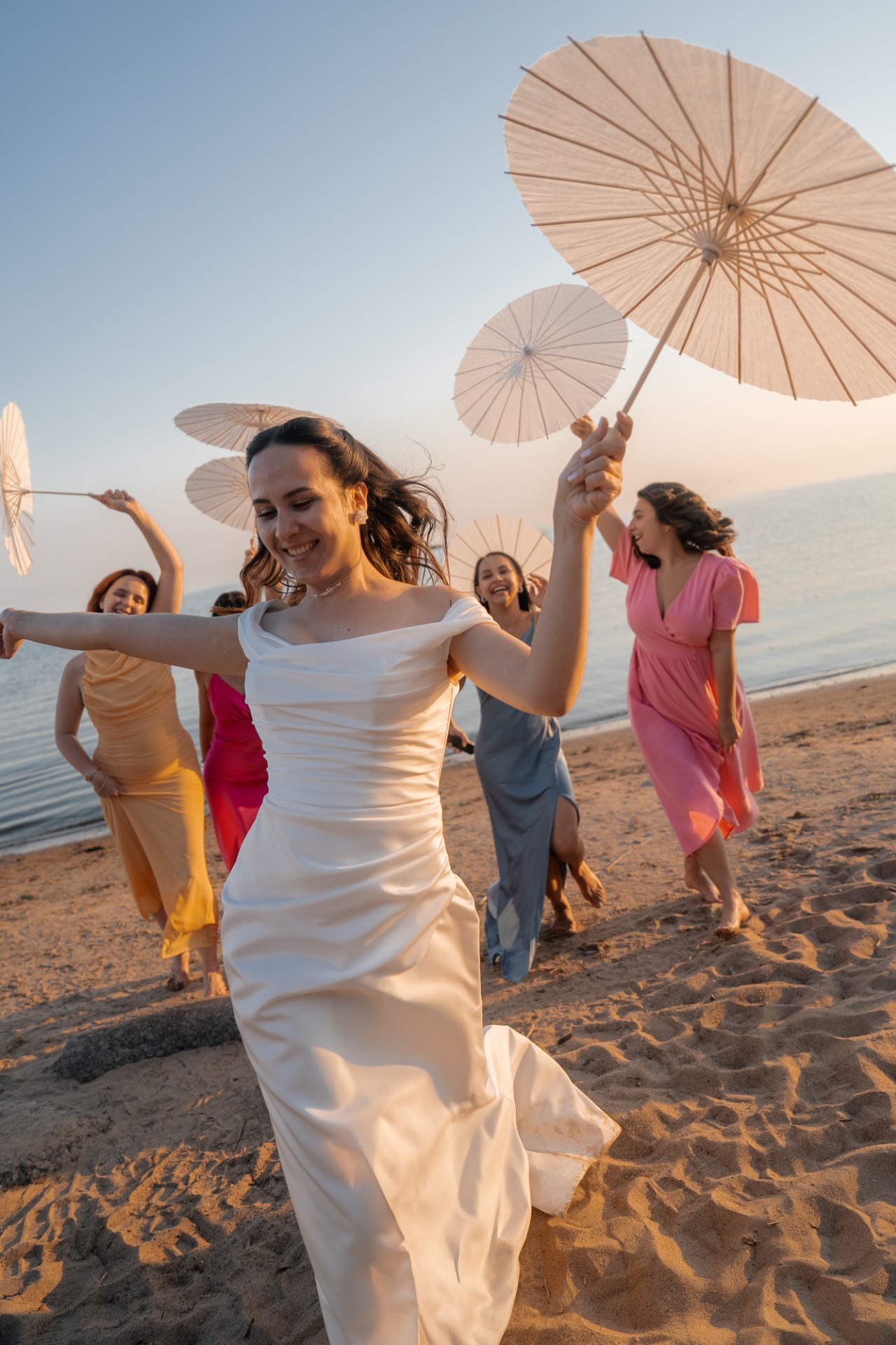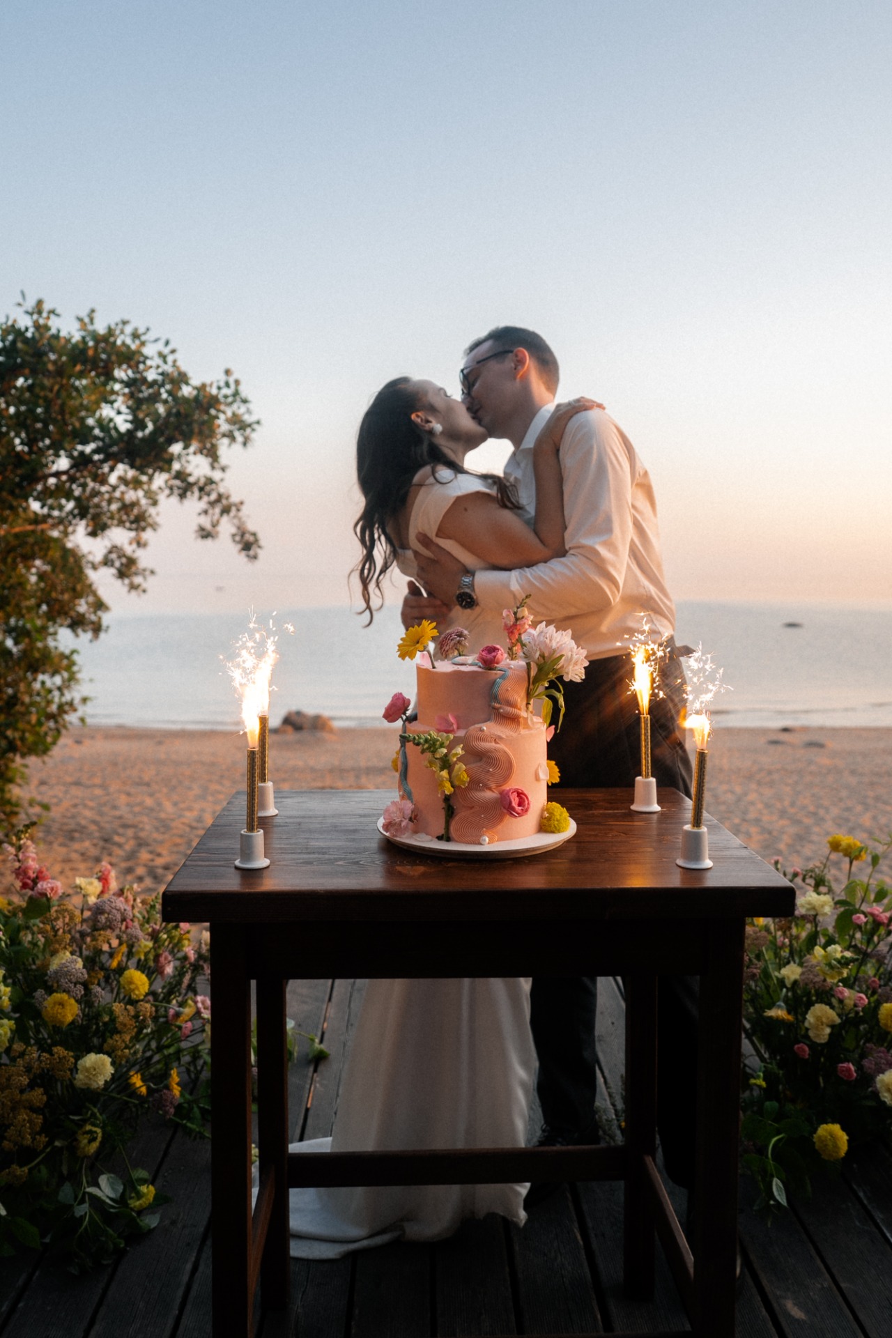 Даже дресс-код мы сделали ярким: каждая моя подруга, мама, сестра и свекровь выбрали свой оттенок, и в итоге получилось очень красиво и сочно. Торт тоже был украшен цветами, и момент его выноса совпал с часом заката — это создало невероятную атмосферу тепла и уюта.