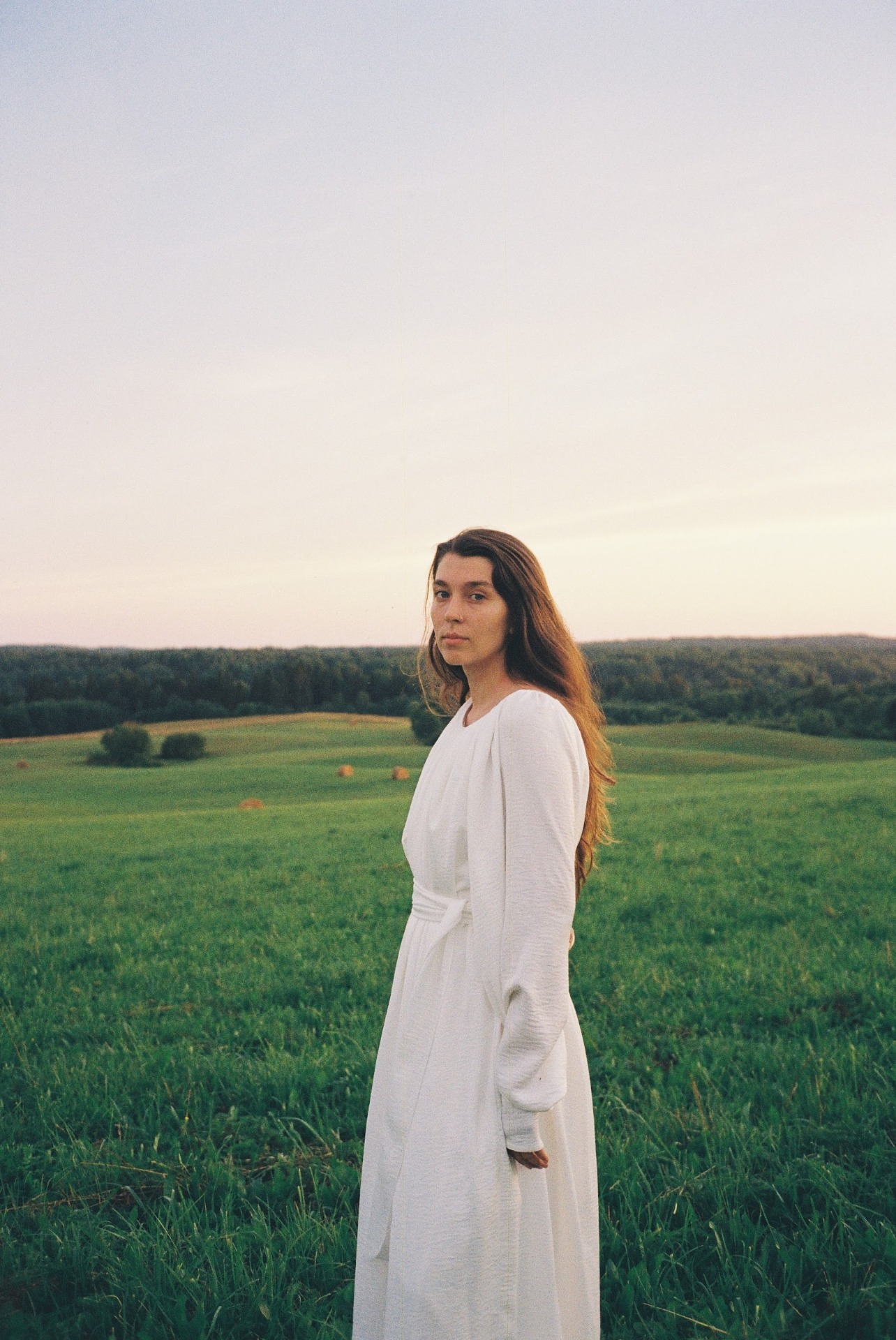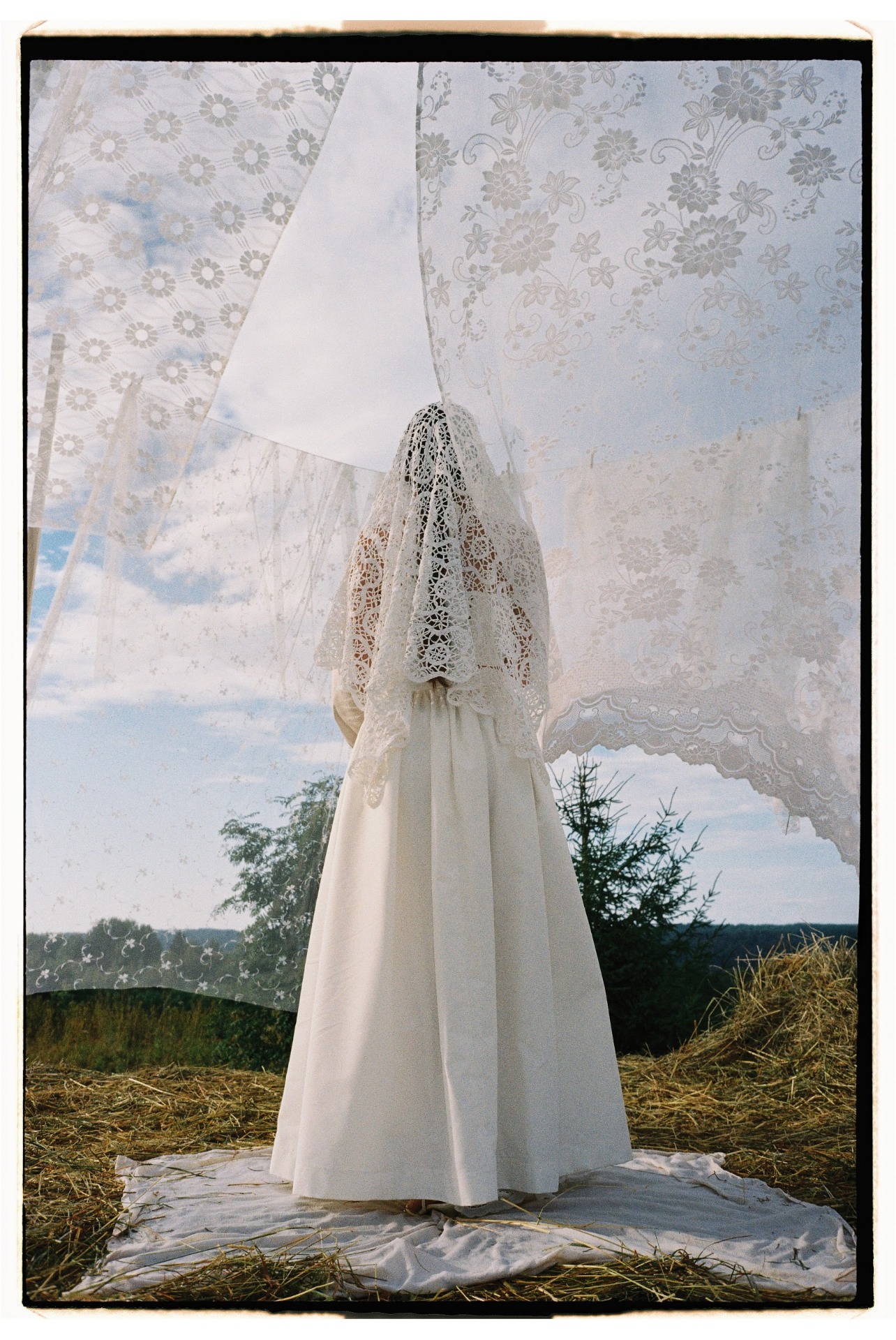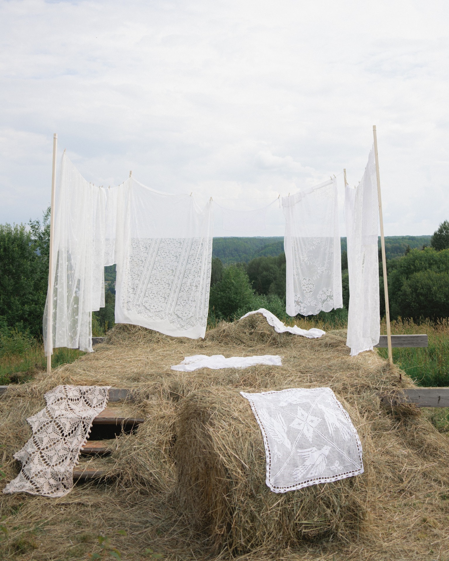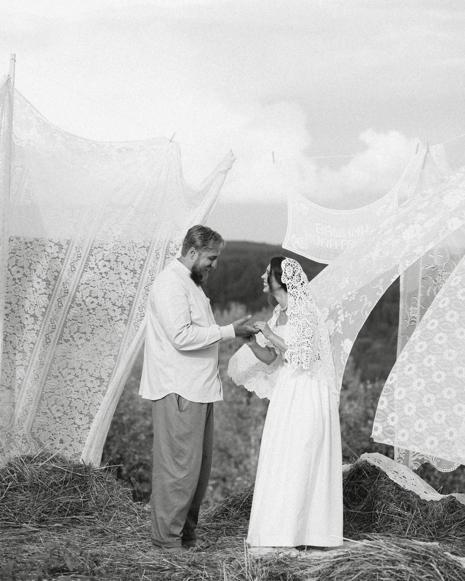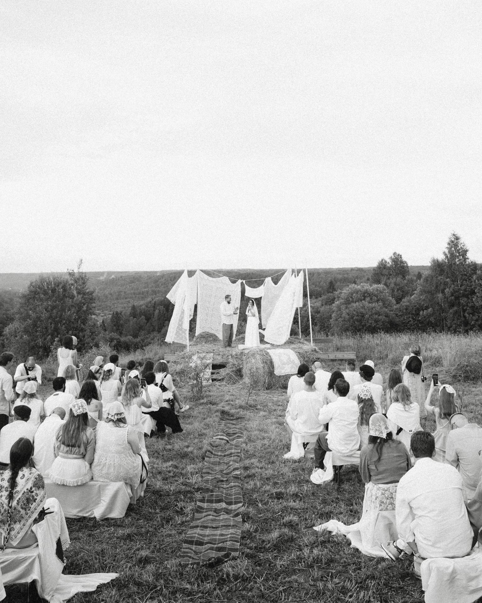 Для церемонии мы выбрали помост в чистом поле с видом на леса. В декоре мы разместили льняной текстиль, сено, вязаные напероны — всё это стало отражением «банности» нашего праздника.
