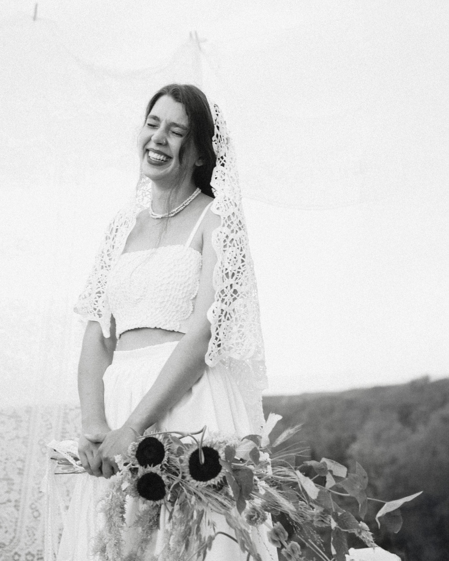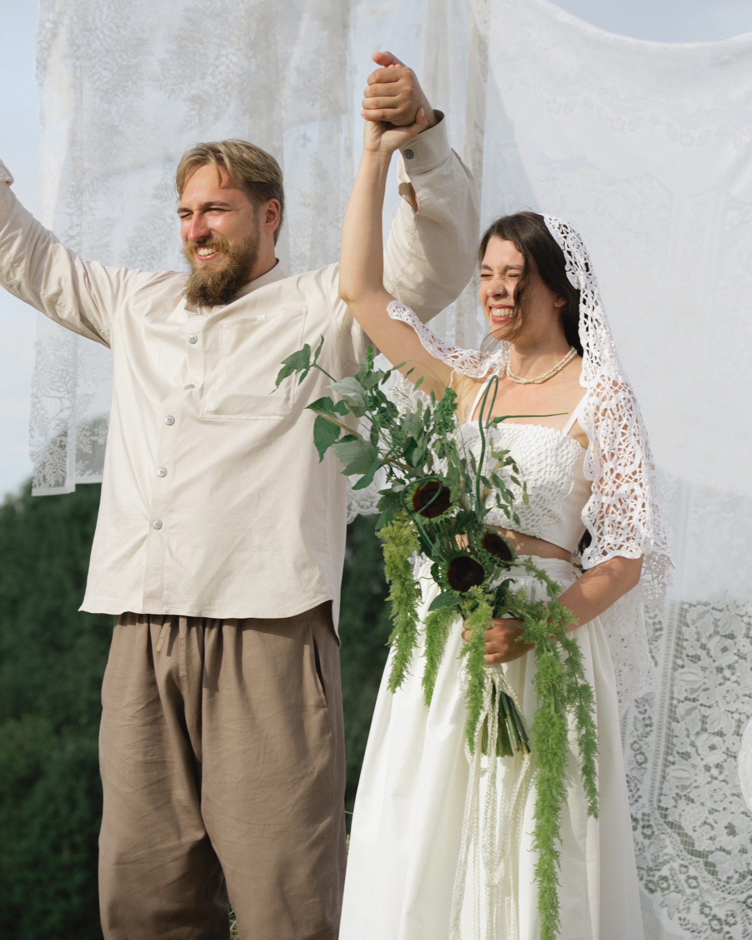 Для себя я выбрала два образа. Утром и на обряде выкупа я была в многослойном традиционном наряде с поясом, который символизировал связь поколений. На саму церемонию я переоделась в более современный вариант: юбку с кружевным подъюбником и ажурный топ. Дополняла наряд фата, которую Иван нашёл в винтажной лавке.