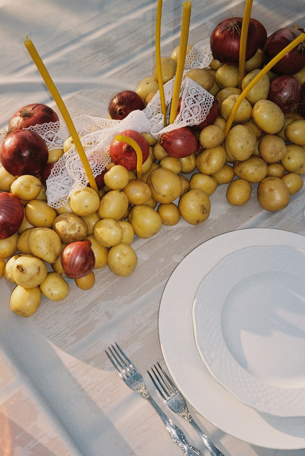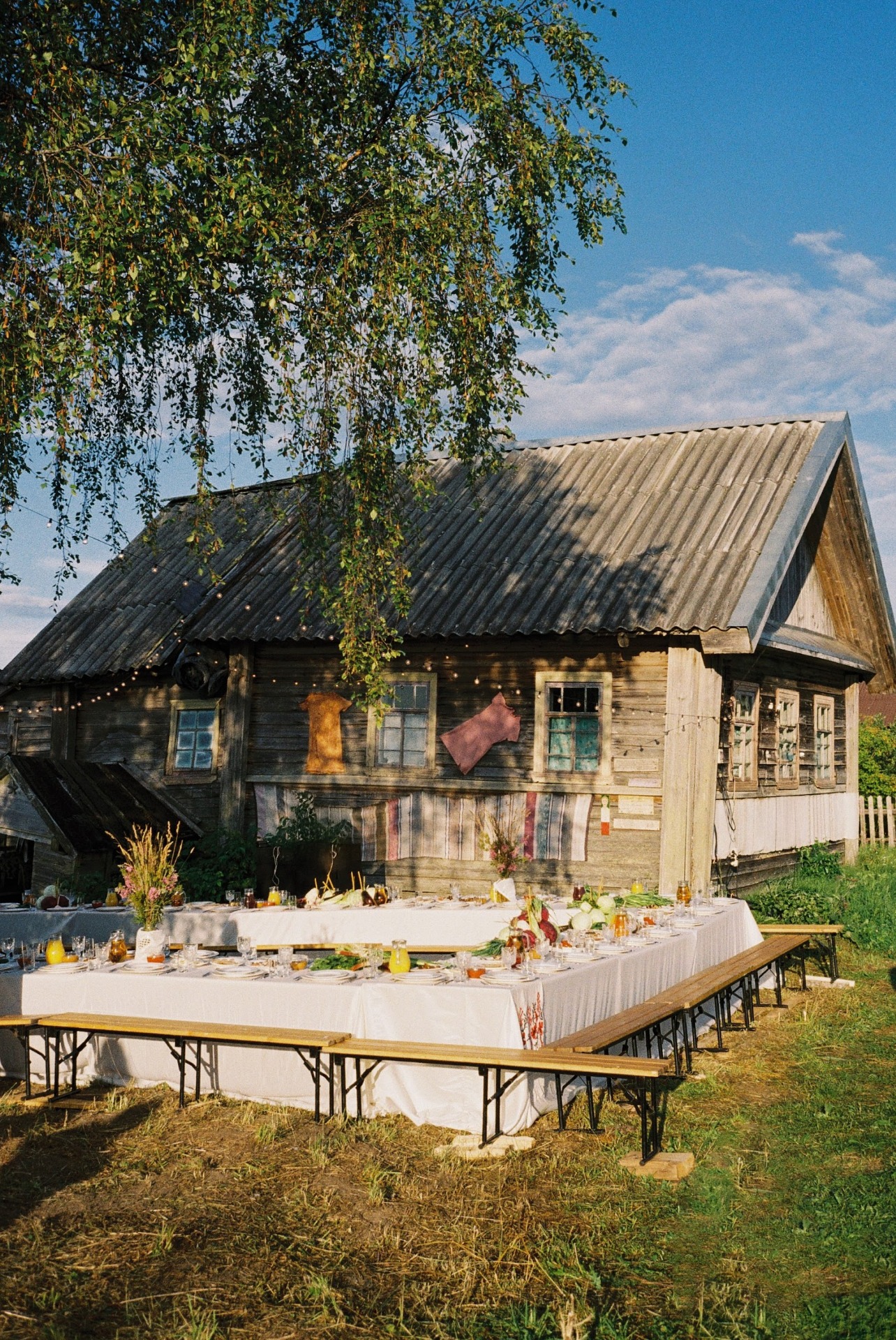 Застолье мы устроили рядом со старой избой и берёзой, а прямо на столе мы разместили куст смородины. Вместо «идеальной» сервировки были овощи с грядки, кочаны капусты, картошка, натуральные ткани и церковные свечи.