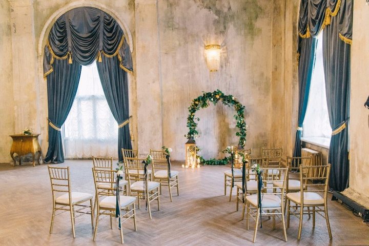 Стиль съемки диктовала выбранная площадка. Но нам хотелось немного отойти от классики, поэтому мы выбрали черное платье невесты и золотые детали в декоре: в полиграфии, в выездной регистрации, в сборах невесты, в оформлении стола. Все было очень роскошно.