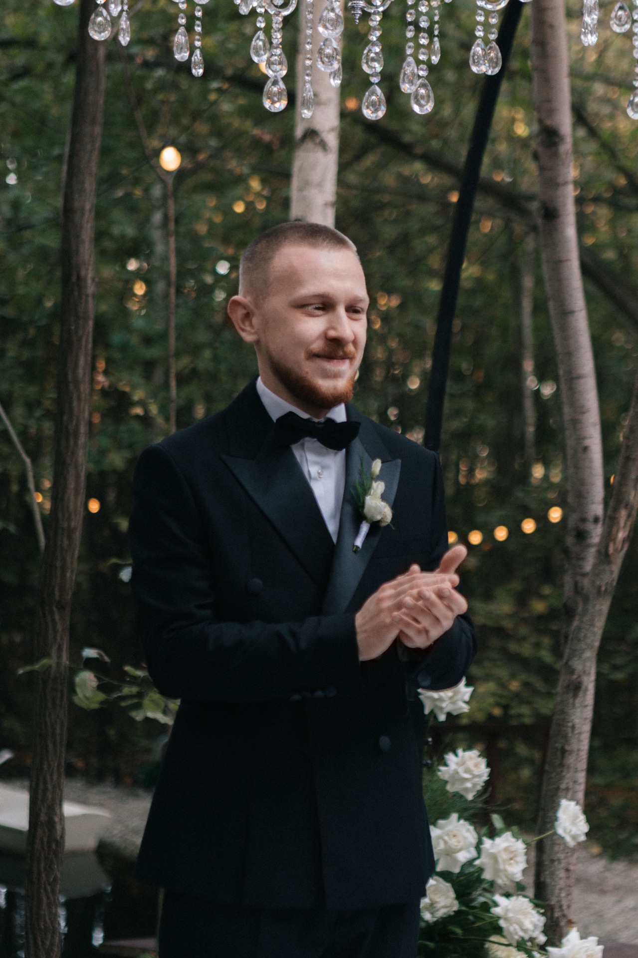 Образ Никиты получился классическим и строгим: чёрные туфли, чёрный смокинг, белая рубашка, бабочка.
