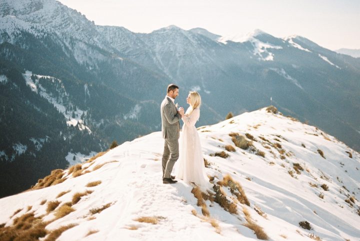 Окружающий нас пейзаж был не ярким и броским, а, наоборот, умиротворяющим и чистым, что чудеснейшим образом дополняло наши чувства. Акцент ставился на образе невесты, которая на фоне белого снега выглядела словно сказочная принцесса. А аксессуары из живых цветов оживили и привнесли в общую палитру теплые тона. Неповторимая атмосфера гор сыграла свою роль: глядя на фотографии, чувствуешь легкий морозный воздух.