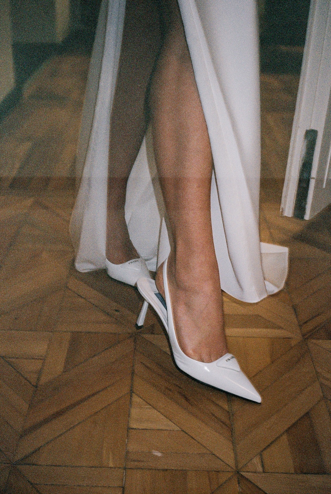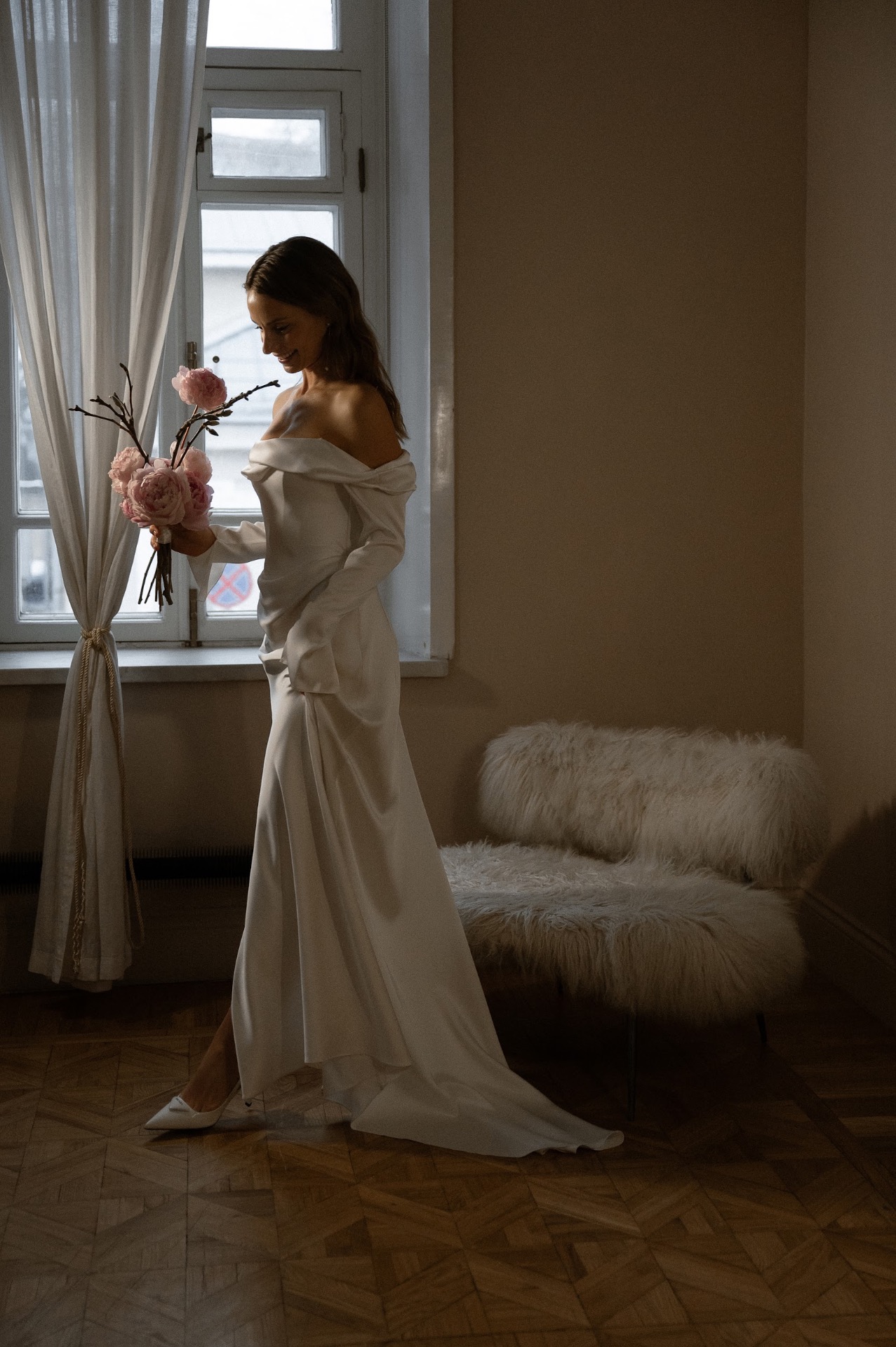 Над образами мы работали вместе с моим стилистом Настей Котовой. Первый образ был дополнен слингбэками Prada и жемчужными комплектом от Lera Treyger. Про букет: я мечтала о нежных лотосах, но был несезон, и Маша из Jungle.Msk создала для меня невероятный архитектурных букет из веточек магнолии и новозеландских пионов, а Настя выбрала оттенок румян под эти пионы. Причёска — мягкие локоны и макияж с эффектом влажной кожи — любовь.