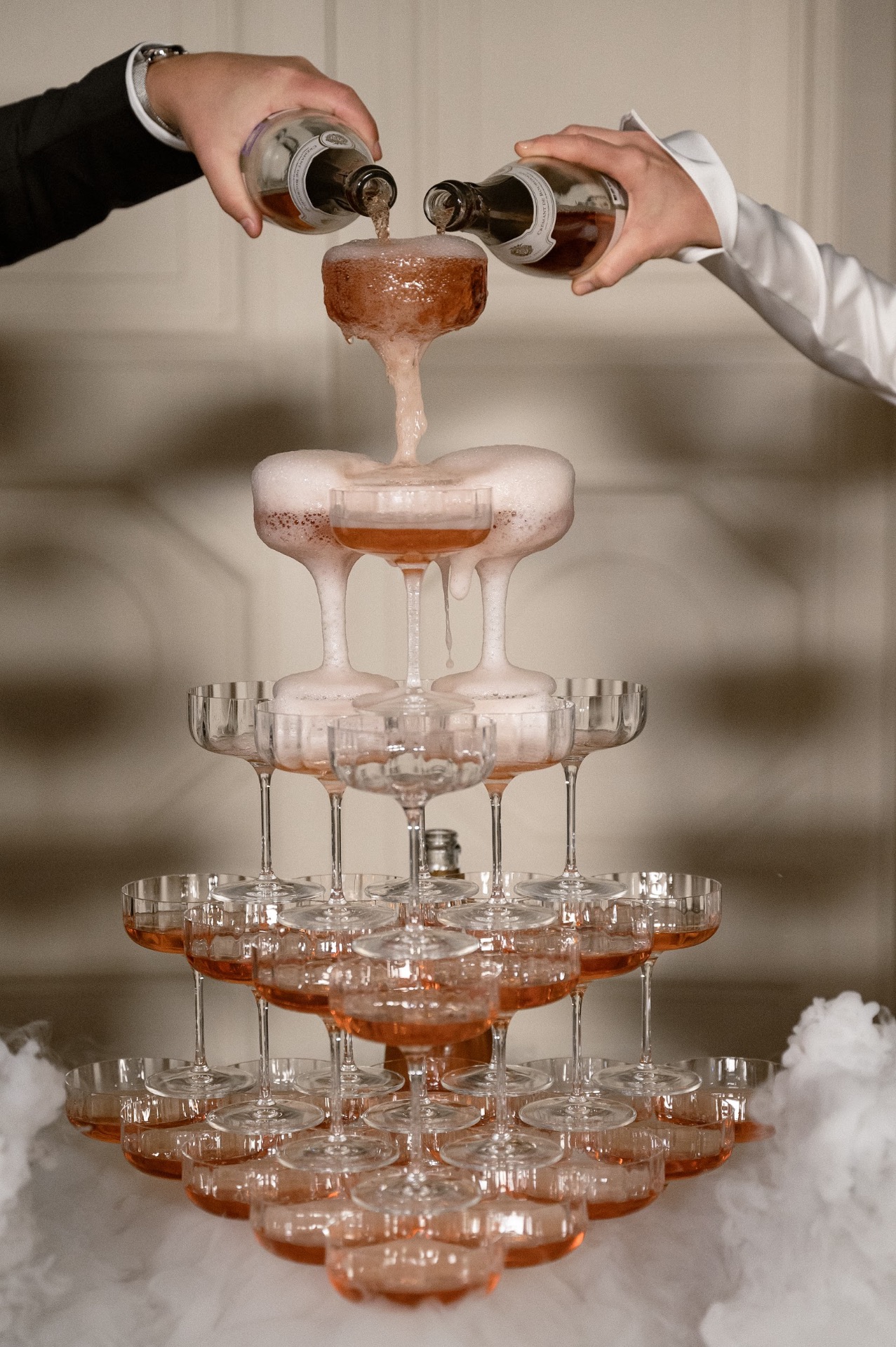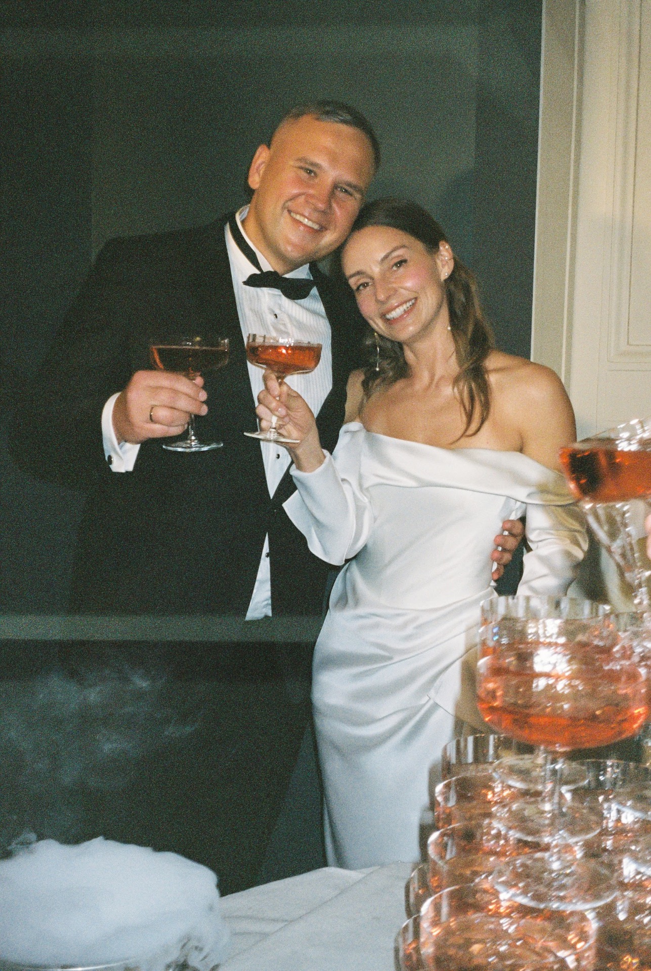Горка с шампанским в усадьбе заменила традиционное шампанское у стен загса, связав воедино две части праздника. Перед тем, как разливать шампанское, мы с Ромой сказали друг другу важные слова вместо клятв. Шампанское разливали под песню L’one — “Весь мир для нас”.